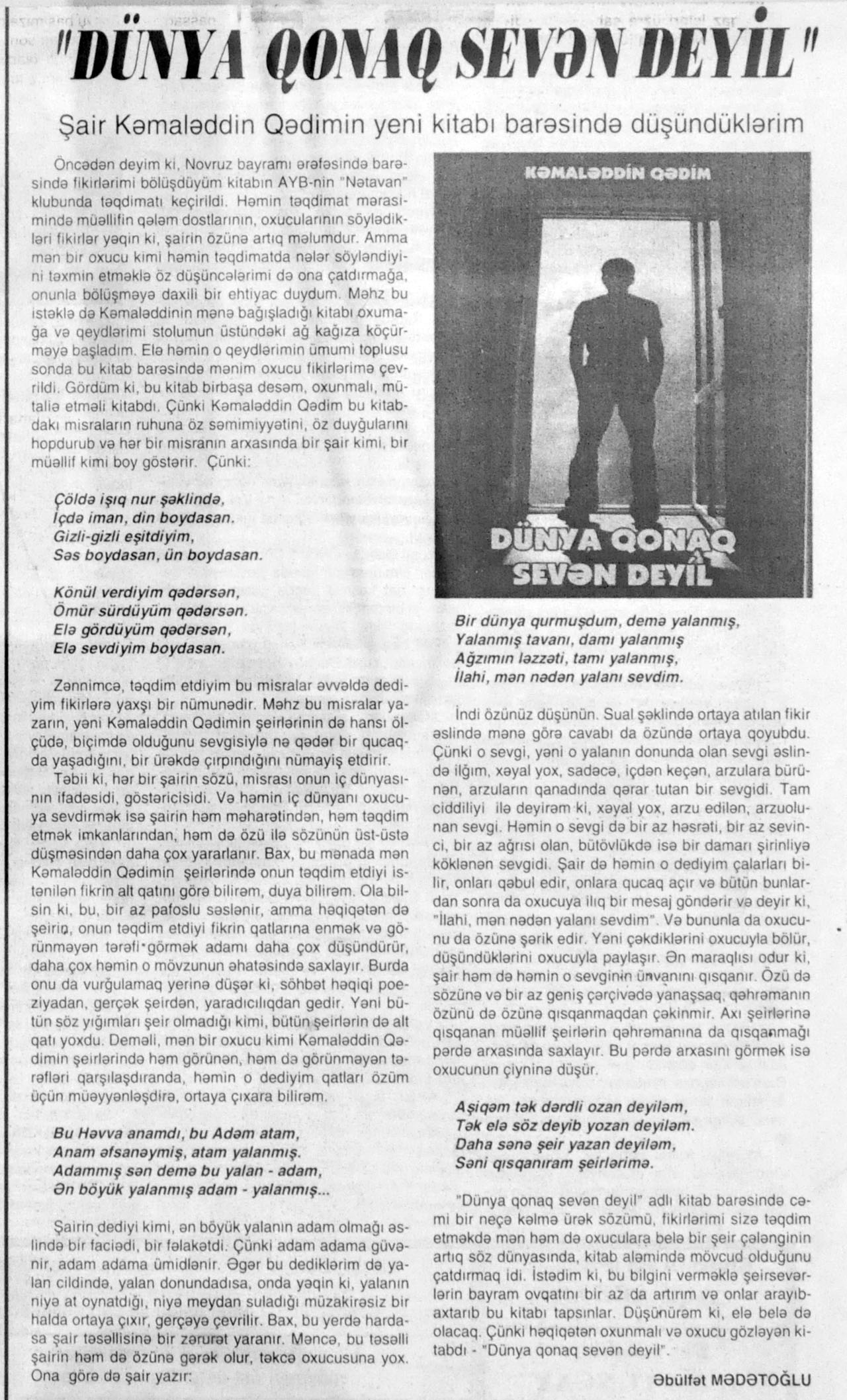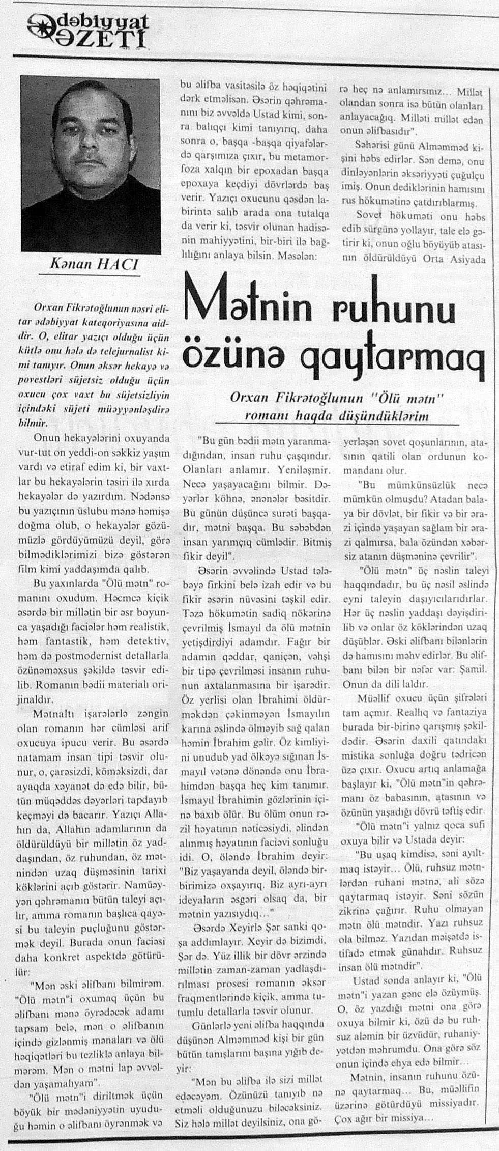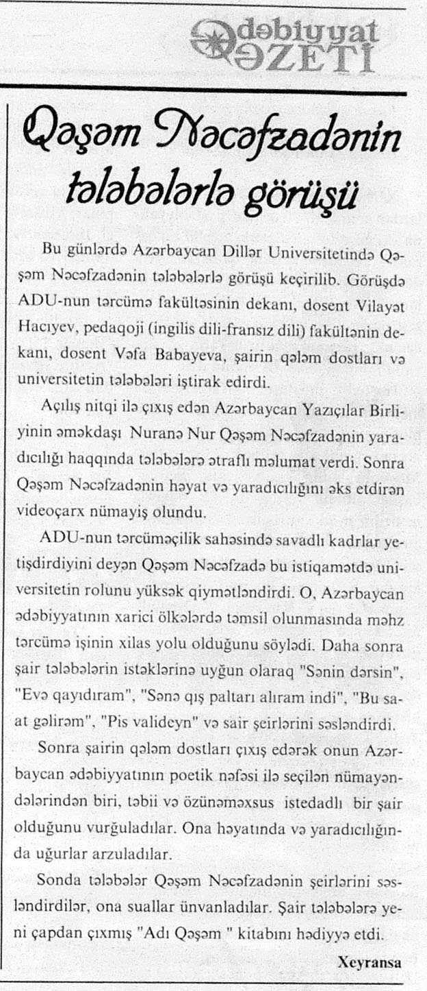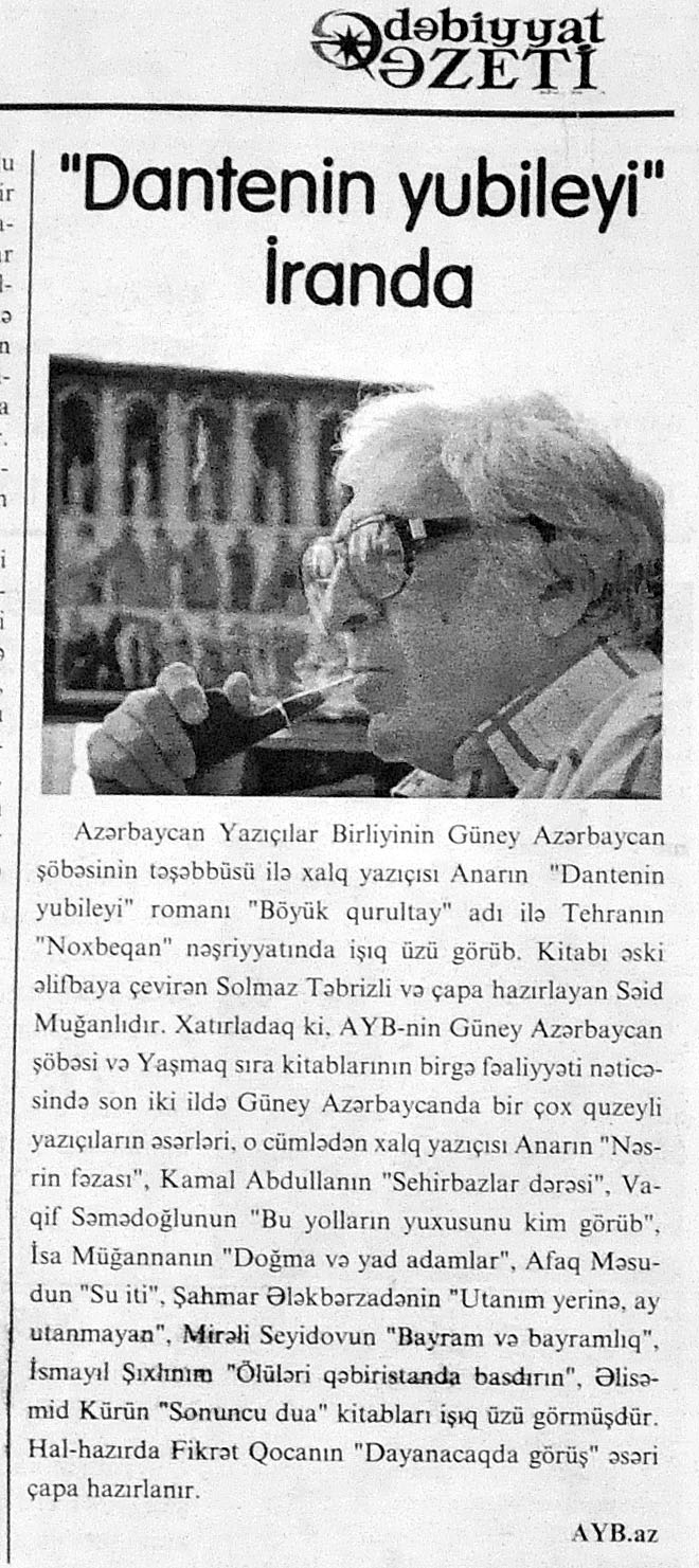 994. Масуд, А. Афаг Масуд: Переводческий центр – очередной бренд в ряду новых структур: проект «Антология современной азербайджанской литературы» //Бакинский рабочий.- 2016.- 2 марта.- С. 5. 995. Произведение Кямала Абдуллы вошло в шорт-лист престижной премии: [имени первого редактора «Литературной газеты» Антона Дельвига «За верность Слову и Отечеству»] //Бакинский рабочий.- 2016.- 18 марта.- С. 6.