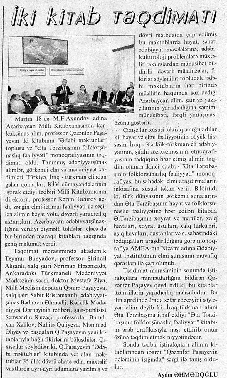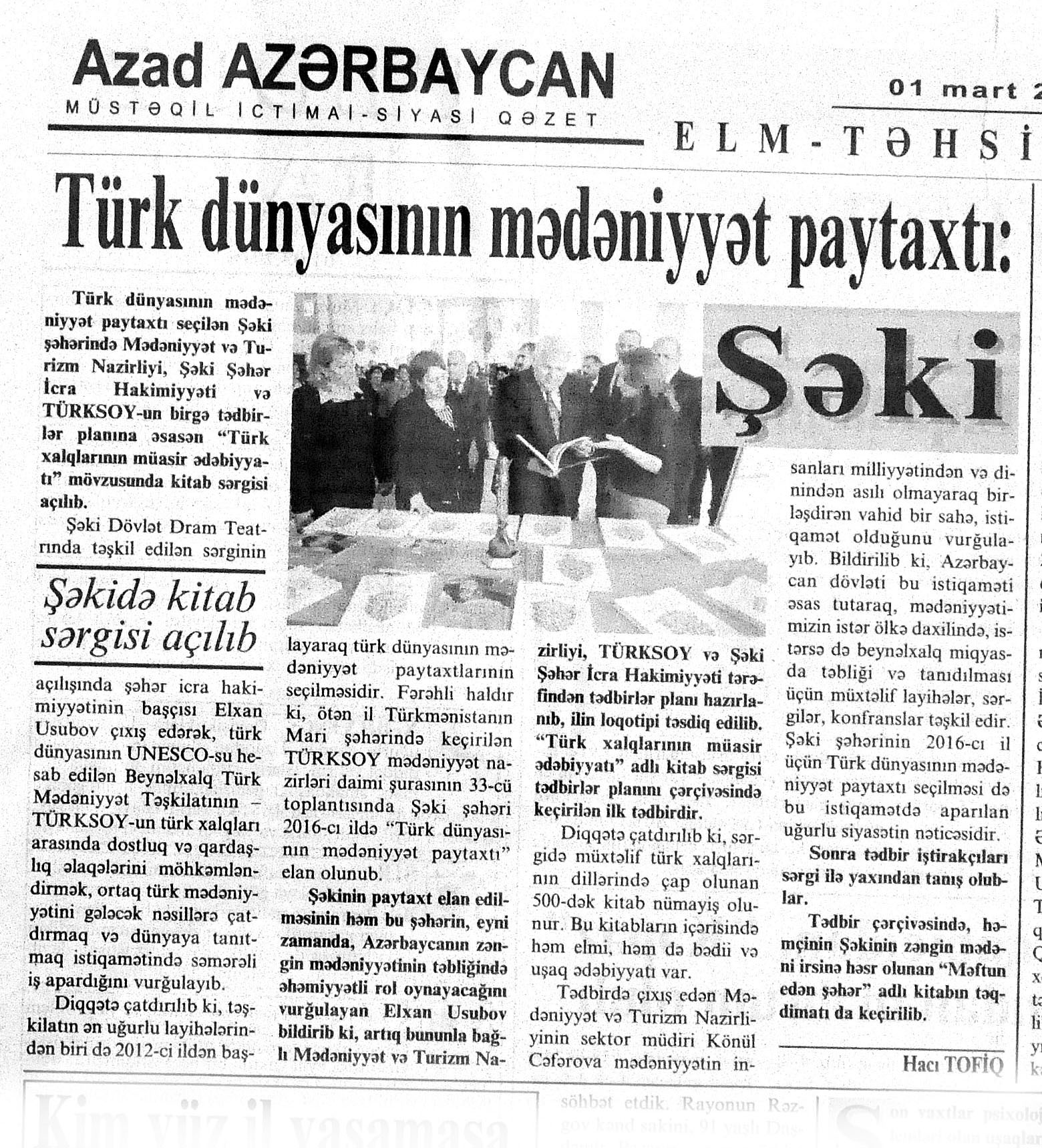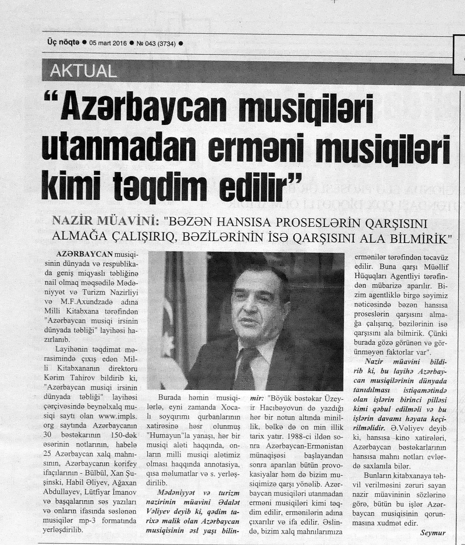 291. Abdullayeva, F. Prezident Kitabxanası Moskva Beynəlxalq Münasibətlər İnstitutuna 100-dən çox kitab hədiyyə edib //Azərbaycan.- 2016.- 5 mart.- S.6. 292. “Azərbaycan musiqi irsinin dünyada təbliği” layihəsinin təqdimatı olub: [Milli Kitabxanada] //525-ci qəzet.- 2016.- 5 mart.- S.12. 293. Əhməd, A. Qəzetlərin arxivi qorunmalıdır: Bu işdə şəhər kitabxanaları daha etibarlı yer sayılır //Şərq.- 2016.- 10 mart.- S.7. 294. Fərəcov, S. Milli Kitabxanada müqəddəs kitabların sərgisi //Mədəniyyət.- 2016.- 16 mart.- S. 4. 295. Quliyev, L. Sabirabadda xoş ovqat yaşanır: [rayonda yerləşən mədəniyyət mərkəzləri və kitabxanaları barədə] //Azərbaycan.- 2016.- 20 mart.- S. 10. 296. Lalə. “Azərbaycan musiqi irsinin dünyada təbliği” layihəsinin təqdimatı: [Milli Kitabxanada] //Mədəniyyət.- 2016.- 8 mart.- S. 5. 297. Mükərrəmoğlu, M. Yeni layihə musiqi irsimizin dünyada təbliğinə yönəlib: Milli Kitabxanada “Azərbaycan musiqi irsinin dünyada təbliği” layihəsinin təqdimat mərasimi keçirilmişdir //Xalq qəzeti.- 2016.- 8 mart.- S.7. 298. Nigar. Milli Kitabxanada “Qədim tarixi Quran kitabları” adlı sərgi açılıb //Palitra.- 2016.- 16 mart.- S.13. 299. Seymur. “Azərbaycan musiqiləri utanmadan erməni musiqiləri kimi təqdim edilir”: [“Azərbaycan musiqi irsinin dünyada təbliği” layihəsi ilə bağlı Milli Kitabxanada keçirilən təqdimat haqqında] //Üç nöqtə.- 2016.- 5 mart.- S.7. 300. Səmərqənd kitabxanalarına Azərbaycan haqqında nəşrlər verilib //525-ci qəzet.- 2016.- 31 mart.- S. 7; //Xalq cəbhəsi.- 2016.- 31 mart.- S. 16. Bax: 661, 776, 799