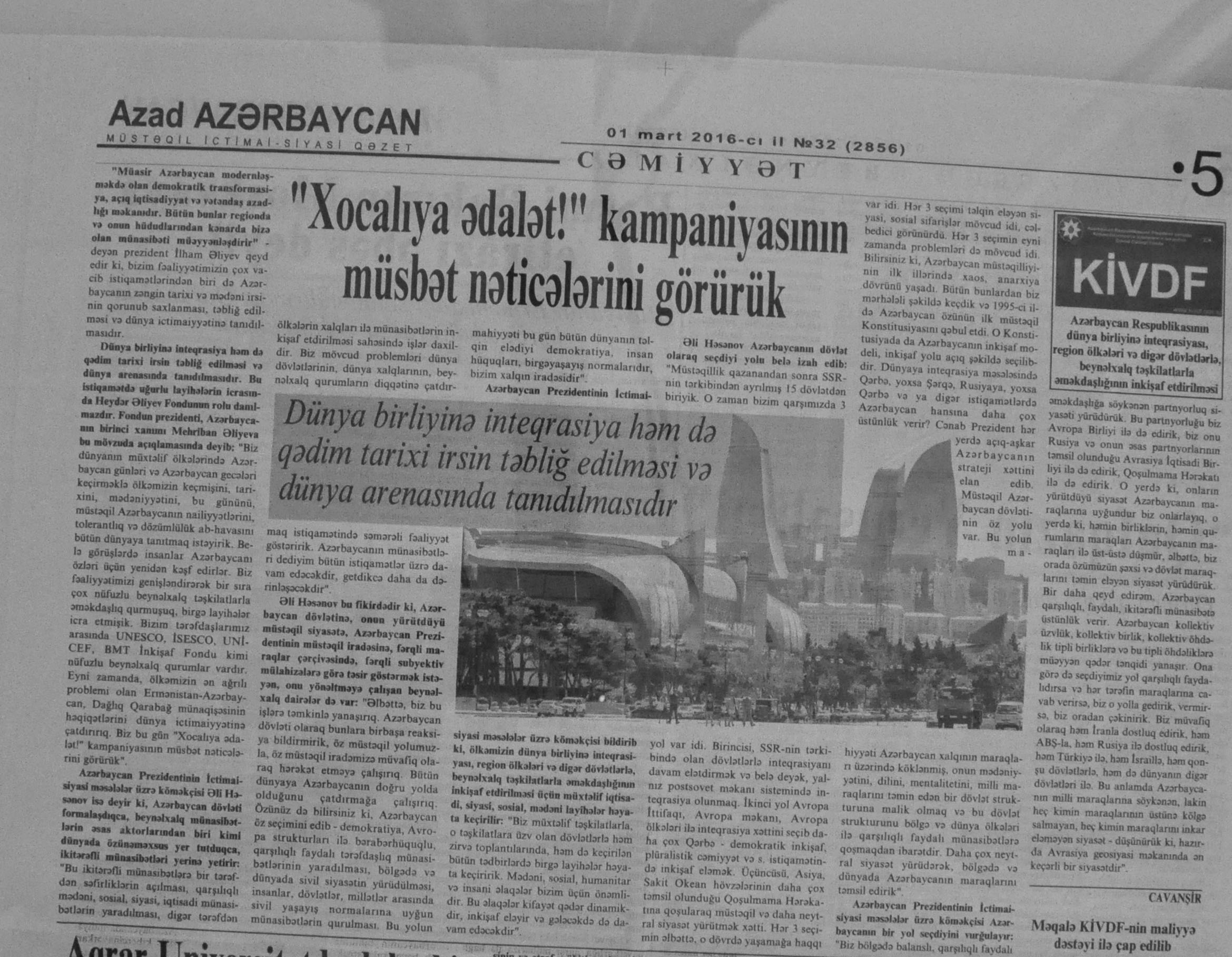 129. Abdullayeva, F. Leyla Əliyeva: Bütün dəhşətlərə baxmayaraq, xalqımızın ruhu qırılmadı //Azərbaycan.- 2016.- 1 mart.- S. 4. 130. Azəri, L. Faciə və qəhrəmanlıq tariximizin ekran təcəssümü: Milli Qəhrəmanlar haqqında sənədli filmlərin təqdimatı: [Nizami Kino Mərkəzində “Xocalının zamini” və “Pəhləvan komandir” sənədli filmlərinin təqdimatı haqqında] //Mədəniyyət.- 2016.- 2 mart.- S. 4. 131. Bakı Uşaq Teatrının Xocalı tamaşası //Mədəniyyət.- 2016.- 2 mart.- S. 10. 132. Cavanşir. “Xocalıya ədalət!” kampaniyasının müsbət nəticələrini görürük //Azad Azərbaycan.- 2016.- 1 mart.- S.5. 133. Dadaşov, M. Florensiyada “Sonsuz dəhliz” filmi nümayiş etdirilib: [litvalı rejissor Andreas Brokasın eyniadlı filmi haqqında] //Azərbaycan.- 2016.- 8 mart.- S.8. 134. Dadaşov, M. İtaliyalı senator: “Xocalı qətliamı Ermənistan-Azərbaycan münaqişəsinin ən faciəvi hadisəsidir” //Azərbaycan.- 2016.- 11 mart.- S. 11. 135. Əlihüseyn, V. “Kimin ağzında qızıl dişi vardı, “atvyorka” ilə çıxarırdılar //Təzadlar.- 2016.- 1 mart.- S. 11. 136. Əliyev, A. Cəhənnəmdən açılan qapı: (Olmuş əhvalat) //Azərbaycan.- 2016.- 1 mart.- S.5. 137. Əsrin faciəsi - unudulmayacaq tarix: Bölgələrdə Xocalı soyqırımı qurbanlarının xatirəsi müxtəlif tədbirlərlə yad olunub: [mədəniyyət evlərində] // Mədəniyyət.- 2016.- 2 mart.- S.11. 138. Hadiyev, E. Xocalıdan sonrakı xocalılılar...: Onlar yurdlarına qayıdacaqlarına inanırlar //Azərbaycan.- 2016.- 1 mart.- S.5. 139. Xocalı faciəsi – əsrin faciəsi //Təzadlar.- 2016.- 1 mart.- S.4. 140. Xocalı fəryadı //Mədəniyyət.- 2016.- 2 mart.- S. 7. 141. Xocalı – qan yaddaşımız: Xalça Muzeyində soyqırımı qurbanlarının xatirəsi anıldı: [tədbirdə Mədəniyyət və Turizm nazirinin müavini Sevda Məmmədəliyevanın çıxışı haqqında] //Mədəniyyət.- 2016.- 2 mart.- S.5. 142. “Xocalı – qırğın haqqında həqiqət”: Fransa Milli Assambleyasında bu adda konfrans-debatı keçirilib //Xalq cəbhəsi.- 2016.- 2 mart.- S.7. 143. XX əsrin faciəsi: Bülbülün memorial muzeyində xatirə tədbiri //Mədəniyyət.- 2016.- 2 mart.- S. 7. 144. Leyla Əliyeva: Bütün dəhşətlərə baxmayaraq, xalqımızın ruhu qırılmadı: [Heydər Əliyev Fondunun vitse-prezidentinin “Redisson Royal Moskva” mehmanxanasındakı çıxışı haqqında] //Yeni Azərbaycan.- 2016.- 1 mart.- S.4. 145. Moldovada Xocalı soyqırımına həsr edilən konfrans keçirilib //Azərbaycan.- 2016.- 4 mart.- S. 5. 146. Paytaxtın mədəniyyət evlərində faciə qurbanları anılıb: //Mədəniyyət.- 2016.- 2 mart.- S. 7. 147. Rəşid, L. Xocalıya ədalət xalq diplomatiyası kimi //Kaspi.-2016.- 1 mart.- S.15 148. Serbiyalı müğənni Xocalı üçün oxudu: [soyqırıma həsr edilmiş video-çarxda Nataşa Yoviçin ifası haqqında] //Mədəniyyət.- 2016.- 2 mart.- S. 5. Sultanova, M. Qardaş xalqların ortaq acısı //Mədəniyyət.- 2016.- 4 mart.- S. 15. 149. Tarixin acı səhifəsi: Tədris ocaqlarında Xocalıya həsr olunmuş tədbirlər //Mədəniyyət.- 2016.- 2 mart.- S. 7.