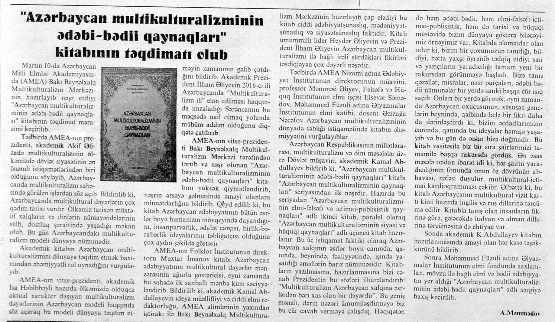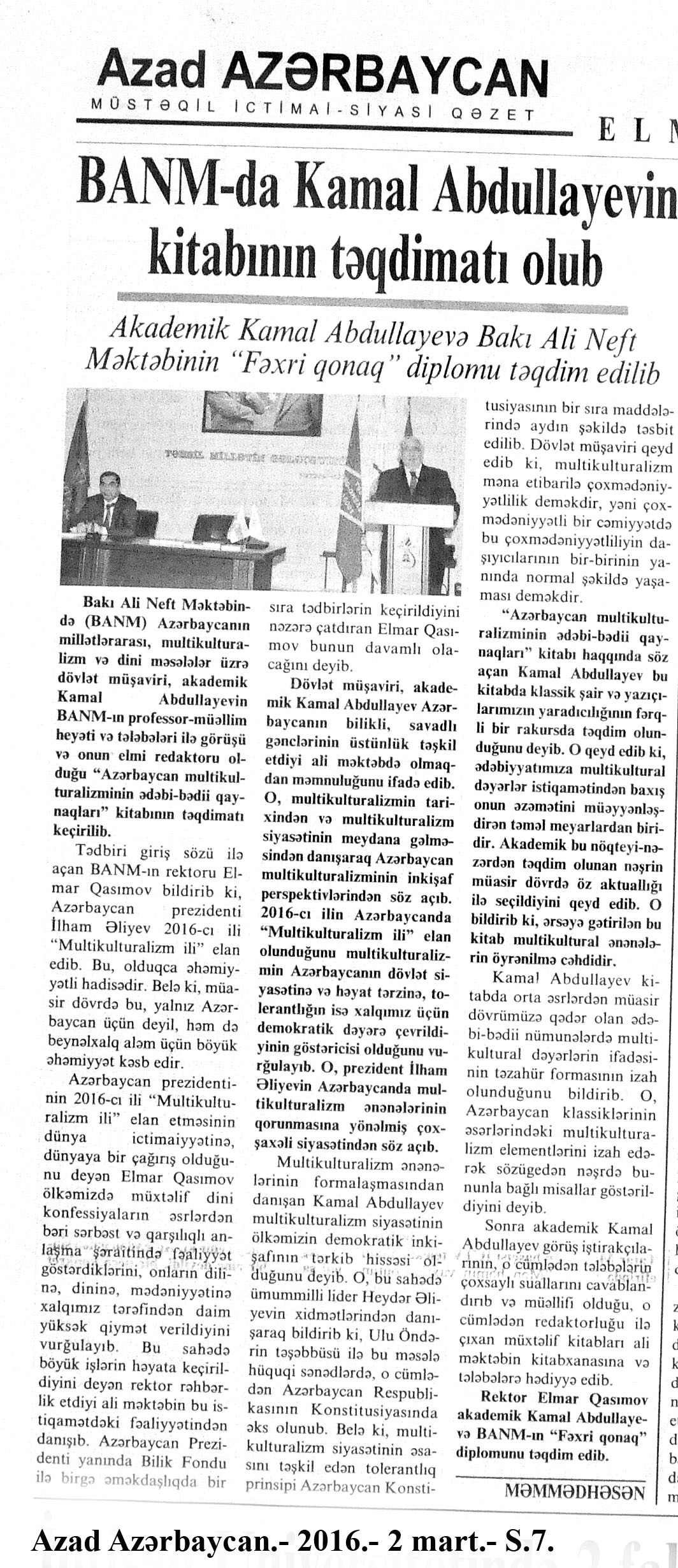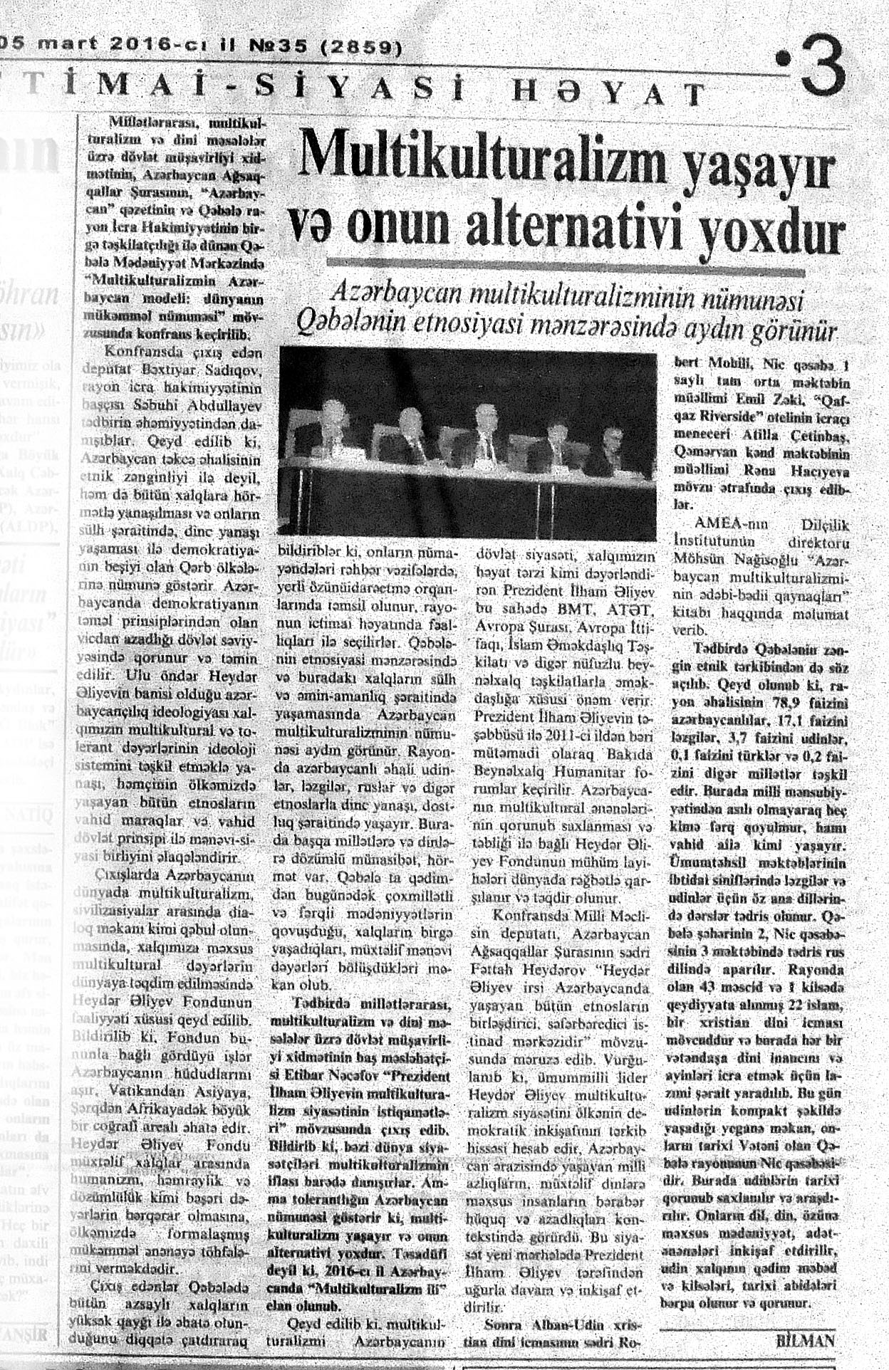 90. Abbaslı, T. “Azərbaycançılıq – milli bütünçülük, əlbir-dilbirçilik, əbədiçilik...” Rəsm müsabiqəsinə yekun vuruldu //Mədəniyyət.- 2016.- 4 mart.- S. 13. 91. Azərbaycan dünyada multikulturalizm nümunəsi kimi tanınır: Mədəniyyət və Turizm nazirinin Braziliya Senatının komitə sədri ilə görüşündə ölkəmizin mədəniyyətlərarası dialoqa töhfələrindən söz açılıb: [Əbülfəs Qarayevin Kristovam Buarkenin rəhbərlik etdiyi nümayəndə heyəti ilə görüşü haqqında] //Mədəniyyət.- 2016.- 8 mart.- S. 6. 92. Azərbaycandakı nadir tolerantlıq mühitini qoruyub saxlamaq hər birimizin vətəndaşlıq borcudur //Yeni Azərbaycan.- 2016.-3 mart.- S.4. 93. BANM-də “Azərbaycan multikulturalizminin ədəbi-bədii qaynaqları” kitabının təqdimatı keçirilib: [akademik Kamal Abdullayevin eyniadli kitabinin təqdimatı haqqında] //Yeni Azərbaycan.- 2016.- 1 mart.- S.6. 94. Bilman. Multikulturalizm yaşayır və onun alternativi yoxdur: Azərbaycan Multikulturalizminin nümunəsi Qəbələnin etnosiyasi mənzərəsində aydın görünür: [Qəbələ rayonunda “Multikulturalizmin Azərbaycan modeli:dünyanın mükəmməl nümunəsi” mövzusunda keçirilən konfrans haqqında] //Azad Azərbaycan.- 2016.- 5 mart.- S. 3. 95. Cavadov, S. Lənkəranda “Bizim gücümüz birliyimizdədir” mövzusunda konfrans keçirilmişdir //Azərbaycan.- 2016.- 4 mart.- S.6. 96. Cəfərov, N. Türk dünyasının multikulturalizmi: Multikulturalizm ili – 2016 //Azərbaycan.- 2016.- 30 mart.- S.7. 97. Elmi-Metodik Mərkəzin konfrans, seminar və treninqi: [Mədəniyyətşünaslıq üzrə Elmi-Metodik Mərkəzdə “Multikulturalizm ili”nə həsr olunmuş ilk elmi seminarın keçirilməsi haqqında] //Mədəniyyət.- 2016.- 16 mart.- S. 6. 98. Əli. “Multikulturalizm elə bir siyasətdir ki, o, mədəni plüralizmi qəbul edir və onun inkişafına şərait yaradır”: [professor Etibar Nəcəfovun mövzu ilə bağlı fikirləri] //Xalq cəbhəsi.- 2016.- 18 mart.- S.9. 99. Əliyev, S. Multikulturalizm Azərbaycanın dövlət siyasətidir: Şəmkirdə yaşayan azsaylı xalqların nümayəndələri ilə görüş //Azərbaycan.- 2016.- 4 mart.- S.6. 100. Kristovam Buarke: Azərbaycan multikulturalizmi bir model kimi böyük maraq doğurur: [Millətlərarası Multikulturalizm və Dini Məsələlər üzrə Dövlət müşaviri Kamal Abdullayevin Braziliya-Azərbaycan parlamentlərarası dostluq qrupunun rəhbəri ilə görüşü haqqında] //Azərbaycan.- 2016.- 5 mart.- S. 5. 101. Kuliyeva, C. “Multikulturalizm ili” çərçivəsində “Qardaşlaşmış məktəblər” layihəsi //Azərbaycan müəllimi.- 2016.- 12 mart.- S.10. 102. Qiymətli əyani vəsait: [Bakı Beynəlxalq Multikulturalizm Mərkəzinin çap etdirdiyi kitabçalar haqqında] //İki sahil.- 2016.- 8 mart.- S.14. 103. Quliyev, L. Çoxmədəniyyətlilik mingəçevirlilərin həyat tərzidir //Azərbaycan.- 2016.- 5 mart.- S. 5. 104. Lalə. Azərbaycan və gürcü uşaqlarının “Bahar” töhfəsi: “Multikulturalizm ili” çərçivəsində möhtəşəm dostluq konserti: [Heydər Əliyev Sarayında] //Mədəniyyət.- 2016.- 11 mart.- S. 9. 105. Məmmədhəsən. BANM-da Kamal Abdullayevin kitabının təqdimatı olub: Akademik Kamal Abdullayevə Bakı Ali Neft Məktəbinin “Fəxri qonaq” diplomu təqdim edilib //Azad Azərbaycan.- 2016.- 2 mart.- S.7. 106. Məmmədov, A. “Azərbaycan multikulturalizminin ədəbi-bədii qaynaqları” kitabının təqdimatı olub: [AMEA-da] //Ədəbiyyat qəzeti .- 2016.- 12 mart.- S.2. 107. Məmmədov, T. “Multikulturalizmin təbliği istiqamətində əməli işlər görürük”: [sənətşünaslıq doktoru, professor Tariyel Məmmədovun müsahibəsi] /müsahibəni apardı Vidadi Qafarov //525-ci qəzet.- 2016.- 29 mart.- S. 5. 108. Multikultural milli-mənəvi dəyərlər və gənclik: [Qafqaz Universitetində eyniadlı ədəbi-bədii tədbirin keçirilməsi haqqında] //Mədəniyyət.- 2016.- 18 mart.- S. 6. 109. “Multikulturalizm həyat tərzi kimi: Mühazirə və konsert proqramı: ” [Qara Qarayev adına Mərkəzi İncəsənət Məktəbində] //Mədəniyyət.- 2016.- 18 mart.- S. 2. 110. “Multikulturalizmin Azərbaycan modeli: dünyanın mükəmməl nümunəsi”: Qəbələ rayonunda keçirilən konfransda xalqımızın zəngin multikultural ənənələrindən, bununla bağlı dövlət siyasətinin uğurlu nəticələrindən bəhs olunub //Azərbaycan.- 2016.- 5 mart.- S. 5. 111. Multikulturalizmin Azərbaycan modeli: dünyanın mükəmməl nümunəsi: Millətlərarası multikulturalizm və dini məsələlər üzrə Dövlət müşavirinin xidməti, Ağsaqqallar Şurası, “Azərbaycan” qəzeti və Qəbələ Rayon İcra Hakimiyyətinin birgə keçirdiyi konfrans //Azərbaycan.- 2016.- 10 mart.- S. 5, 6, 7. 112. Mükərrəmoğlu, M. Azərbaycan multikulturalizm məkanıdır //Xalq qəzeti.- 2016.- 12 mart.- S.10. 113. Mürvətqızı, S. Marağı sevgiyə çevirmək missiyası: Azərbaycan multikulturalizminin dünyada təbliği gerçəkləşən siyasi iradənin təcəssümüdür //İki sahil.- 2016.- 1 mart.- S.10. 114. Rzayeva, R. Dialoqun fəlsəfəsi və multikulturalizm //Elm.- 2016.- 11 mart.- S.5-6. 115. Salahov, E. Azərbaycan multikulturalizm məkanı: BMT Sivilizasiyalar Alyansının VII Qlobal Forumu ölkəmizə nə vəd edir? //İki sahil.- 2016.- 31 mart.- S.14. 116. Salmanlı, R. Azərbaycan dünyada multikulturalizm mərkəzi kimi tanınır //Azərbaycan.- 2016.- 4 mart.- S.6. 117. Səlimov, Ə. Qaxın multikultural ənənələri //Azərbaycan.- 2016.- 5 mart.- S.5. 118. Süleymanqızı, X. “Azərbaycan-multikulturalizm məkanı: BMT Sivilizasiyalar Alyansının VII Qlobal Forumu ölkəmizə nə vəd edir?” //Olaylar.- 2016.- 17 mart.- S.12. 119. Şükürov, Ə. Multikulturalizm Azərbaycanın ən böyük milli sərvətidir: Aqrar Universitetdə dəyirmi masa keçirilib //Azad Azərbaycan.- 
