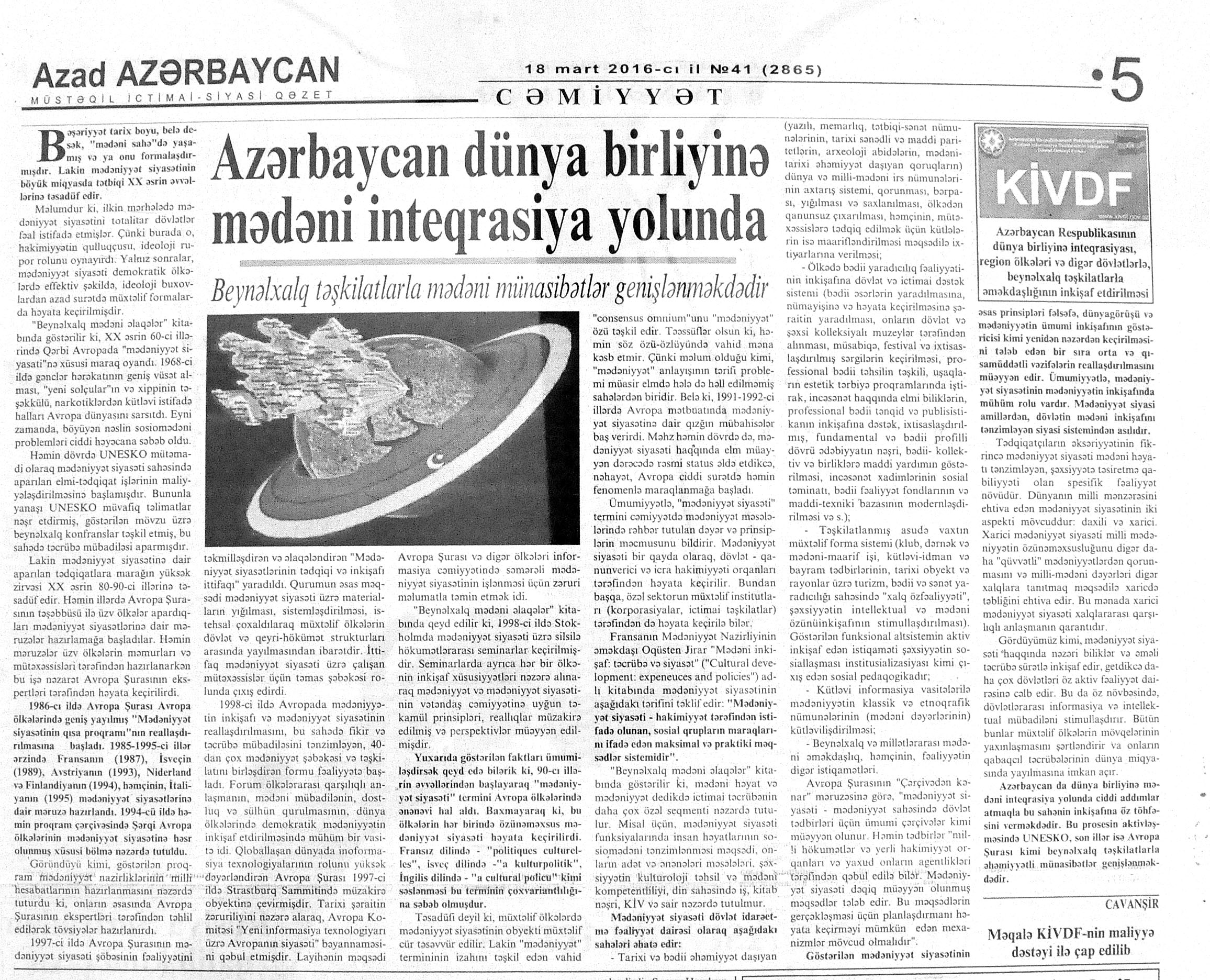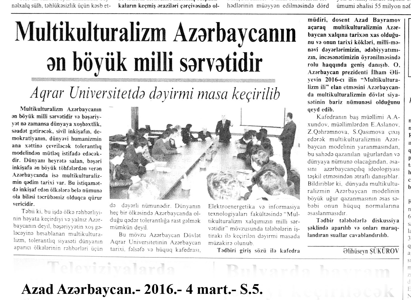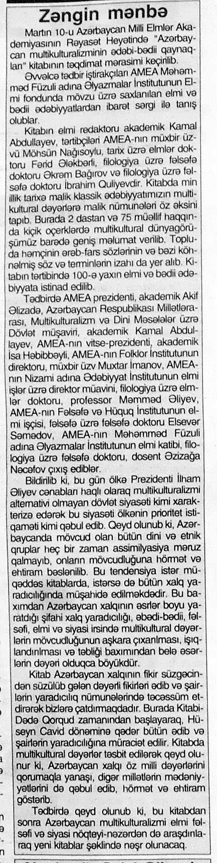 90. Abbaslı, T. “Azərbaycançılıq – milli bütünçülük, əlbir-dilbirçilik, əbədiçilik...” Rəsm müsabiqəsinə yekun vuruldu //Mədəniyyət.- 2016.- 4 mart.- S. 13. 91. Azərbaycan dünyada multikulturalizm nümunəsi kimi tanınır: Mədəniyyət və Turizm nazirinin Braziliya Senatının komitə sədri ilə görüşündə ölkəmizin mədəniyyətlərarası dialoqa töhfələrindən söz açılıb: [Əbülfəs Qarayevin Kristovam Buarkenin rəhbərlik etdiyi nümayəndə heyəti ilə görüşü haqqında] //Mədəniyyət.- 2016.- 8 mart.- S. 6. 92. Azərbaycandakı nadir tolerantlıq mühitini qoruyub saxlamaq hər birimizin vətəndaşlıq borcudur //Yeni Azərbaycan.- 2016.-3 mart.- S.4. 93. BANM-də “Azərbaycan multikulturalizminin ədəbi-bədii qaynaqları” kitabının təqdimatı keçirilib: [akademik Kamal Abdullayevin eyniadli kitabinin təqdimatı haqqında] //Yeni Azərbaycan.- 2016.- 1 mart.- S.6. 94. Bilman. Multikulturalizm yaşayır və onun alternativi yoxdur: Azərbaycan Multikulturalizminin nümunəsi Qəbələnin etnosiyasi mənzərəsində aydın görünür: [Qəbələ rayonunda “Multikulturalizmin Azərbaycan modeli:dünyanın mükəmməl nümunəsi” mövzusunda keçirilən konfrans haqqında] //Azad Azərbaycan.- 2016.- 5 mart.- S. 3. 95. Cavadov, S. Lənkəranda “Bizim gücümüz birliyimizdədir” mövzusunda konfrans keçirilmişdir //Azərbaycan.- 2016.- 4 mart.- S.6. 96. Cəfərov, N. Türk dünyasının multikulturalizmi: Multikulturalizm ili – 2016 //Azərbaycan.- 2016.- 30 mart.- S.7. 97. Elmi-Metodik Mərkəzin konfrans, seminar və treninqi: [Mədəniyyətşünaslıq üzrə Elmi-Metodik Mərkəzdə “Multikulturalizm ili”nə həsr olunmuş ilk elmi seminarın keçirilməsi haqqında] //Mədəniyyət.- 2016.- 16 mart.- S. 6. 98. Əli. “Multikulturalizm elə bir siyasətdir ki, o, mədəni plüralizmi qəbul edir və onun inkişafına şərait yaradır”: [professor Etibar Nəcəfovun mövzu ilə bağlı fikirləri] //Xalq cəbhəsi.- 2016.- 18 mart.- S.9. 99. Əliyev, S. Multikulturalizm Azərbaycanın dövlət siyasətidir: Şəmkirdə yaşayan azsaylı xalqların nümayəndələri ilə görüş //Azərbaycan.- 2016.- 4 mart.- S.6. 100. Kristovam Buarke: Azərbaycan multikulturalizmi bir model kimi böyük maraq doğurur: [Millətlərarası Multikulturalizm və Dini Məsələlər üzrə Dövlət müşaviri Kamal Abdullayevin Braziliya-Azərbaycan parlamentlərarası dostluq qrupunun rəhbəri ilə görüşü haqqında] //Azərbaycan.- 2016.- 5 mart.- S. 5. 101. Kuliyeva, C. “Multikulturalizm ili” çərçivəsində “Qardaşlaşmış məktəblər” layihəsi //Azərbaycan müəllimi.- 2016.- 12 mart.- S.10. 102. Qiymətli əyani vəsait: [Bakı Beynəlxalq Multikulturalizm Mərkəzinin çap etdirdiyi kitabçalar haqqında] //İki sahil.- 2016.- 8 mart.- S.14. 103. Quliyev, L. Çoxmədəniyyətlilik mingəçevirlilərin həyat tərzidir //Azərbaycan.- 2016.- 5 mart.- S. 5. 104. Lalə. Azərbaycan və gürcü uşaqlarının “Bahar” töhfəsi: “Multikulturalizm ili” çərçivəsində möhtəşəm dostluq konserti: [Heydər Əliyev Sarayında] //Mədəniyyət.- 2016.- 11 mart.- S. 9. 105. Məmmədhəsən. BANM-da Kamal Abdullayevin kitabının təqdimatı olub: Akademik Kamal Abdullayevə Bakı Ali Neft Məktəbinin “Fəxri qonaq” diplomu təqdim edilib //Azad Azərbaycan.- 2016.- 2 mart.- S.7. 106. Məmmədov, A. “Azərbaycan multikulturalizminin ədəbi-bədii qaynaqları” kitabının təqdimatı olub: [AMEA-da] //Ədəbiyyat qəzeti .- 2016.- 12 mart.- S.2. 107. Məmmədov, T. “Multikulturalizmin təbliği istiqamətində əməli işlər görürük”: [sənətşünaslıq doktoru, professor Tariyel Məmmədovun müsahibəsi] /müsahibəni apardı Vidadi Qafarov //525-ci qəzet.- 2016.- 29 mart.- S. 5. 108. Multikultural milli-mənəvi dəyərlər və gənclik: [Qafqaz Universitetində eyniadlı ədəbi-bədii tədbirin keçirilməsi haqqında] //Mədəniyyət.- 2016.- 18 mart.- S. 6. 109. “Multikulturalizm həyat tərzi kimi: Mühazirə və konsert proqramı: ” [Qara Qarayev adına Mərkəzi İncəsənət Məktəbində] //Mədəniyyət.- 2016.- 18 mart.- S. 2. 110. “Multikulturalizmin Azərbaycan modeli: dünyanın mükəmməl nümunəsi”: Qəbələ rayonunda keçirilən konfransda xalqımızın zəngin multikultural ənənələrindən, bununla bağlı dövlət siyasətinin uğurlu nəticələrindən bəhs olunub //Azərbaycan.- 2016.- 5 mart.- S. 5. 111. Multikulturalizmin Azərbaycan modeli: dünyanın mükəmməl nümunəsi: Millətlərarası multikulturalizm və dini məsələlər üzrə Dövlət müşavirinin xidməti, Ağsaqqallar Şurası, “Azərbaycan” qəzeti və Qəbələ Rayon İcra Hakimiyyətinin birgə keçirdiyi konfrans //Azərbaycan.- 2016.- 10 mart.- S. 5, 6, 7. 112. Mükərrəmoğlu, M. Azərbaycan multikulturalizm məkanıdır //Xalq qəzeti.- 2016.- 12 mart.- S.10. 113. Mürvətqızı, S. Marağı sevgiyə çevirmək missiyası: Azərbaycan multikulturalizminin dünyada təbliği gerçəkləşən siyasi iradənin təcəssümüdür //İki sahil.- 2016.- 1 mart.- S.10. 114. Rzayeva, R. Dialoqun fəlsəfəsi və multikulturalizm //Elm.- 2016.- 11 mart.- S.5-6. 115. Salahov, E. Azərbaycan multikulturalizm məkanı: BMT Sivilizasiyalar Alyansının VII Qlobal Forumu ölkəmizə nə vəd edir? //İki sahil.- 2016.- 31 mart.- S.14. 116. Salmanlı, R. Azərbaycan dünyada multikulturalizm mərkəzi kimi tanınır //Azərbaycan.- 2016.- 4 mart.- S.6. 117. Səlimov, Ə. Qaxın multikultural ənənələri //Azərbaycan.- 2016.- 5 mart.- S.5. 118. Süleymanqızı, X. “Azərbaycan-multikulturalizm məkanı: BMT Sivilizasiyalar Alyansının VII Qlobal Forumu ölkəmizə nə vəd edir?” //Olaylar.- 2016.- 17 mart.- S.12. 119. Şükürov, Ə. Multikulturalizm Azərbaycanın ən böyük milli sərvətidir: Aqrar Universitetdə dəyirmi masa keçirilib //Azad Azərbaycan.- 