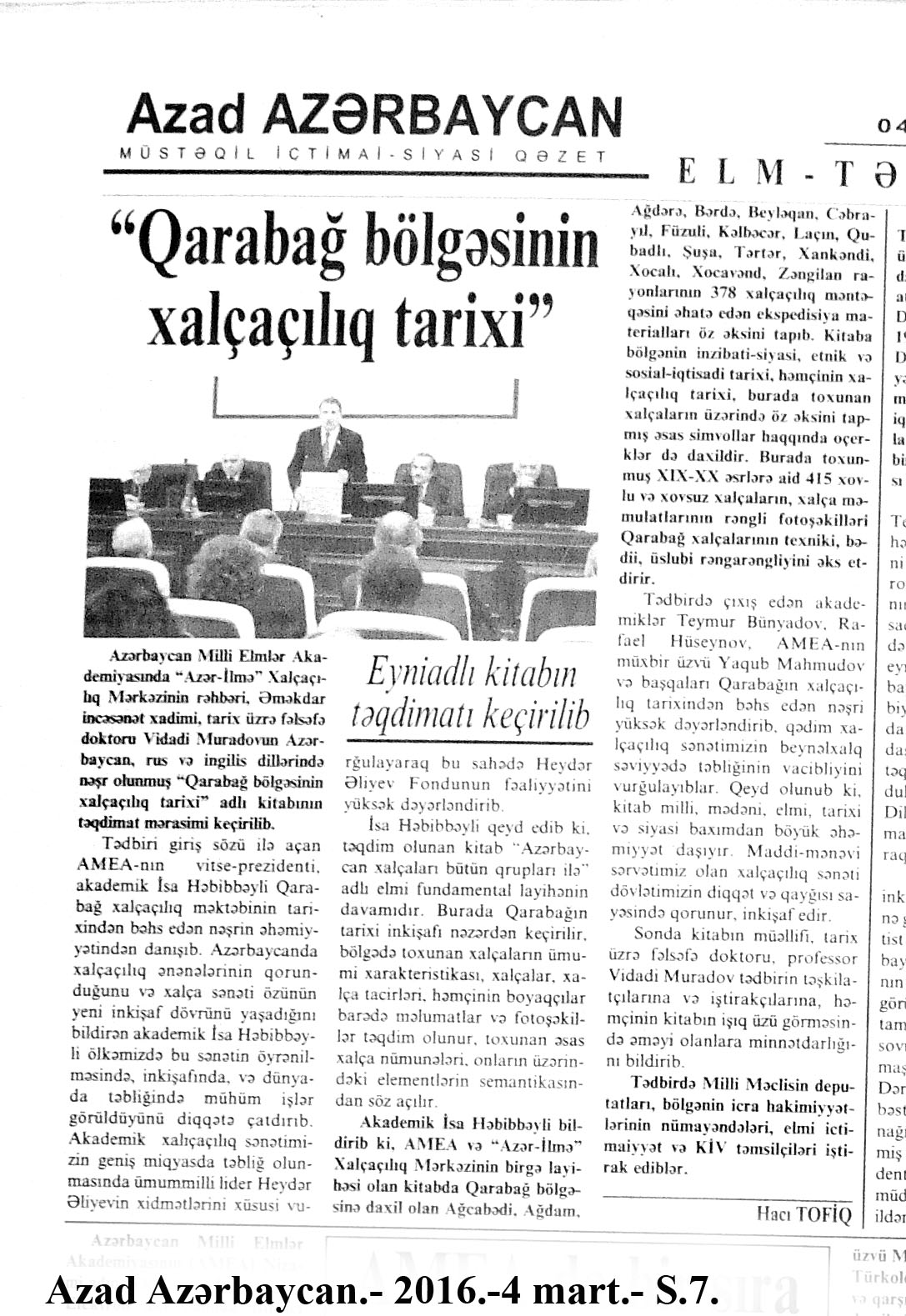 333. Ağalarova, Ş. Azərbaycan kəlağayısının Parisdə butiki təşkil olunub //Azərbaycan.- 2016.- 8 mart.- S. 11. 334. Ağalarova, Ş. UNESCO-da Azərbaycan kəlağayısının təqdimatı olub //Azərbaycan.- 2016.- 10 mart.- S. 12; Mədəniyyət.- 2016.- 11 mart.- S. 8. 335. Alışanlı, Ş. Ağac lövhələrdə yaşayan tarix: Elm xadimləri: [Azərbaycanda xəttoyma sənətinin ustadı Seyfəddin Mənsimoğlunun yaradıcılığı haqqında] //Azərbaycan.- 2016.- 6 mart- S.7. 336. Azərbaycan Xalça Muzeyinə yeni direktor təyin olundu: [Mədəniyyət və Turizm naziri Əbülfəs Qarayevin əmri ilə Şirin Yaşar qızı Məlikovanın təyinatı haqqında] //Palitra.- 2016.- 3 mart.- S.13. 337. “Azərbaycan xalçalarının açılmamış sirləri”: [Azərbaycan Xalça Muzeyində tədqiqatçı alim Şakir Qabıssanlının (Həmzəyev) eyniadlı kitabının təqdimatı haqqında] //Mədəniyyət.- 2016.- 4 mart.- S. 2; 525-ci qəzet.- 2016.- 12 mart.- S. 12. 338. Azərbaycan kəlağayısının Parisdə butiki təşkil edilib //525-ci qəzet.- 2016.- 8 mart.- S. 7. 339. Cəfərli, E. Dünyanı bəzəyən Azərbaycan ilmələri //Olaylar.- 2016.- 29 mart.- S.14. 340. Əliyev, Z. El sənəti - el şöhrəti: Şəbəkə ustası Tofiq Rəsulovun yaradıcılığı haqqında //Kaspi.- 2016.- 5-7 mart.- S.24. 341. Əliyev, Z. Şəbəkə sənəti: ənənədən müasirliyə: [ecazkar nümunələr müəllifi Tofiq Rəsulov haqqında] //Mədəniyyət.- 2016.- 2 mart.- S. 12. 342. Hüseynov, F. “Əsrlərdən gələn sənətimiz”: Gənc ustaların əl işlərindən ibarət sərgi-yarmarka keçirildi: [Rəşid Behbudov adına Dövlət Mahnı Teatrında] //Mədəniyyət.- 2016.- 18 mart.- S.9. 343. Kərimova, A. Sənətkarın qiyməti vaxtında verilməlidir: [xalçaçı rəssam Afaq Kərimovanın müsahibəsi] /müsahibəni apardı Ağalar İdrisoğlu //Azad Azərbaycan.- 2016.- 19 mart.- S.7. 344. Muradov, V. “Ermənilər xalçaçılığı azərbaycanlılardan öyrəniblər”: [“Azər-İlmə” Xalçaçılıq Mərkəzinin rəhbəri, professor Vidadi Muradovun müsahibəsi] //Xalq cəbhəsi.- 2016.- 15 mart.- S.15. 345. Nigar. “Qarabağ bölgəsinin xalçaçılıq tarixi” kitabının təqdimatı olub: [AMEA-da “Azər-İlmə” Xalçaçılıq Mərkəzinin direktoru, Əməkdar İncəsənət Xadimi, professor Vidadi Muradovun eyniadlı kitabının təqdimatı haqqında] //Palitra.- 2016.- 2 mart.- S.6; 525-ci qəzet.- 2016.- 3 mart.- S.3. 346. Tofiq, H. “Qarabağ bölgəsinin xalçaçılıq tarixi”: [AMEA-nın “Azər-İlmə” Xalçaçılıq Mərkəzinin direktoru, Əməkdar incəsənət xadimi, professor Vidadi Muradovun eyniadlı kitabının təqdimatı haqqında] //Mədəniyyət.- 2016.- 4 mart.- S.10; Azad Azərbaycan.- 2016.- 4 mart.- S.7.