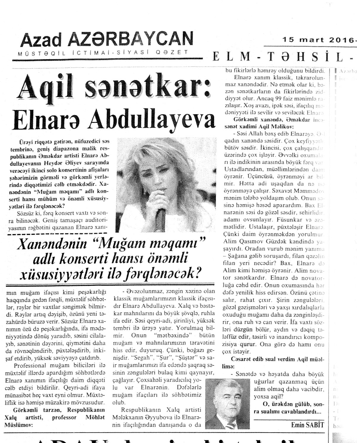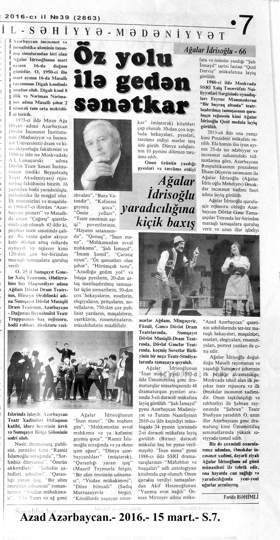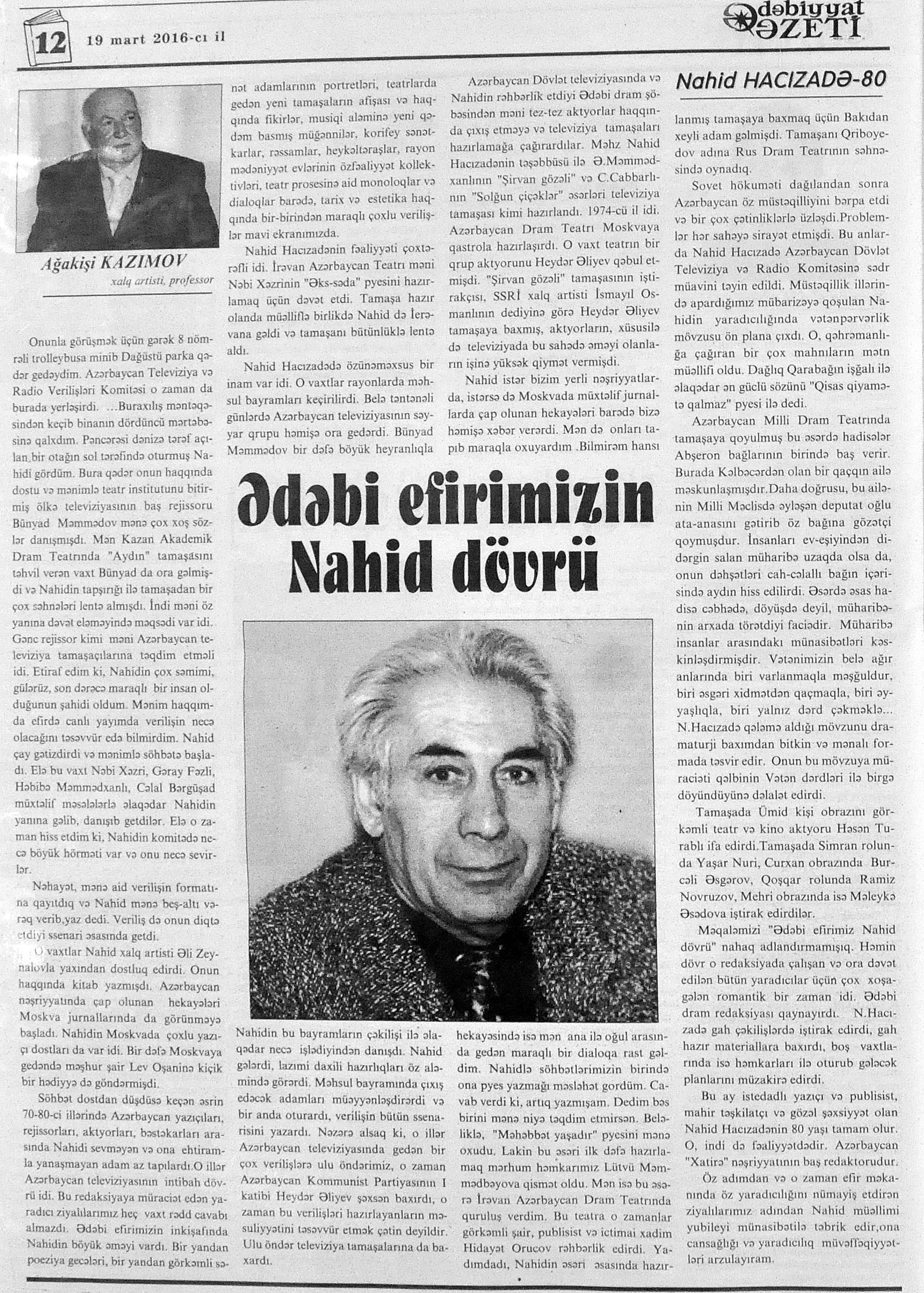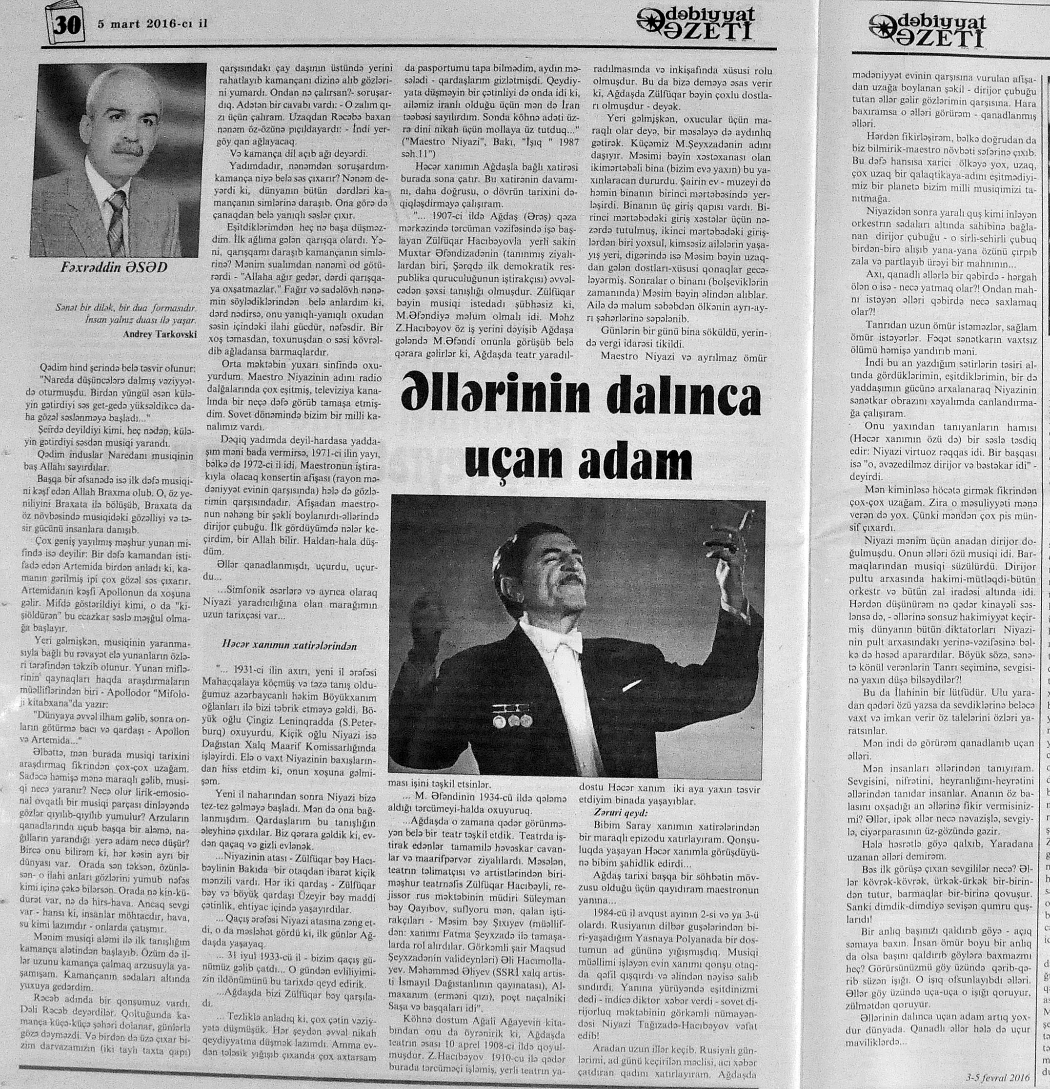 971. Алиева, У. Великолепная «Тоска» с участием звезд из трех стран на сцене Театра Оперы и Балета //Эхо.- 2016.-1 марта.- С.8. 972. Вспоминая актера: Сидги Рухулла – 130 //Каспiй.- 2016.-30 марта.- С.11. 973. Нейматов, А. Азер Паша Нейматов, народный артист Азербайджана: «Режиссура - ремесло практическое» /провела беседу В.Резникова //Азербайджанские известия.- 2016.-12 марта.- С.3.