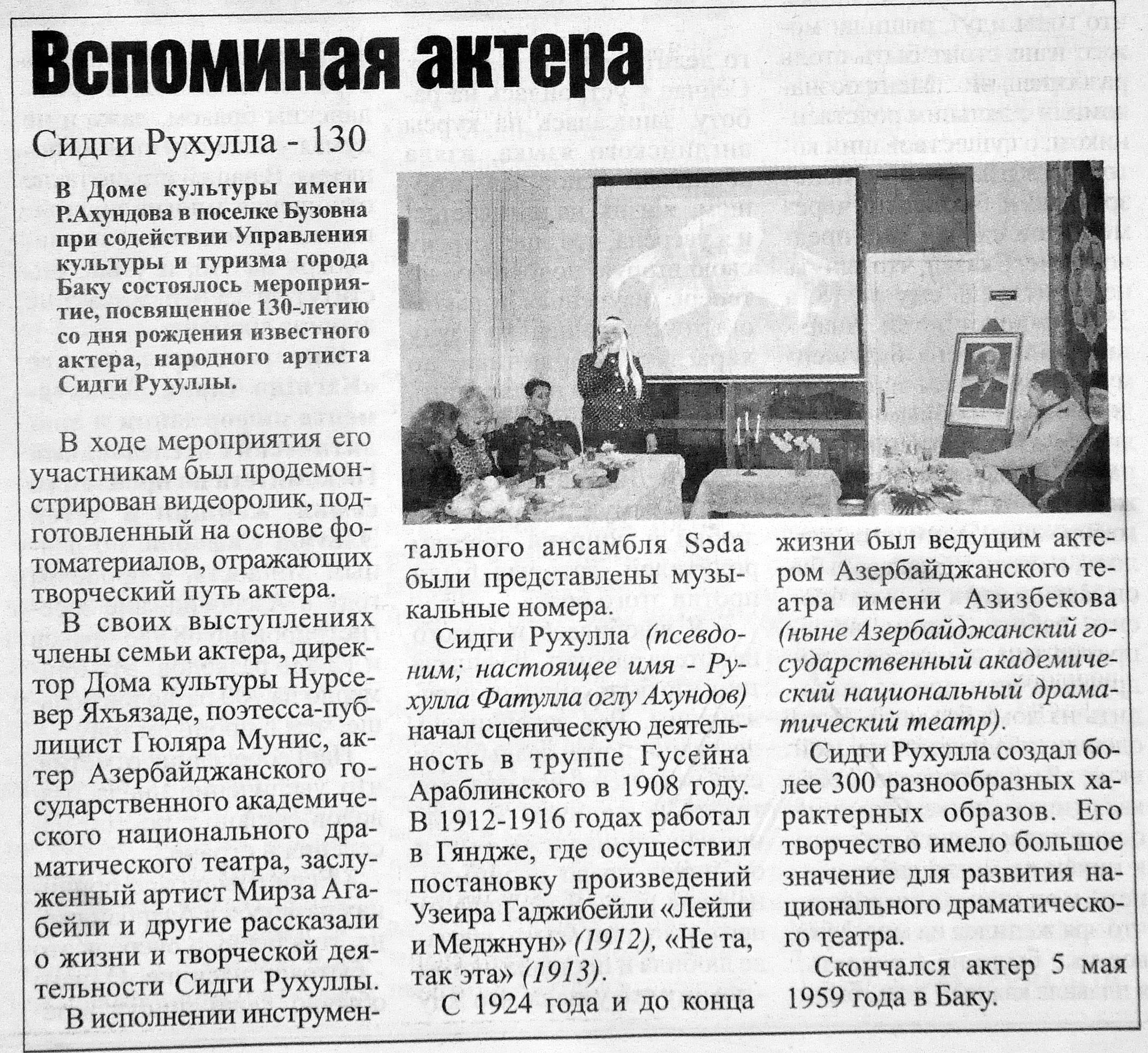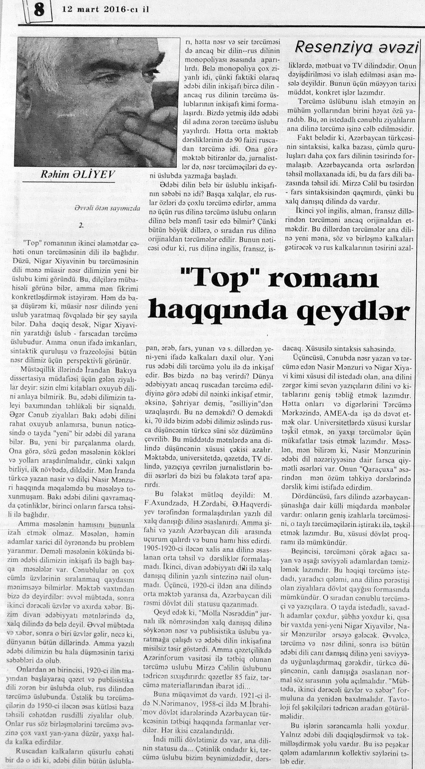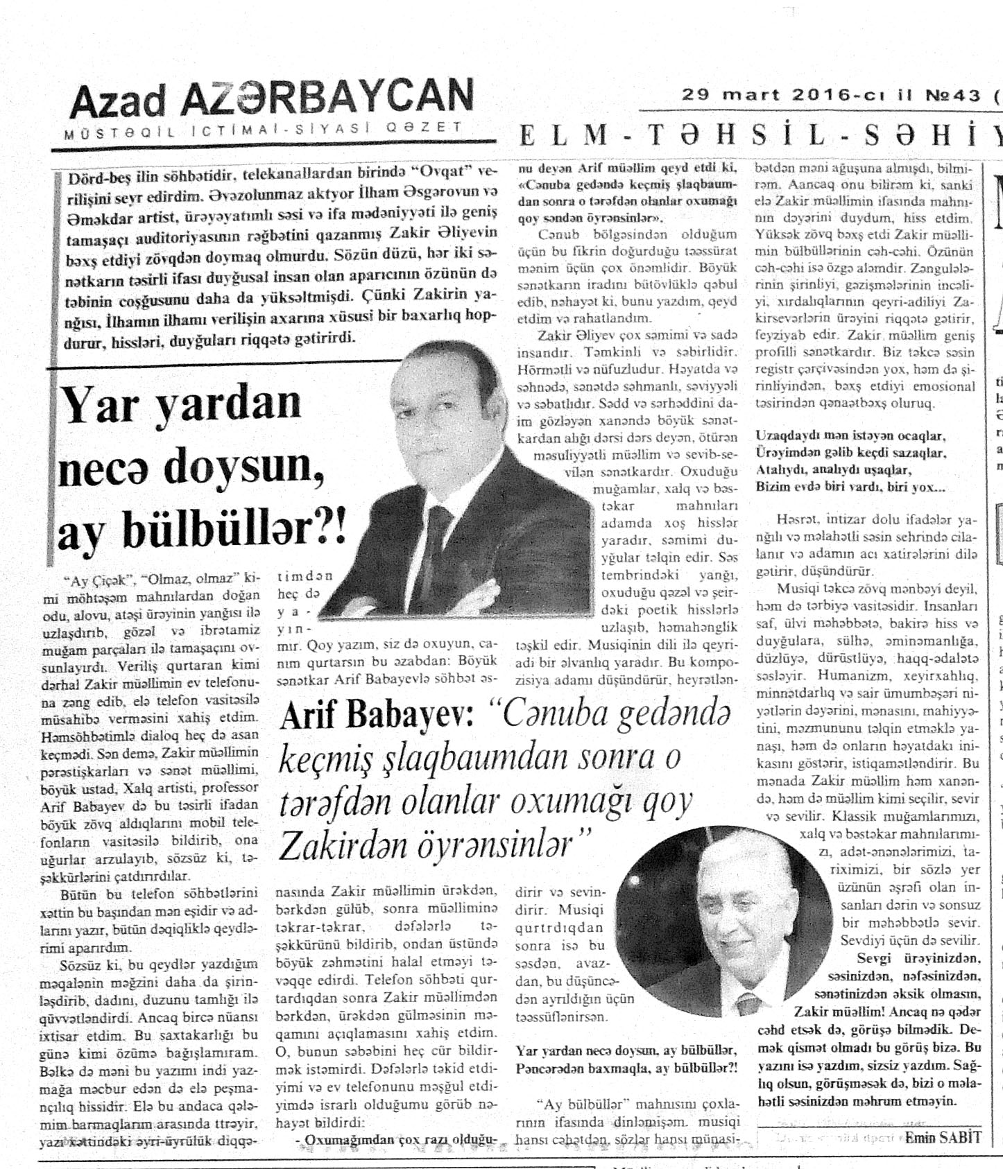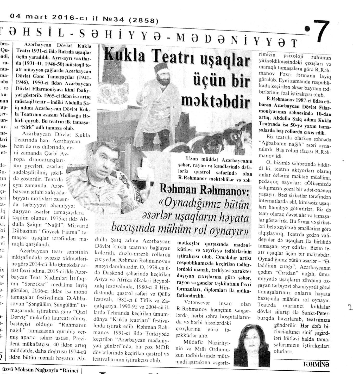 971. Алиева, У. Великолепная «Тоска» с участием звезд из трех стран на сцене Театра Оперы и Балета //Эхо.- 2016.-1 марта.- С.8. 972. Вспоминая актера: Сидги Рухулла – 130 //Каспiй.- 2016.-30 марта.- С.11. 973. Нейматов, А. Азер Паша Нейматов, народный артист Азербайджана: «Режиссура - ремесло практическое» /провела беседу В.Резникова //Азербайджанские известия.- 2016.-12 марта.- С.3.