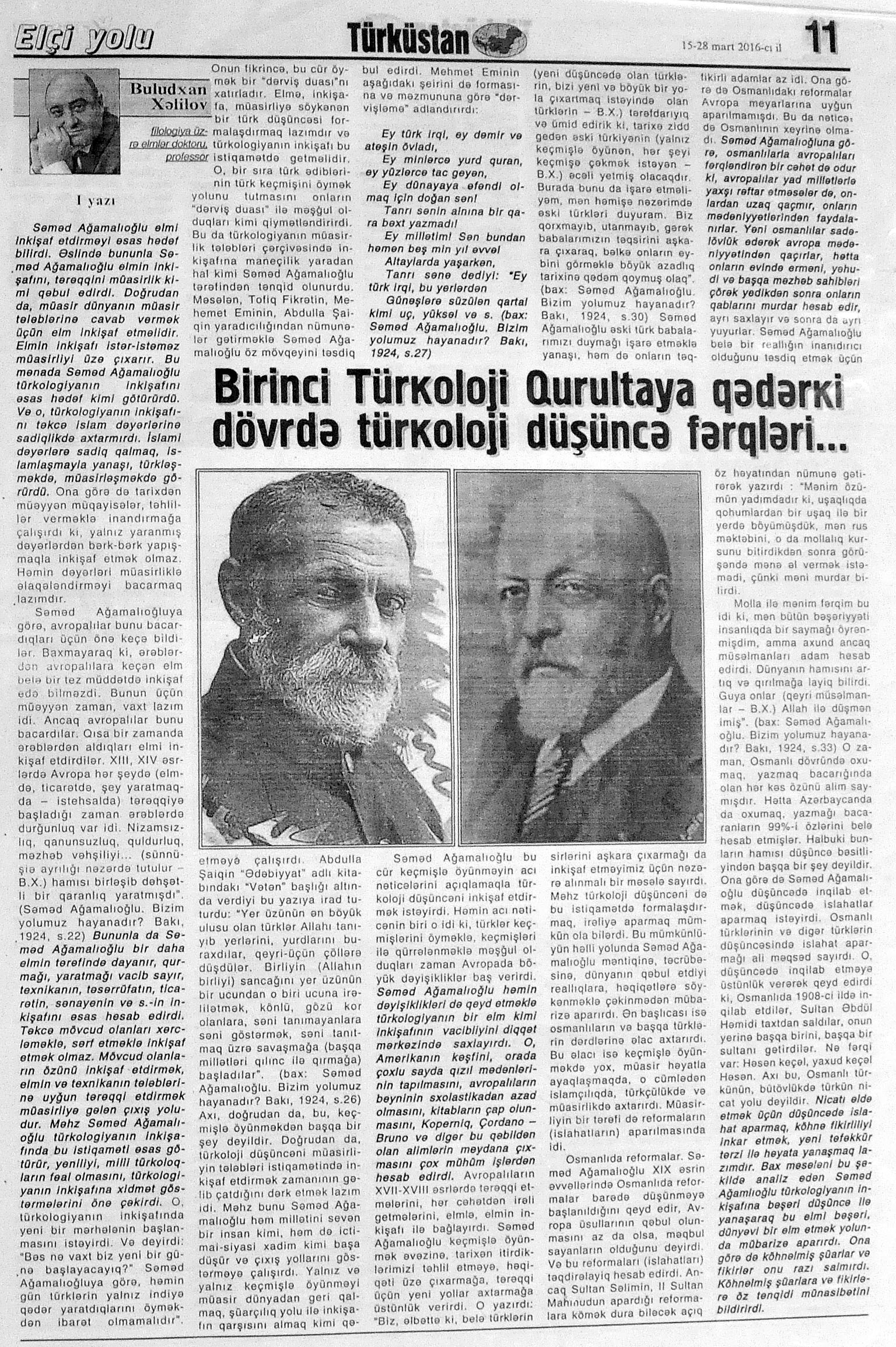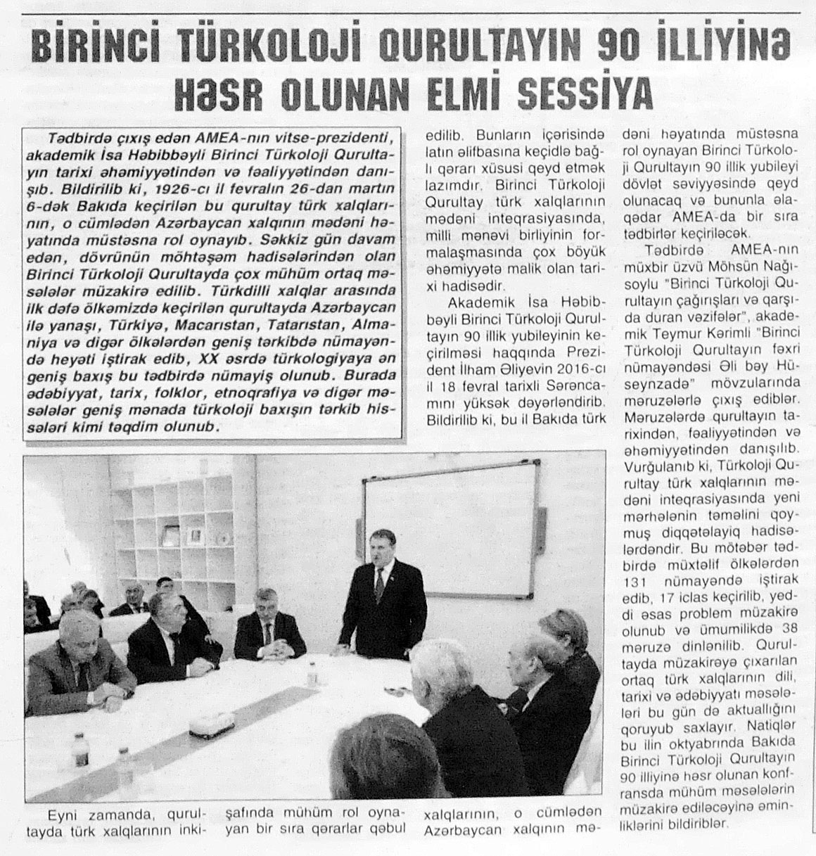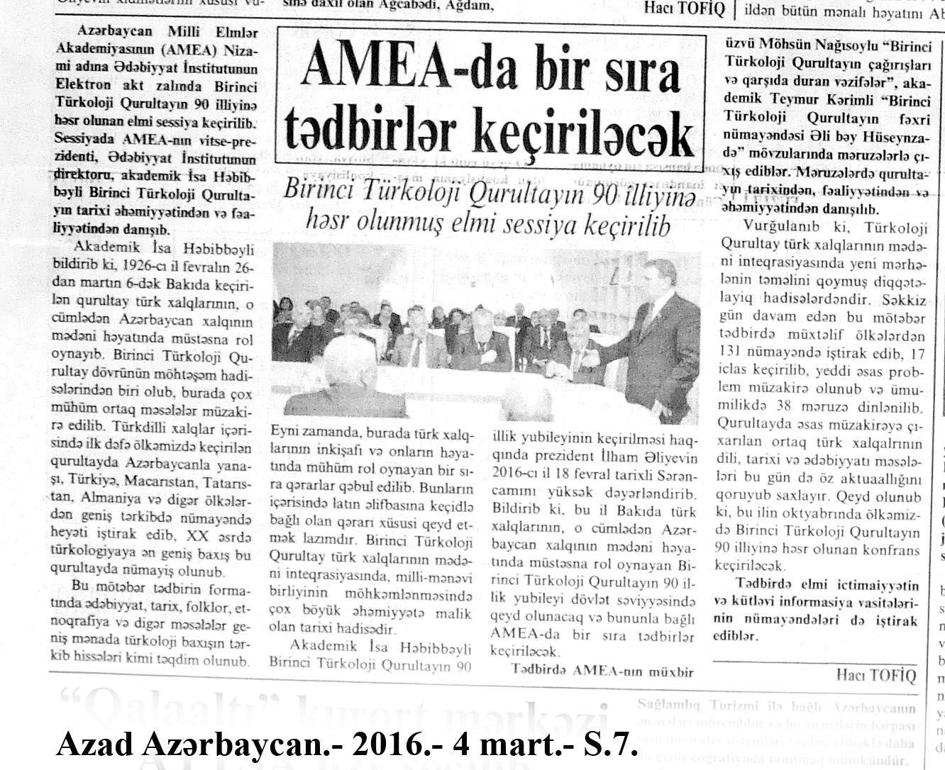 123. Birinci Türkoloji qurultayın 90 illiyinə həsr olunan elmi sessiya //Elm.- 2016.- 11 mart.- S.3. 124. Birinci Türkoloji Qurultayın 90 illiyinə həsr olunan elmi sessiya keçirilib:[AMEA-nın Nizami adına Ədəbiyyat İnstitutunda] //Ədəbiyyat qəzeti.- 2016.- 5 mart.- S.15. 125. Xəlilov, B. Birinci Türkoloji Qurultaya qədərki dövrdə türkoloji düşüncə fərqləri...: I Yazı //Türküstan.- 2016.- 15-28 mart.- S.11. 126. Xəlilov, B. Birinci Türkoloji Qurultaya qədərki dövrdə türkoloji düşüncə fərqləri...: II Yazı // Türküstan 2016.- 29 mart.- S.11. 127. Salmanlı, R. Türk xalqlarının həmrəyliyinə xidmət edən tarixi hadisə: [1926-cı ildə Bakıda keçirilmiş Birinci Türkoloji Qurultay haqqında] //Azərbaycan.- 2016.- 20 mart.- S.4. 128. Tofiq, H. AMEA-da bir sıra tədbirlər keçiriləcək: Birinci Türkoloji Qurultayın 90 illiyinə həsr olunmuş elmi sessiya keçirilib //Azad Azərbaycan.- 2016.- 4 mart.- S.7; Xalq cəbhəsi.- 2016.- 4 mart.- S.14.