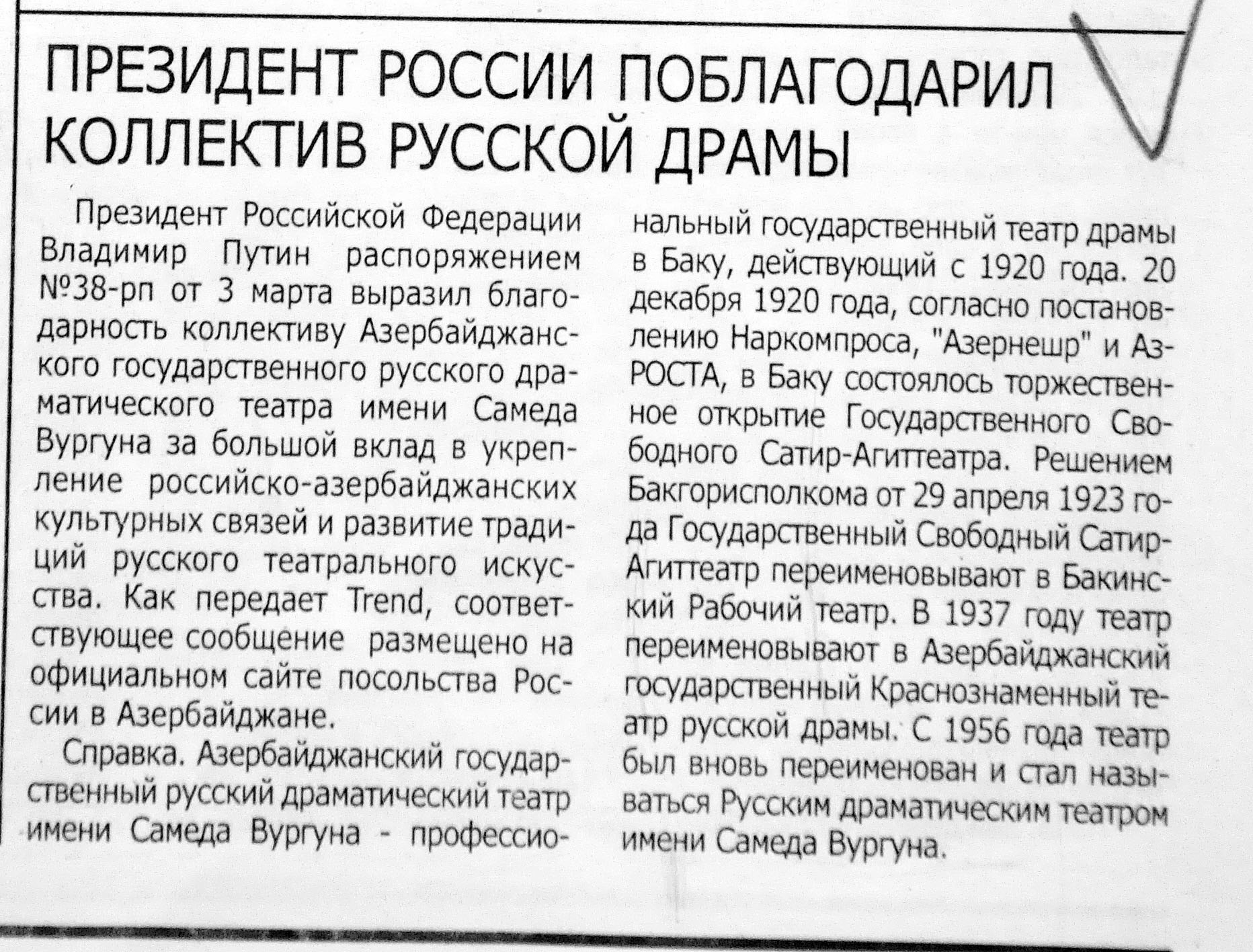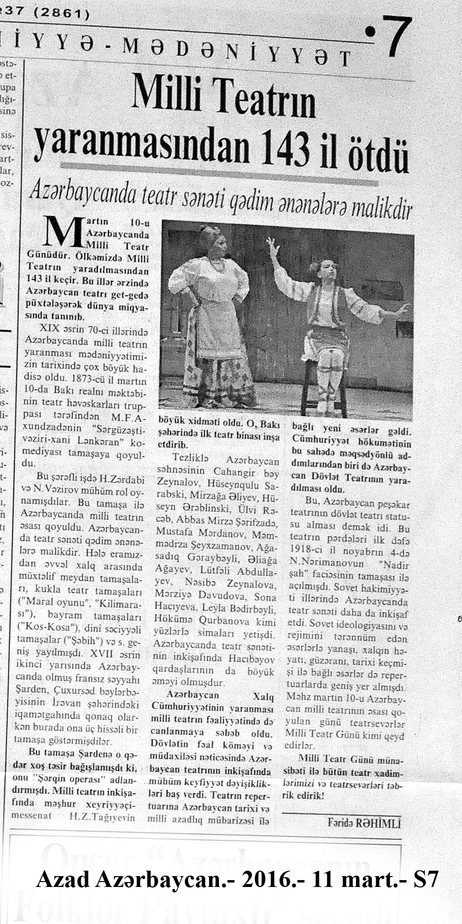 974. Алиева,У. «Травиата» на сцене Театра Оперы и Балета //Эхо.- 2016.-31 марта.- С.8. 975. Баннаева, Н. Зрителю — от всего сердца: День Национального Театра был отмечен множеством интересных событий //Азербайджанские известия.- 2016.-12 марта.- С.3. 976. В Баку отметили Международный День Театра: [в РИКЦ] //Бакинский рабочий.- 2016.-30 марта.- С.5. 977. Нейматов, А. Летописец времени: Сегодня - День Национального Театра: [беседа с руководителем Азербайджанского Академического Драматического Театра А. Нейматовым] /провела З.Исмайлова //Каспiй.- 2016.-10 марта.- С.11.