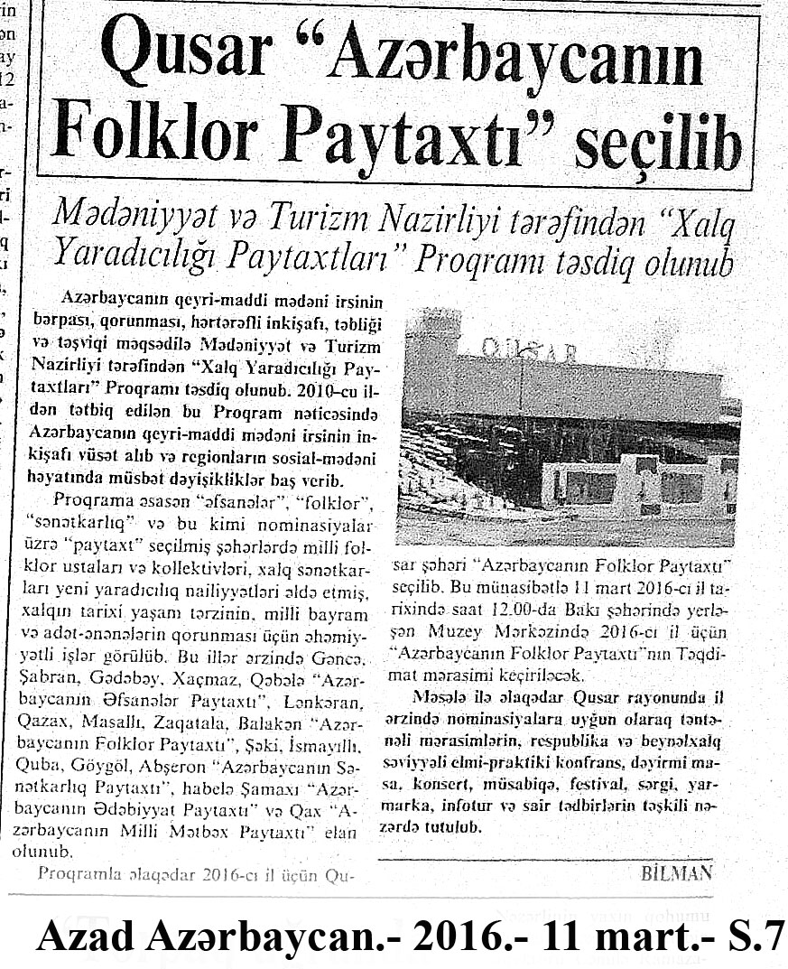 418. Ağsuda “Tərəkəmə çərşənbəsi” folklor festivalı: [rayonun Gəgəli kəndində] //Mədəniyyət.- 2016.- 16 mart.- S. 2. 419. Aşıqlar Birliyi bölgələrdə görüşlər keçirir //Mədəniyyət.- 2016.- 18 mart.- S. 7. 420. Bilman. Qusar “Azərbaycanın Folklor Paytaxtı” seçilib: Mədəniyyət və Turizm Nazirliyi tərəfindən “Xalq Yaradıcılığı Paytaxtları” proqramı təsdiq olunub //Azad Azərbaycan.- 2016.- 11 mart.- S.7. 421. Fərəcov, S. “Könül arzuladı, gəldim Göyçəyə...”: [ustad aşıq İslam Yusifov haqqında] //Mədəniyyət.- 2016.- 18 mart.- S.15. 422. İlyasoğlu, R. Qəlblərdə yaşayan ustad sənətkar: [Azərbaycan Aşıqlar Birliyində Aşıq Şəmşirin 110 illiyinin qeyd olunması haqqında] //Respublika.- 2016.- 20 mart.- S. 4. 423. İlyasov, V. Sındırılmış saz: [deportasiya və soyqırım hadisələrində həlak olmuş aşıq Nəcəf haqqında] //İki sahil.- 2016.- 29 mart.- S.14. 424. Qusar 2016-cı il üçün “Azərbaycanın Folklor Paytaxtı” seçilib // Mədəniyyət 2016.- 11 mart.- S. 9.