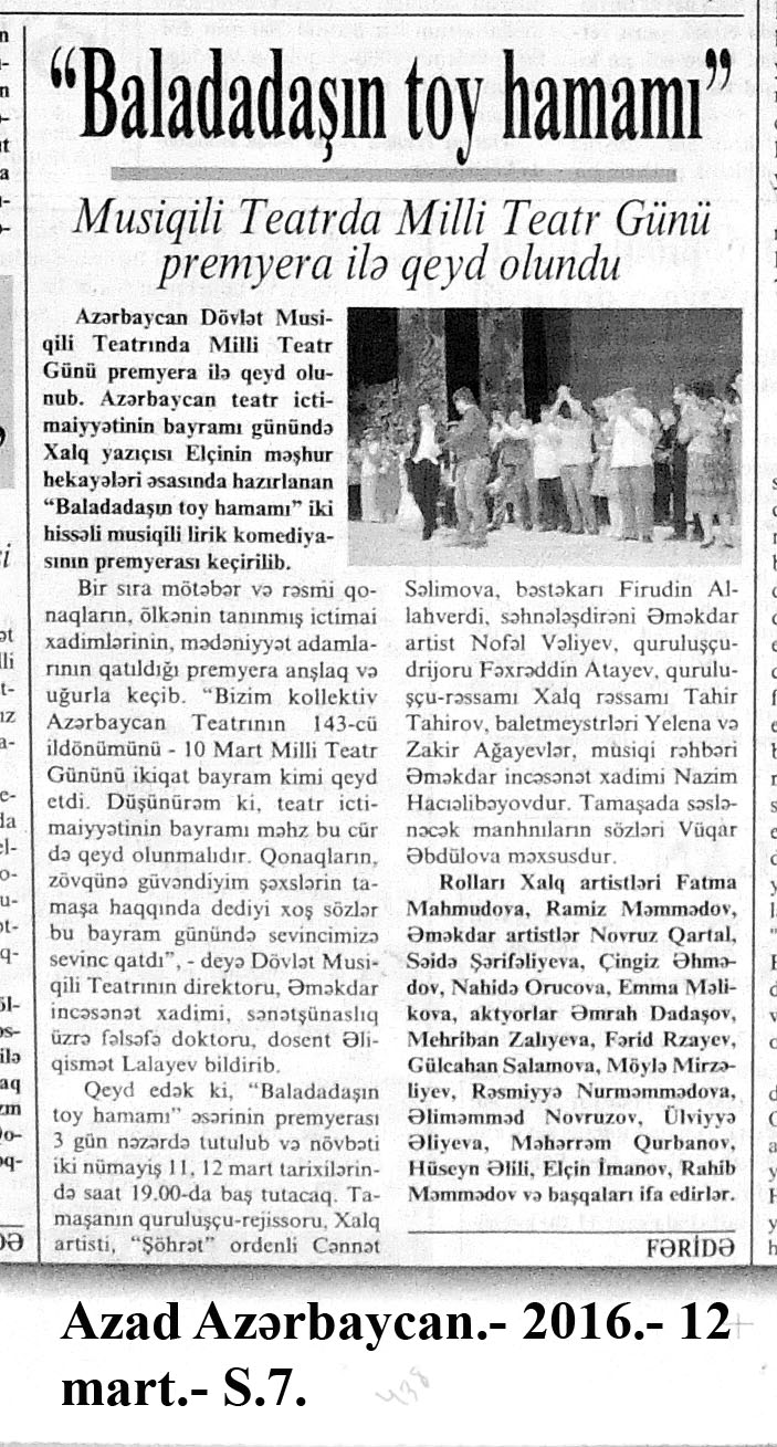 480. Əliyeva, K. Milli Teatr Günündə bölğə teatrlarına paytaxtdan bir nəzər //Kaspi.- 2016.- 10 mart.- S.11. 481. Fəridə. “Baladadaşın toy hamamı”: Musiqili Teatrda Milli Teatr Günü premyera ilə qeyd olundu: [Xalq artisti Cənnət Səlimovanın hazırladığı eyniadlı tamaşa haqqında] //Azad Azərbaycan.- 2016.- 12 mart.- S. 7; 525-ci qəzet.- 2016.- 15 mart.- S. 7; Mədəniyyət.- 2016.- 11 mart.- S. 2; Mədəniyyət.- 2016.- 16 mart.- S. 7. 482. İrəvan teatrında Milli Teatr Günü qeyd olunub // Mədəniyyət.- 2016.- 11 mart.- S. 4. 483. Qax Kukla Teatrı balacaları yeni tamaşa ilə sevindirib //Mədəniyyət.- 2016.- 11 mart.- S. 4. 484. Qusar teatrında bayram proqramı: [Qusar Dövlət Ləzgi Dram Teatrında] //Mədəniyyət.- 2016.- 11 mart.- S. 4. 485. Lənkəranda Milli Teatr Günü: [Nəcəf bəy Vəzirov adına Lənkəran Dövlət Dram Teatrında] //Mədəniyyət.- 2016.- 11 mart.- S. 3. 486. Mingəçevirdə Milli Teatr Günü qeyd olunub: [Mingəçevir Dövlət Dram Teatrında] //Mədəniyyət.- 2016.- 16 mart.- S. 11. 487. Mirməmməd, G. 143 il öncə başlanan sənət yolu: Milli Teatr Günü teatr tədqiqatına həsr olunmuş konfrans və təltiflərlə yadda qaldı: [Azərbaycan Teatr Xadimləri İttifaqında keçirilən elmi-praktik konfrans haqqında] // Mədəniyyət.- 2016.- 11 mart.- S.3. 488. Musiqili Teatrda Milli Teatr Günü premyera ilə qeyd olundu: [Xalq yazıçısı Elçinin məşhur hekayələri əsasında Cənnət Səlimovanın hazırladığı “Baladadaşın toy hamamı” tamaşasının premyerası haqqında] // Üç nöqtə.- 2016.- 14 mart.- S.7. 489. Musiqili Teatrda premyera: “Baladadaşın toy hamamı”: [Xalq artisti Cənnət Səlimovanın Elçinin hekayəsi əsasında hazırladığı musiqili komediya haqqında] //Mədəniyyət.- 2016.- 8 mart.- S. 7. 490. Rəhimli, F. Milli Teatrın yaranmasından 143 il ötür //Azad Azərbaycan.- 2016.- 11 mart.- S. 7. 491. Zümrüd. Lənkəranda Milli Teatr Günü qeyd olunub //Səs.- 2016.- 10 mart.- S.5.