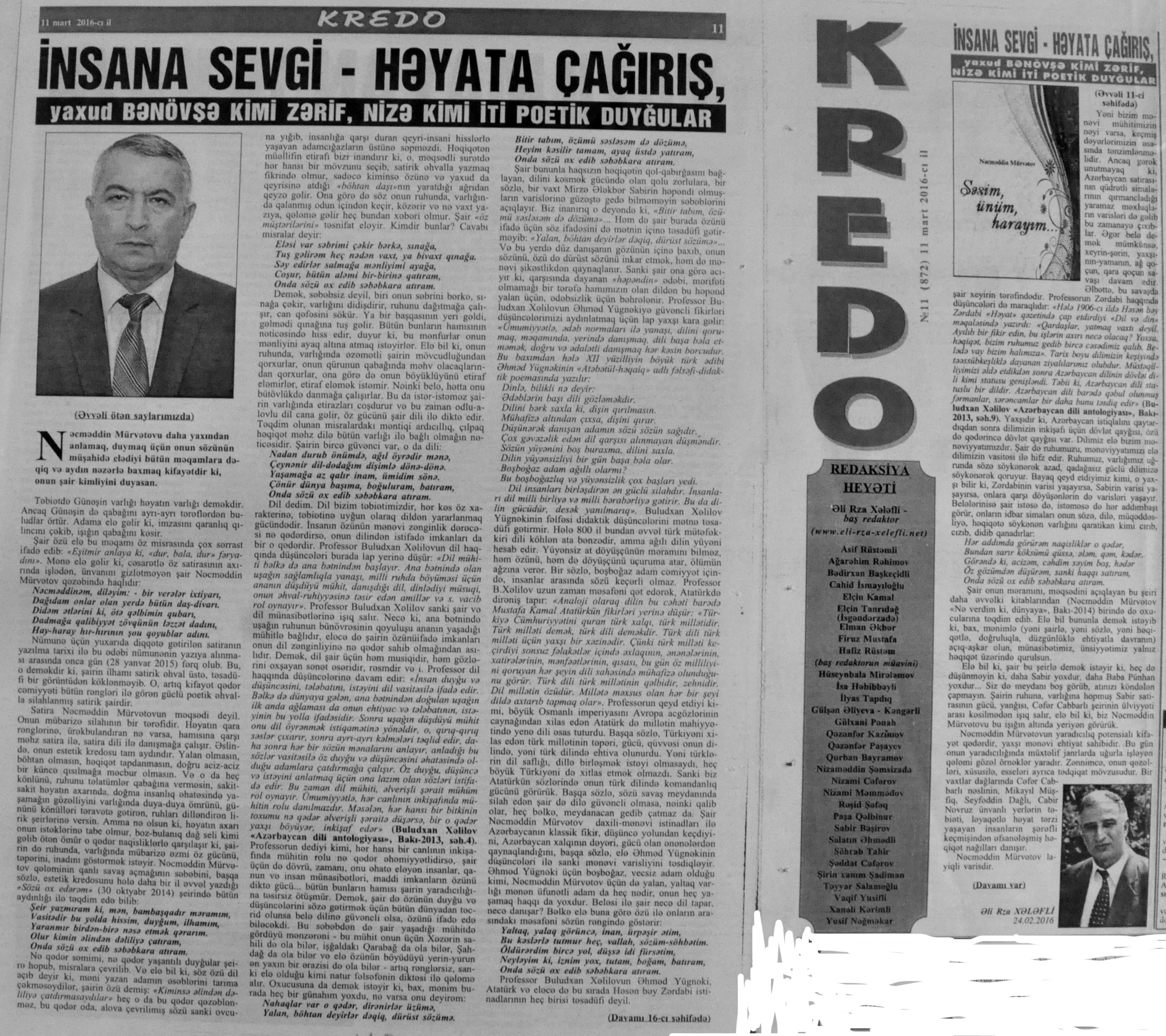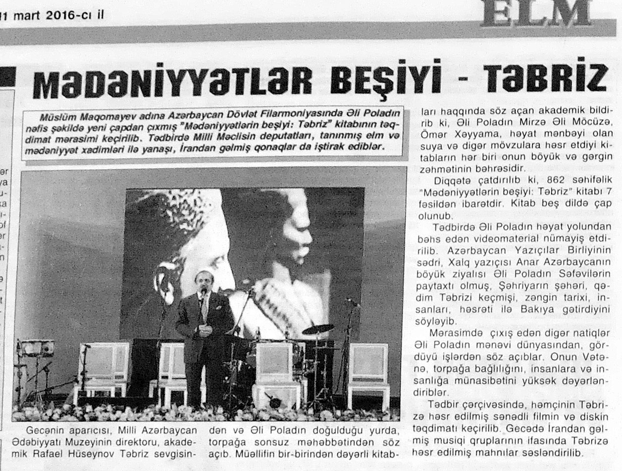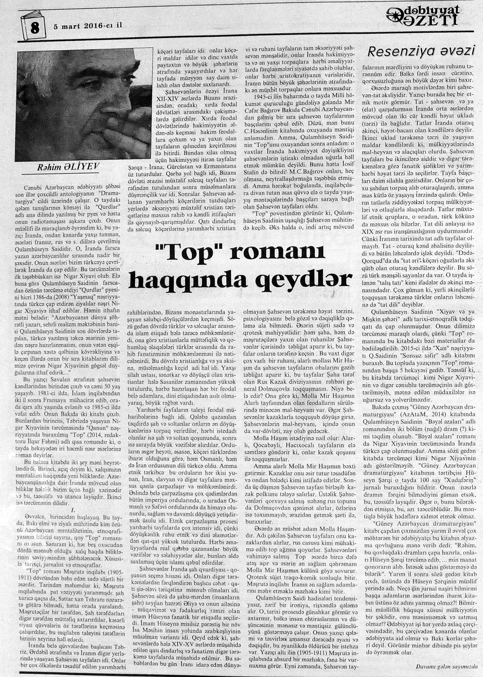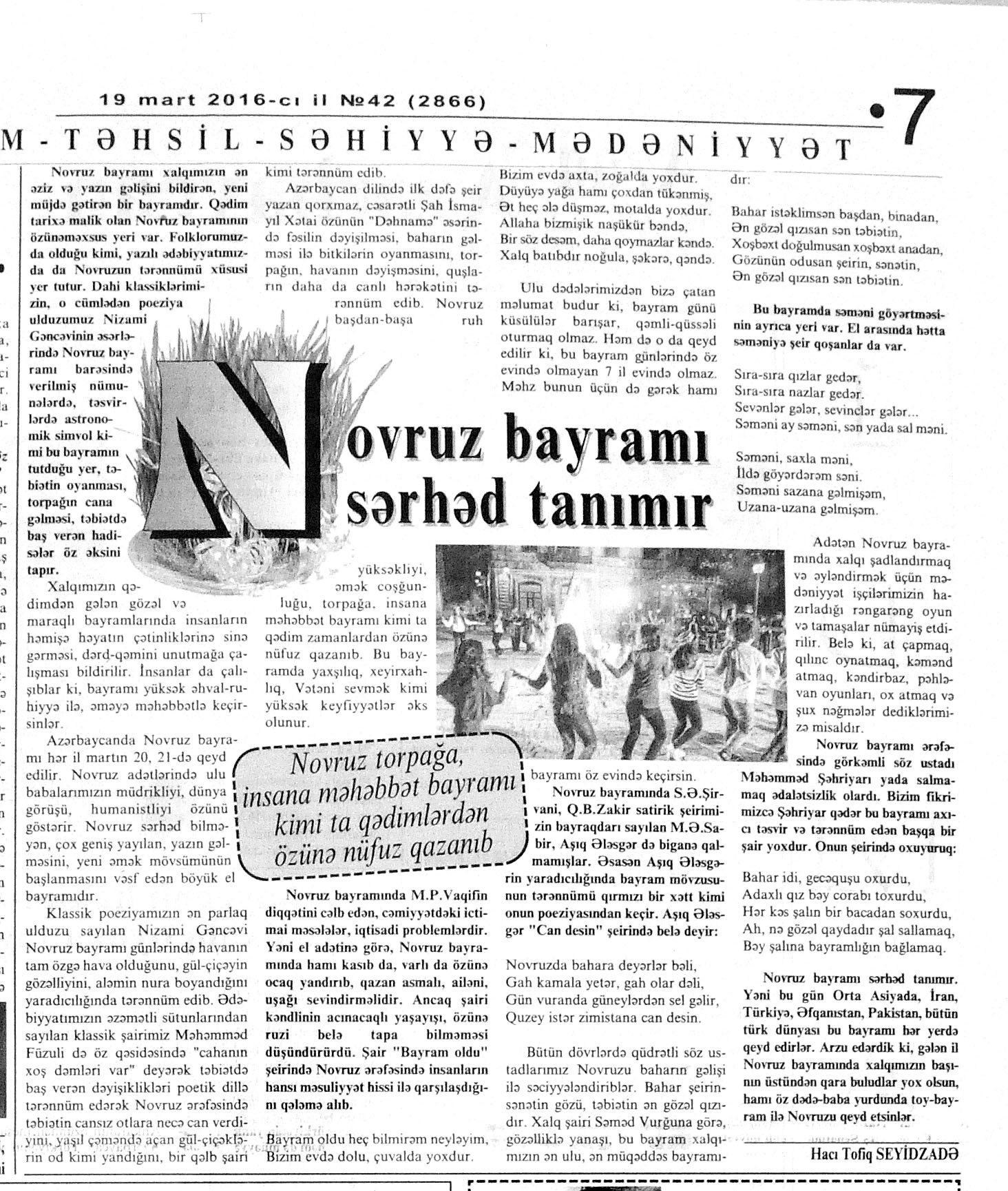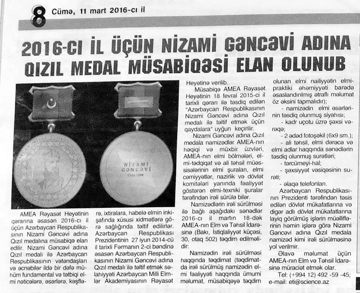 347. Gözəlov, P. Naxçıvan xanlığının iki rəngli bayrağı //Olaylar.- 2016.- 29 mart.- S.12. 348. 2016-cı il üçün Nizami Gəncəvi adına qızıl medal müsabiqəsi elan olunub //Elm.- 2016.- 11 mart.- S. 8. 349. İsmayıl. “Çecə vərəqləri”: 124 yaşlı satirik “Şəbnamə” qəzeti “Molla Nəsrəddin”dən öncə nəşr olunub //Şərq.- 2016.- 18 mart.- S.11. 350. Verdiyev, E. “Elə medallar var ki, onları özüm bərpa edirəm”: [gənc kolleksiyaçı Elçibəy Verdiyevlə müsahibə] /müsahibəni apardı Tural Turan //Həftə içi.- 2016.- 17 mart.- S.4.