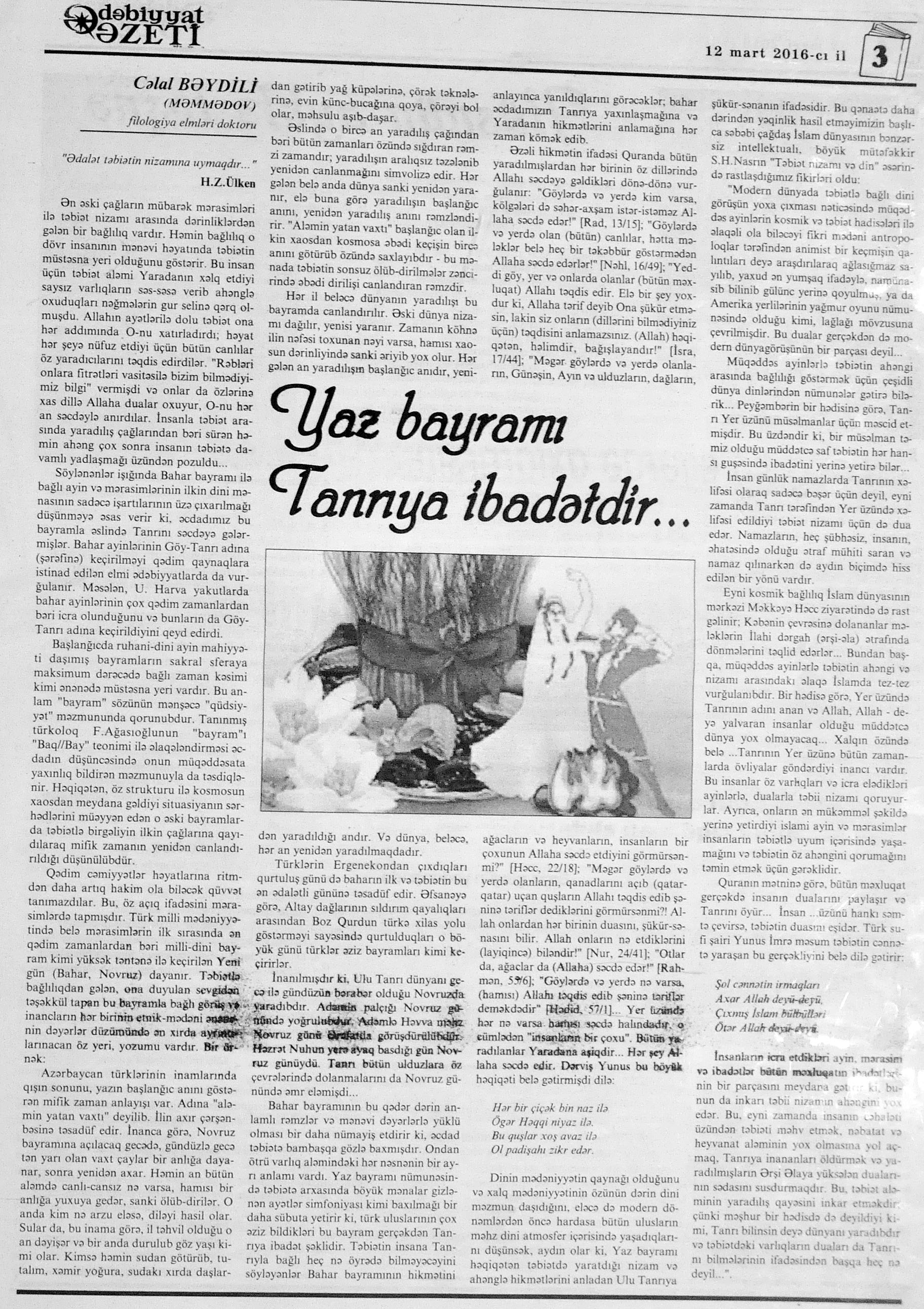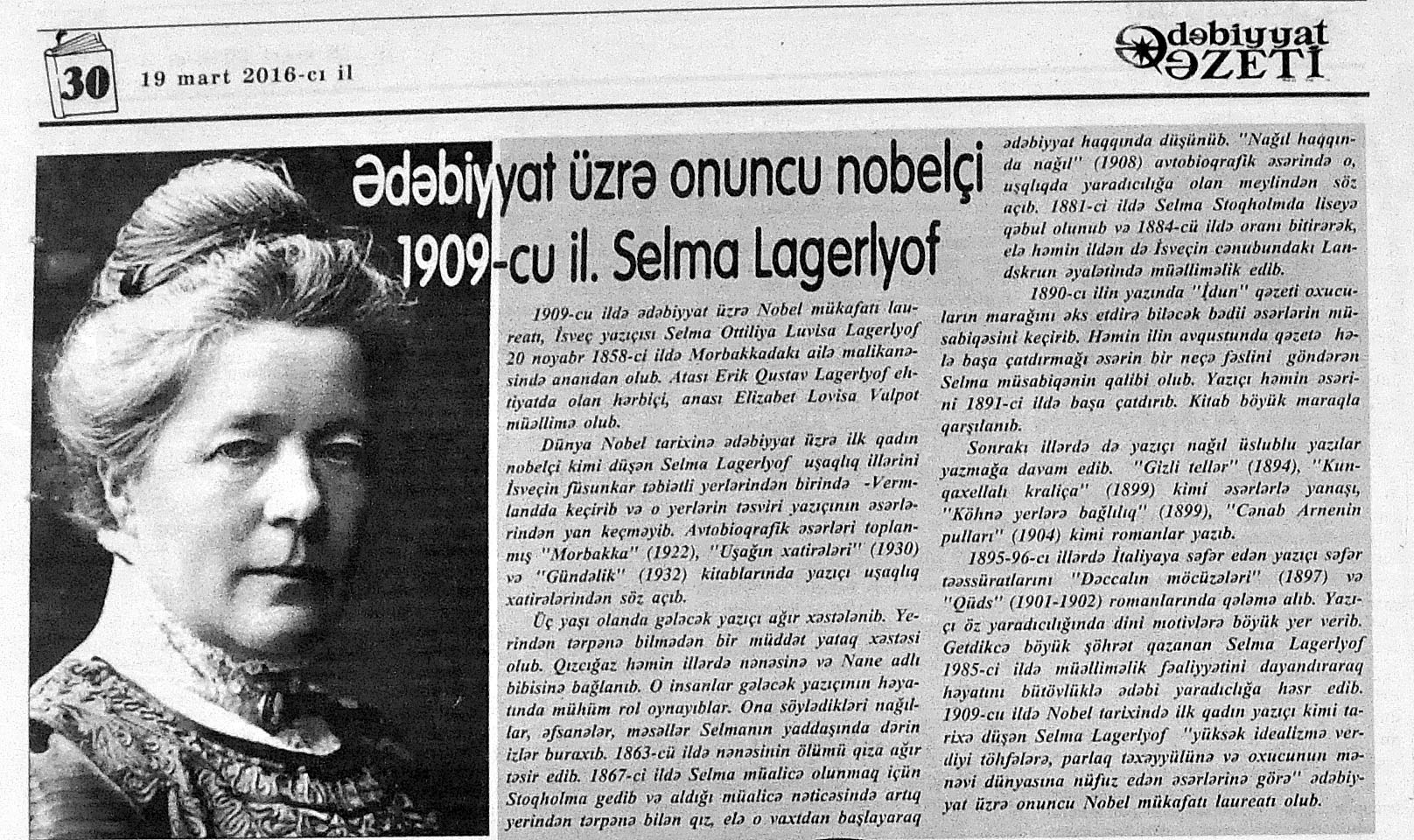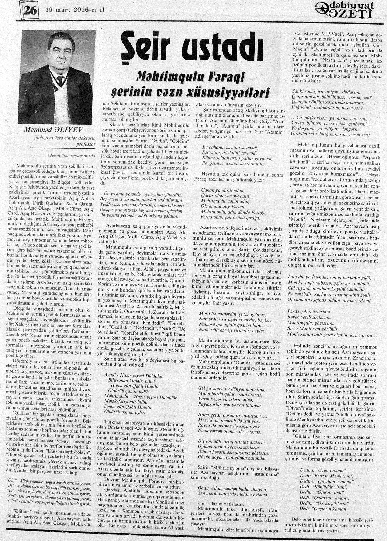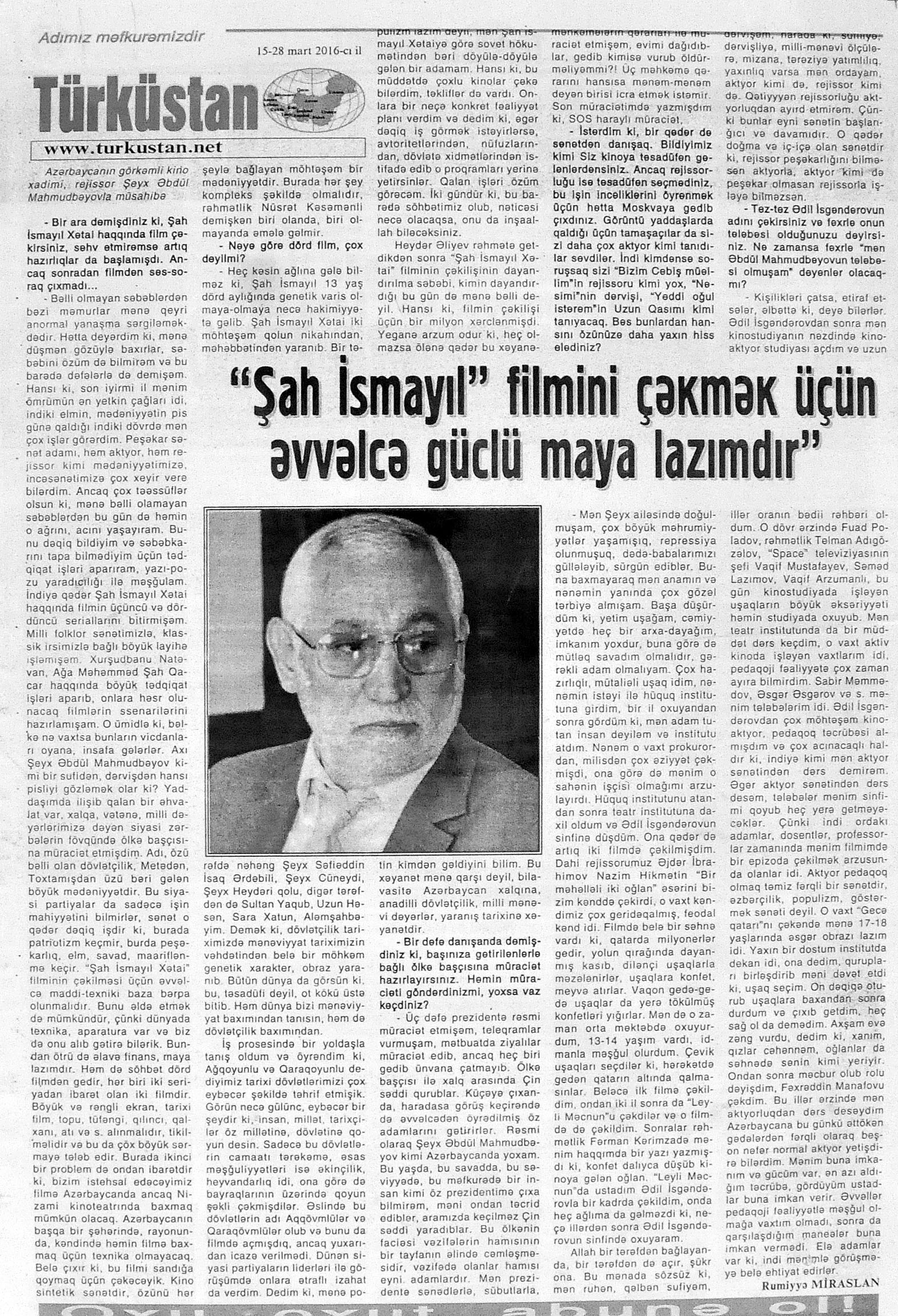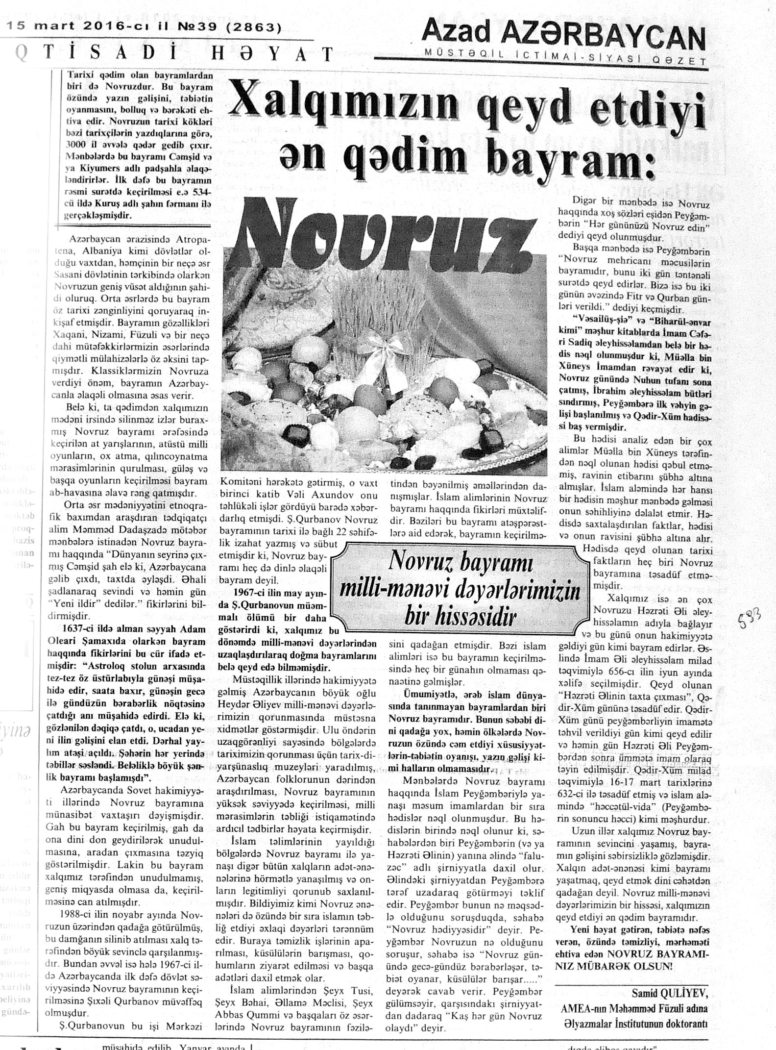 347. Gözəlov, P. Naxçıvan xanlığının iki rəngli bayrağı //Olaylar.- 2016.- 29 mart.- S.12. 348. 2016-cı il üçün Nizami Gəncəvi adına qızıl medal müsabiqəsi elan olunub //Elm.- 2016.- 11 mart.- S. 8. 349. İsmayıl. “Çecə vərəqləri”: 124 yaşlı satirik “Şəbnamə” qəzeti “Molla Nəsrəddin”dən öncə nəşr olunub //Şərq.- 2016.- 18 mart.- S.11. 350. Verdiyev, E. “Elə medallar var ki, onları özüm bərpa edirəm”: [gənc kolleksiyaçı Elçibəy Verdiyevlə müsahibə] /müsahibəni apardı Tural Turan //Həftə içi.- 2016.- 17 mart.- S.4.