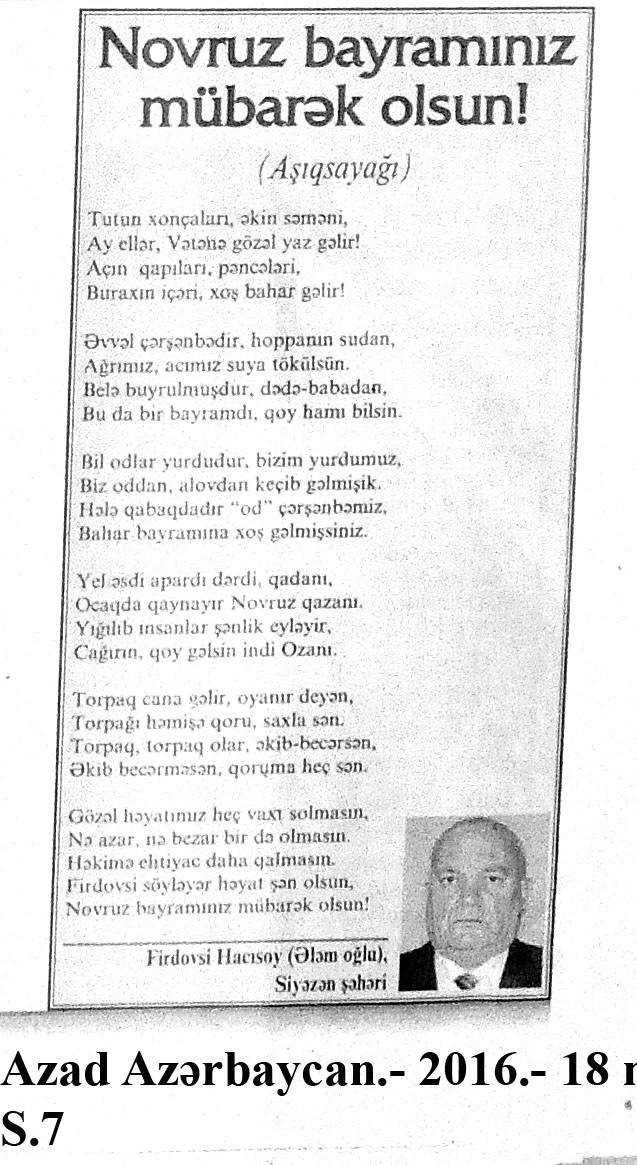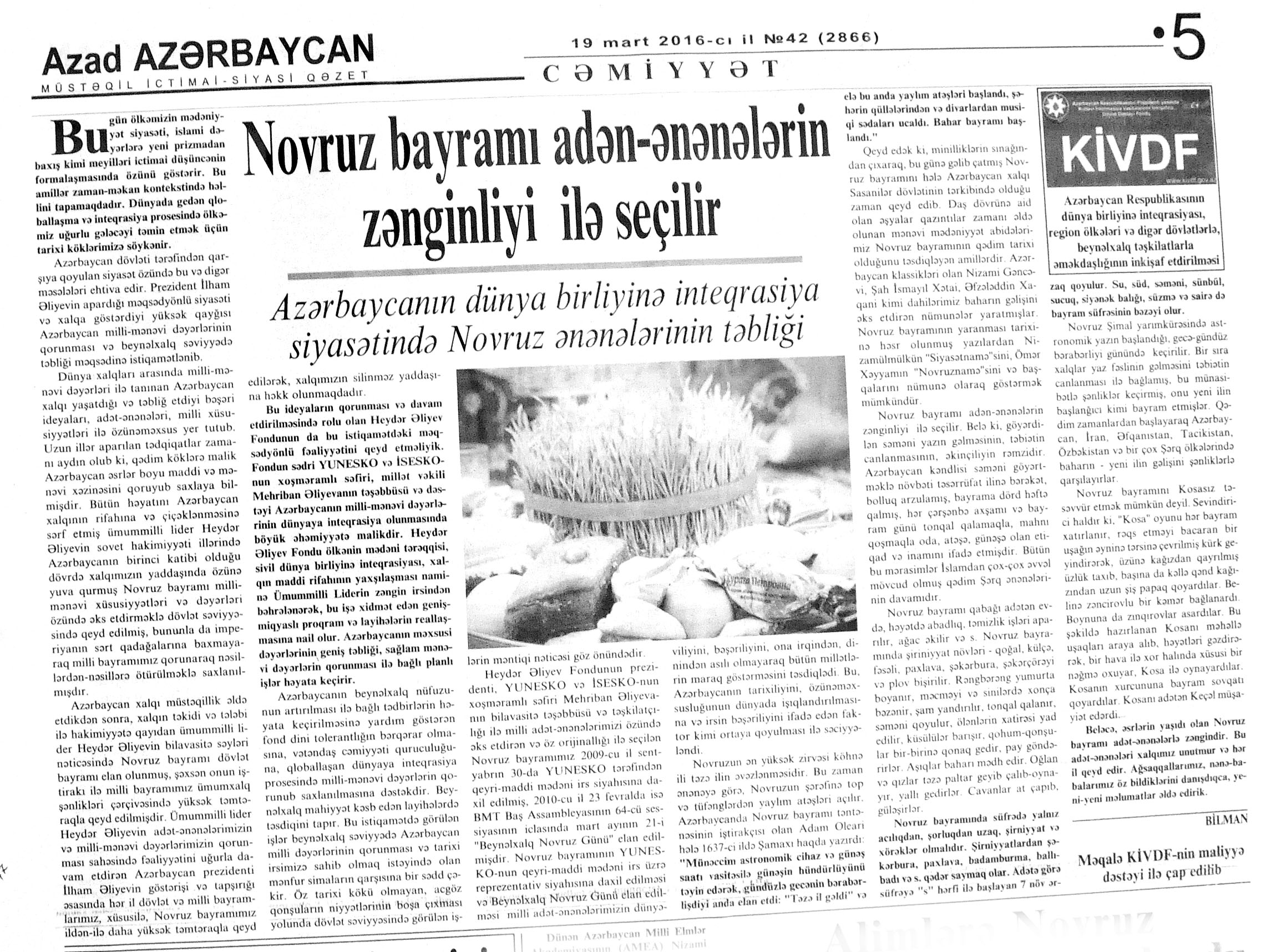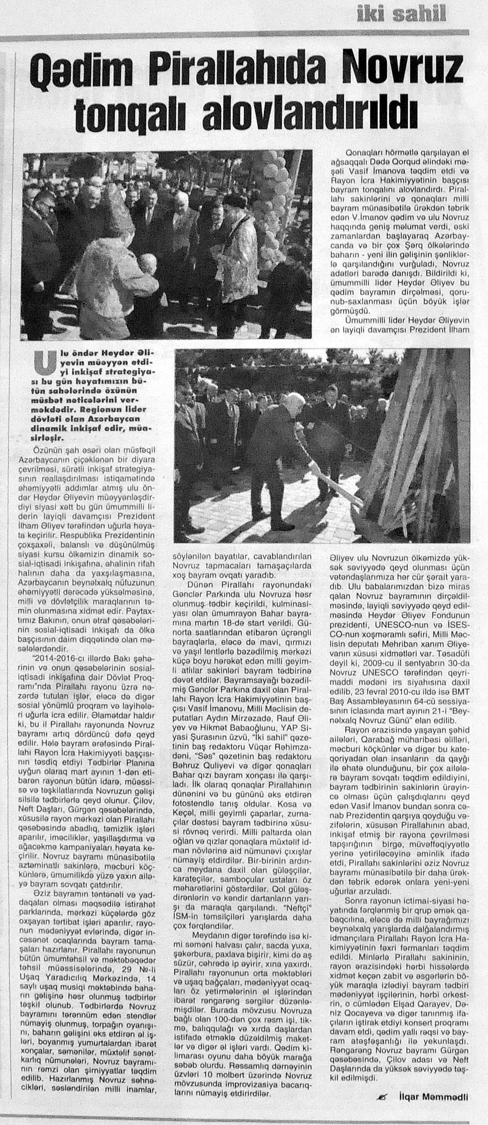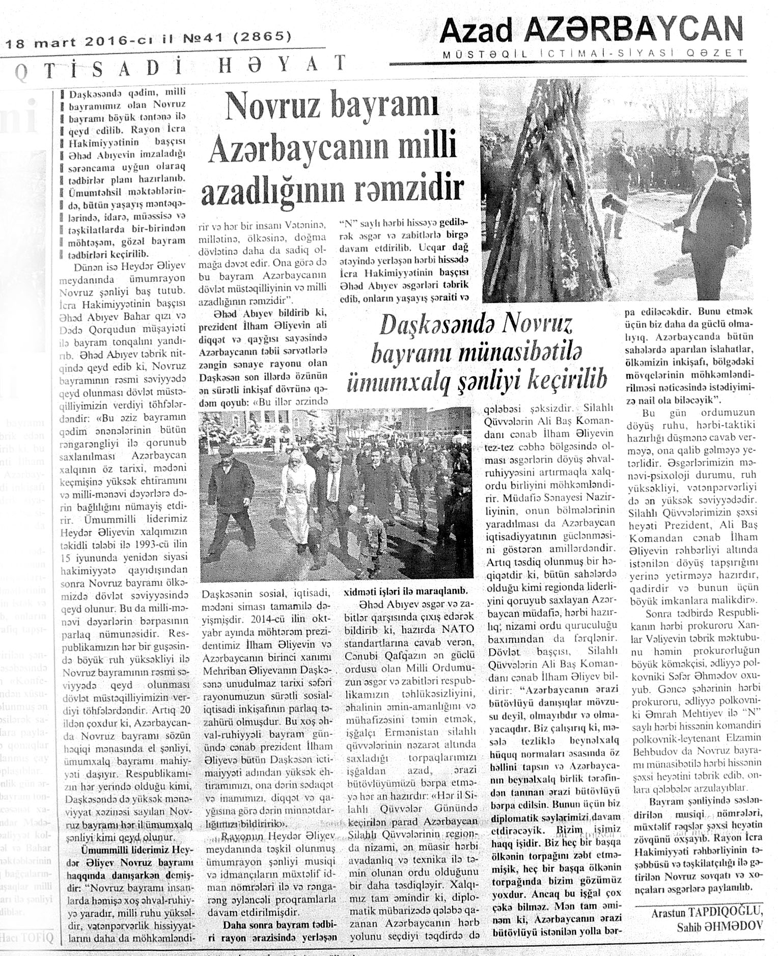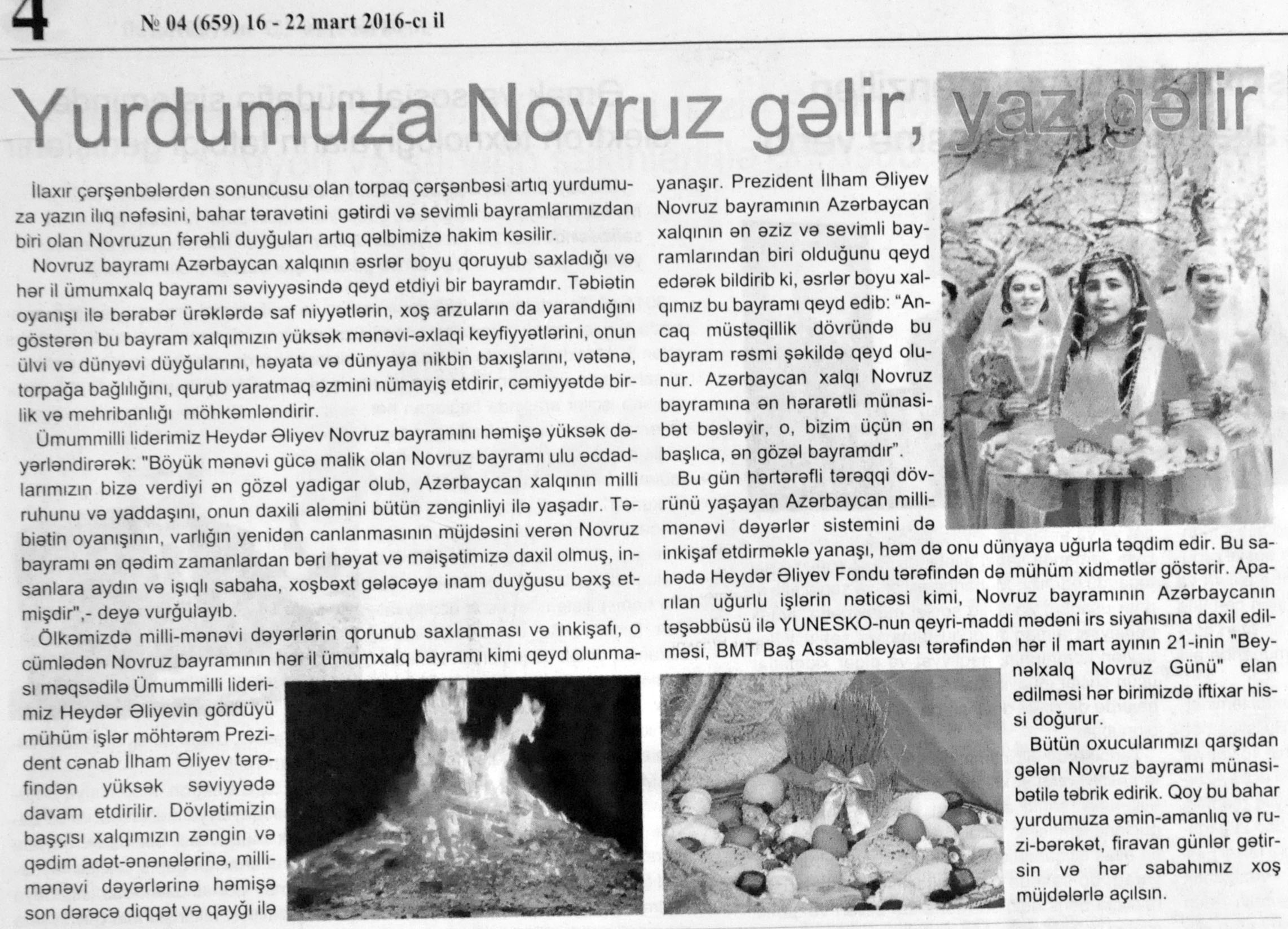 165. Əliyev, İ. Novruz bayramı münasibətilə Azərbaycan xalqına təbrik //Azərbaycan.- 2016.- 17 mart.- S.1. 166. Əliyev, İ. Prezident İlham Əliyev Novruz bayramı münasibətilə ümumxalq şənliyində iştirak edib: Prezident İlham Əliyevin nitqi //Azərbaycan.- 2016.- 20 mart.- S.1, 2. __________