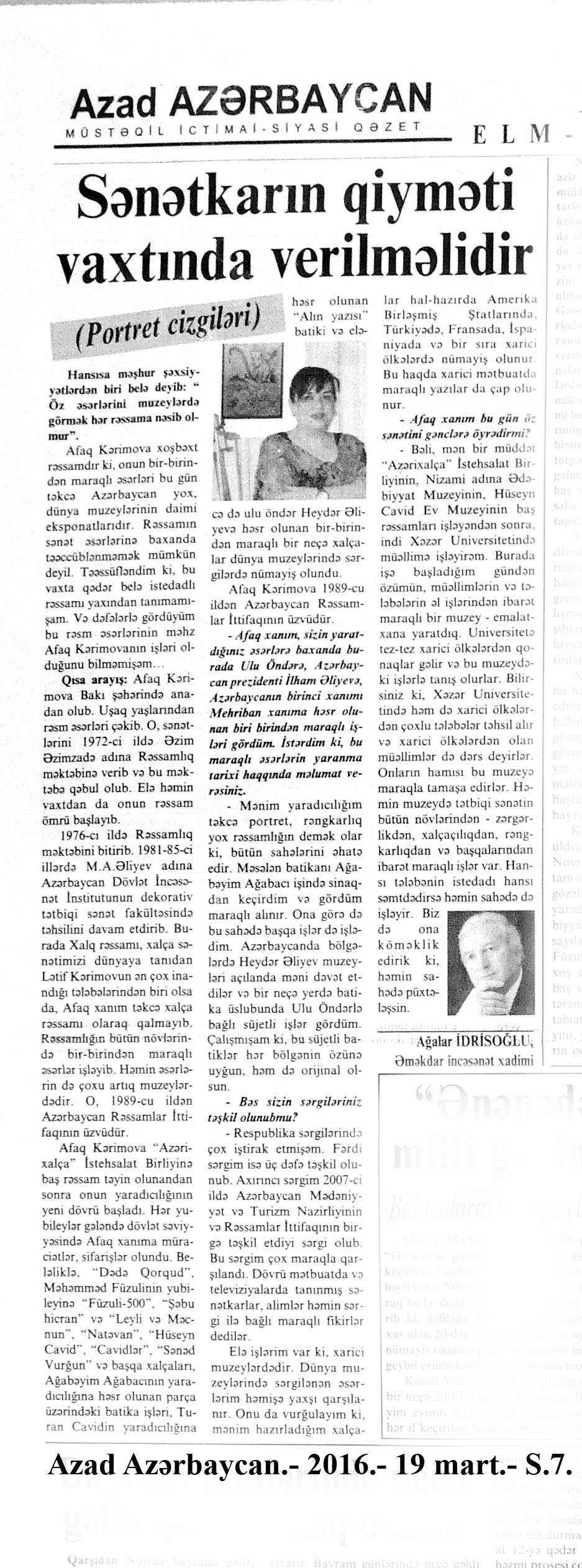 311. Azərbaycanlı rəssamın əsərləri “İnternational Art”da: [Nigar Nərimanbəyovanın əsərlərinin Parisdə nümayişi haqqında] //525-ci qəzet.- 2016.- 10 mart.- S. 7. 312. Dost ölkədə yaşayan sənət xatirəsi: Daşkənddə azərbaycanlı rəssam Yusif Hüseynovun barelyefi və fərdi sərgisi açılıb //Mədəniyyət.- 2016.- 8 mart.- S. 16. 313. Əlifoğlu, Ş. Ülkərin yaşamaq ehtirası: [gənc rəssam Ülkər Zeynalovanın “Mənim fırçam sehirlidir” kitabı haqqında] //Kredo.- 2016.- 25 mart.- S.7. 314. Əliyev, Z. Azərbaycan rəssamının Gürcüstan uğuru: Xalq rəssamı Fərhad Xəlilovun yaradıcılığı haqqında //Kaspi.- 2016.- 19-28 mart.- S. 24. 315. Əliyev, Z. Mir Möhsün Nəvvabın sənət dünyası: “Ədəbiyyat qəzeti”nin gözəl sənətlər ensiklopediyası //Ədəbiyyat qəzeti.- 2016.- 12 mart.- S.29. 316. Əliyev, Z. Şəbəkə sənəti: ənənədən müasirliyə: [sənətkar Tofiq Rəsulov haqqında] //Mədəniyyət.- 2016.- 2 mart.- S. 12. 317. Fərhad Xəlilovun Tbilisidə fərdi sərgisi açılıb //525-ci qəzet.- 2016.- 3 mart.- S.7. 318. Hərbi liseydə Səttar Bəhlulzadə ilə bağlı görüş //525-ci qəzet.- 2016.- 31 mart.- S. 7. 319. On iki rəssamın “12?” adlı sərgisi: [Müasir İncəsənət Mərkəzinin sərgi salonunda] //Yeni Azərbaycan.- 2016.- 3 mart.- S.7. 320. Özbəkistanda azərbaycanlı rəssamın xatirəsi əbədiləşdirilib:[ Yusif Hüseynovun 70 illiyi münasibətilə] //525-ci qəzet.- 2016.- 5 mart.- S. 12. 321. Rəhimov, Y. Əsrin bəlasından gəncliyimizi qoruyaq //Mədəniyyət.- 2016.- 30 mart.- S. 13. 322. Soltan. Miniatür sərgisi açılıb: [“Azad Azərbaycan” teleradio şirkətinin binasında rəssam Pərinisə Əsgərovanın əsərlərindən ibarət sərgi] //Mədəniyyət.- 2016.- 18 mart.- S.9. 323. Soltan. “Müsbət enerji”li sərgi: [“1969” qalereyasında Gürcüstanda yaşayan soydaşımız, rəssam Rizvan İsmayılın rəngkarlıq əsərlərindən ibarət eyniadlı sərginin açılışı haqqında] //Mədəniyyət.- 2016.- 8 mart.- S. 2; 525-ci qəzet.- 2016.- 10 mart.- S. 7. 324. Soltanlı, S. Düşündürən, duyğulandıran rəssam: “Yaratdıqlarımla həm sənətdən güc alıram, həm də başqalarına güc verirəm”: [rəssam Nana Nərimanbəyli haqqında] //Mədəniyyət.- 2016.- 2 mart.- S. 12. 325. Soltanlı, S. Nağıllar yaradan rəssam: Təsviri sənətin çağdaş mərhələsində: [Xalq rəssamı Arif Hüseynov haqqında] //Mədəniyyət.- 2016.- 30 mart.- S. 12. 326. Soltanlı, S. Nazim Məmmədbəyovun yubiley sərgisi: [Vəcihə Səmədova adına sərgi salonunda rəssamın 80 illiyi münasibətilə] //Mədəniyyət.- 2016.- 4 mart.- S. 6. 327. Soltanlı, S. “Təsviri sənət həftəsi” rəngarəng tədbirlərlə yadda qaldı: [Vəcihə Səmədova adına sərgi salonunda Mədəniyyət və İncəsənət Universitetinin rəssamlıq fakültəsi tələbələrinin əsərlərindən ibarət sərginin açılışı haqqında] //Mədəniyyət.- 2016.- 30 mart.- S. 7. 328. Suallı sərgi: On iki rəssamın sənət axtarışları: [Müasir İncəsənət Mərkəzində] //Mədəniyyət.- 2016.- 4 mart.- S. 16. 329. Sumqayıt Rəsm qalereyasında “Uşaq dünyası”: [Bülbül adına Uşaq İncəsənət məktəbi şagirdlərinin eyniadlı sərgisi haqqında] //Mədəniyyət.- 2016.- 30 mart.- S. 12. 330. Şükürlü, M. Bitib-tükənməyən “Müsbət enerji”: Rəssam Rizvan İsmayılın fərdi sərgisi parlaq təəssüratlarla yadda qaldı: [Səttar Bəhlulzadə adına Mərkəzi Sərgi Salonunda eyniadlı sərginin açılışı haqqında] //525-ci qəzet.- 2016.- 12 mart.- S. 15. 331. Tbilisidə Xalq rəssamı Fərhad Xəlilovun sərgisi: Xalq rəssamı Fərhad Xəlilovun əsərləri “Saatchi” qalereyasında təqdim olunacaq //Mədəniyyət.- 2016.- 4 mart.- S. 5. 332. “Uşaqlığın yuxuları”ndan “Sevgi oyuncaqları”nadək: Parisdə Azərbaycanlı rəssamın əsərləri nümayiş olunur: [Nigar Nərimanbəyovanın fərdi sərgisi haqqında] //Mədəniyyət.- 2016.- 8 mart.- S. 16. Bax: 215, 216