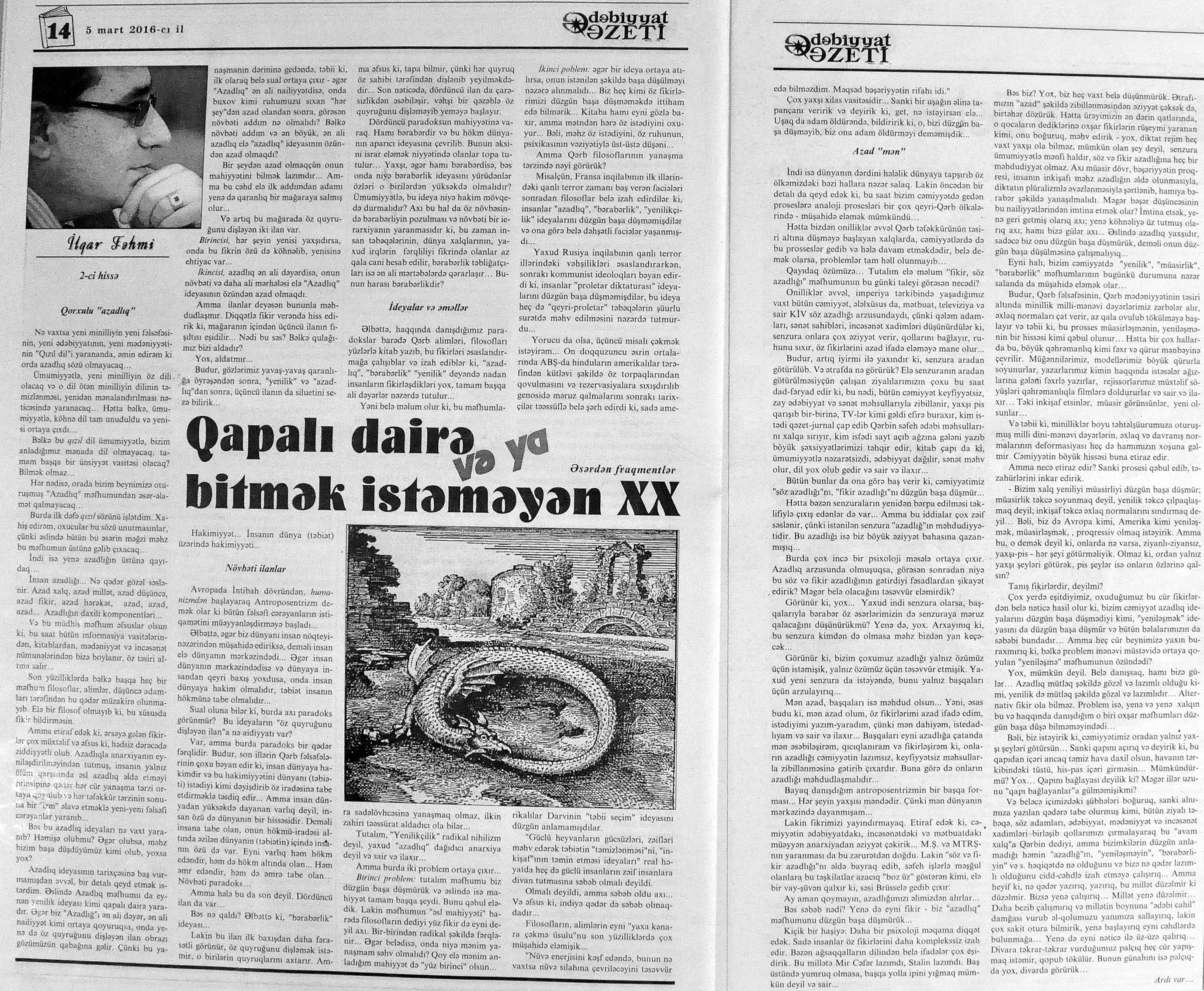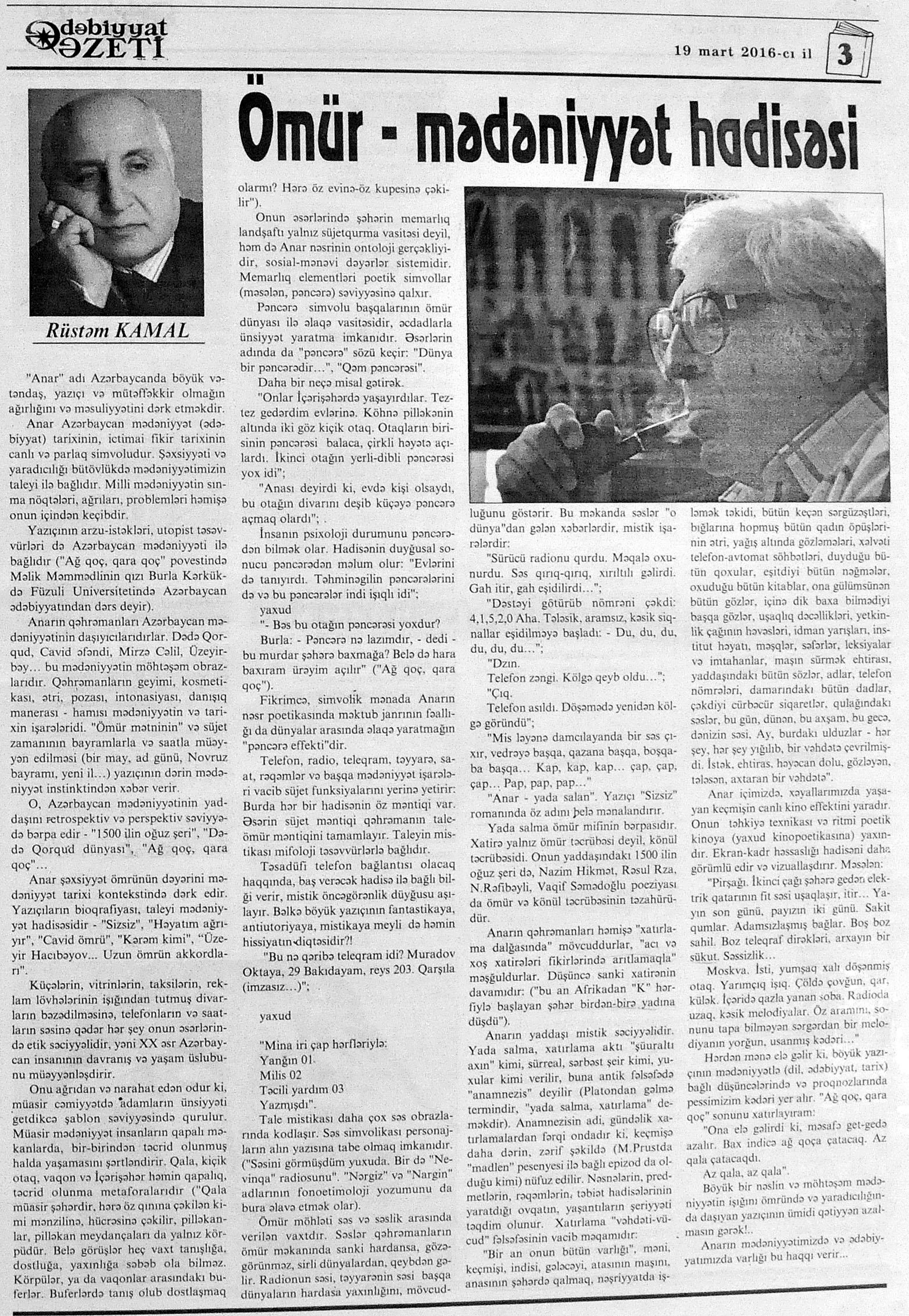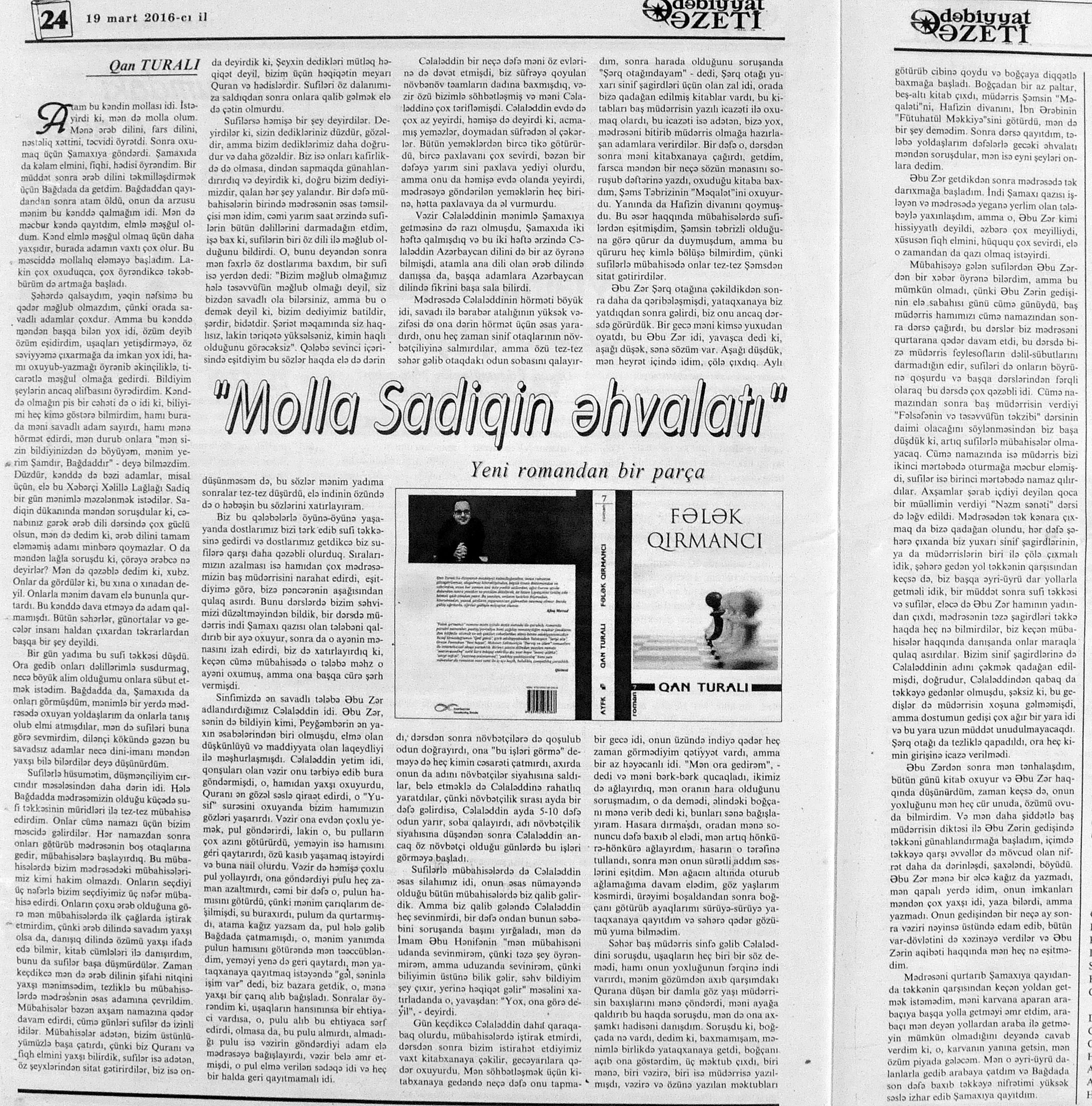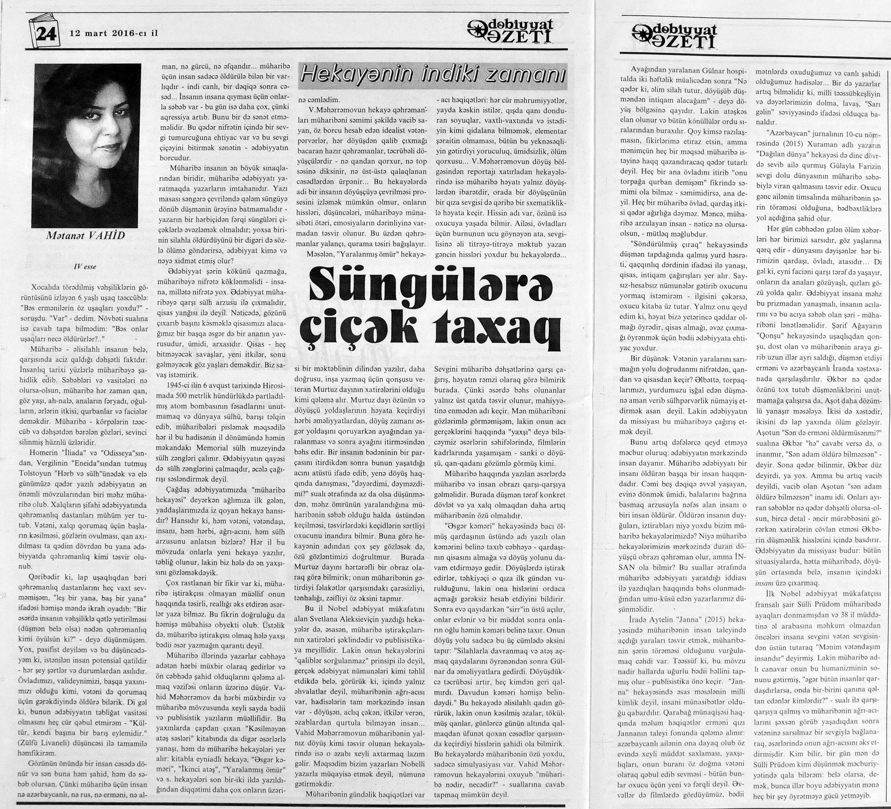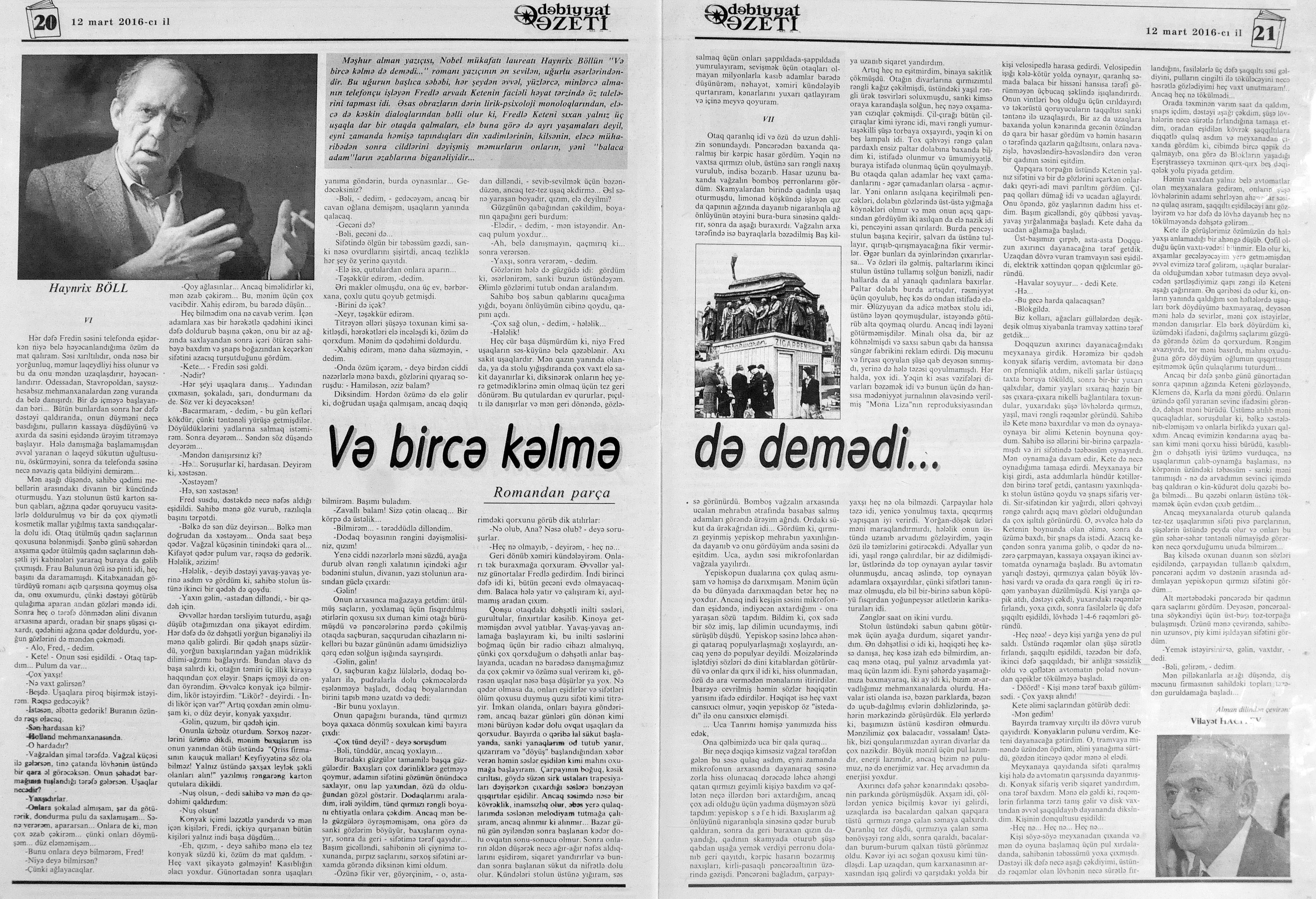 611. Aytmatov, Ç. Kassandra damğası: Rahib Filofeyin məktubu: [qırğız ədəbiyyatından tərcümə]/tərc. etdi Nərgiz Cabbarlı //Ədəbiyyat qəzeti.- 2016.- 5 mart.- S.9. 612. Böll, H. Və bircə kəlmə də demədi...: romandan parça: [alman ədəbiyyatından tərcümə] /tərc.etdi Vilayət Hacıyev //Ədəbiyyat qəzeti.- 2016.- 12 mart.- S.20-21. 613. Əmirli, Ə. Ağdamda nəyim qaldı? //525-ci qəzet.- 2016.- 5 mart.- S.23. 614. Əmirli, Ə. Ağdamda nəyim qaldı? //525-ci qəzet.- 2016.- 12 mart.- S.23. 615. Fəhmi, İ. Qapalı dairə və ya bitmək istəməyən XX: Əsərdən fraqmentlər: 2-ci hissə //Ədəbiyyat qəzeti.- 2016.- 5 mart.- S.14-15. 616. Fəhmi, İ. Qapalı dairə və ya bitmək istəməyən XX: Əsərdən fraqmentlər: 2-ci hissə //Ədəbiyyat qəzeti.- 2016.- 12 mart.- S.14-15. 617. Fəhmi, İ. Qapalı dairə və ya bitmək istəməyən XX: Əsərdən fraqmentlər //Ədəbiyyat qəzeti.- 2016.- 19 mart.- S.8-9. 618. Qan T. “Molla Sadiqin əhvalatı”: [müəllifin “Fələk qırmancı” romanından parça] //Ədəbiyyat qəzeti.- 2016.- 19 mart.- S.24-25. 619. Mirələmov, H. İki şah, iki sultan: (Romandan parçalar) //Kredo.- 2016.- 5 mart.- S.2. 620. Mirələmov, H. İki şah, iki sultan: (Romandan parçalar) ///Kredo.- 2016.- 11 mart.- S.2. 621. Mirələmov, H. İki şah, iki sultan: (Romandan parçalar) //Kredo.- 2016.- 18 mart.- S.2. 622. Mirələmov, H. İki şah, iki sultan: (Romandan parçalar) //Kredo.- 2016.- 25 mart.- S.2. 623. Mirələmov, H. İki şah, iki sultan: (Romandan parçalar) //Kredo.- 2016.- 31 mart.- S.2.