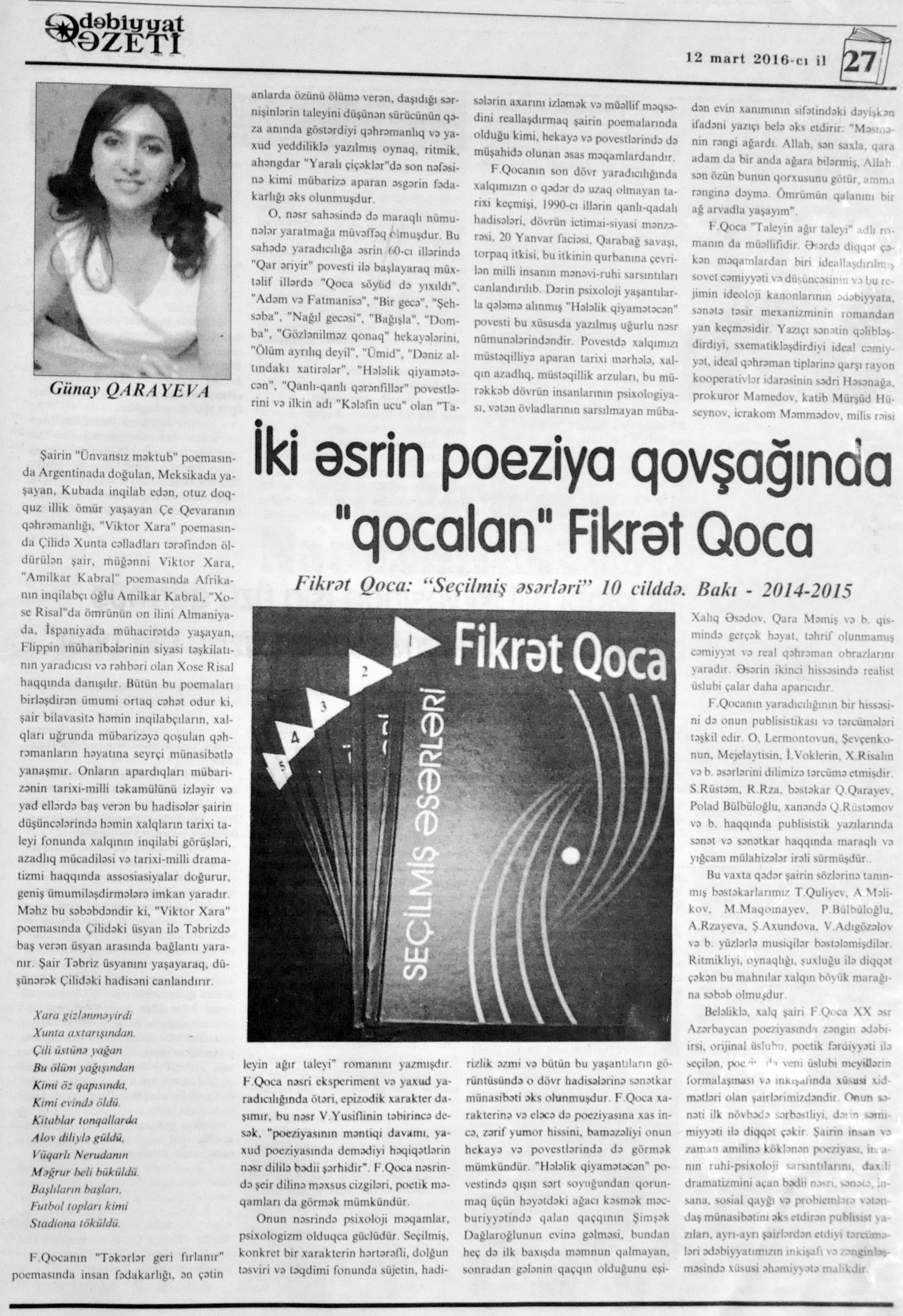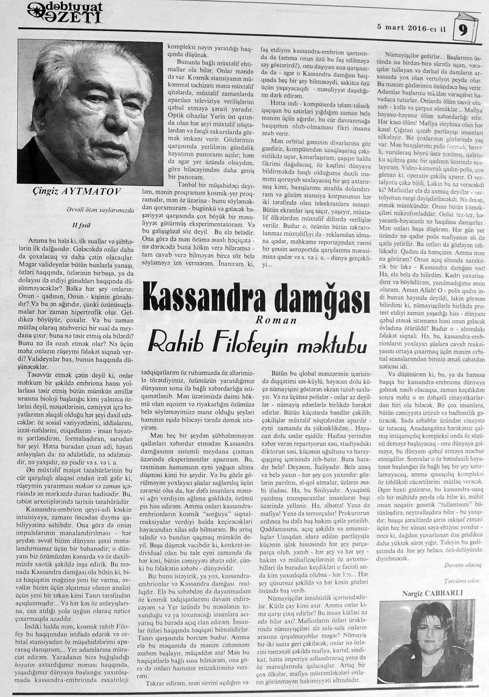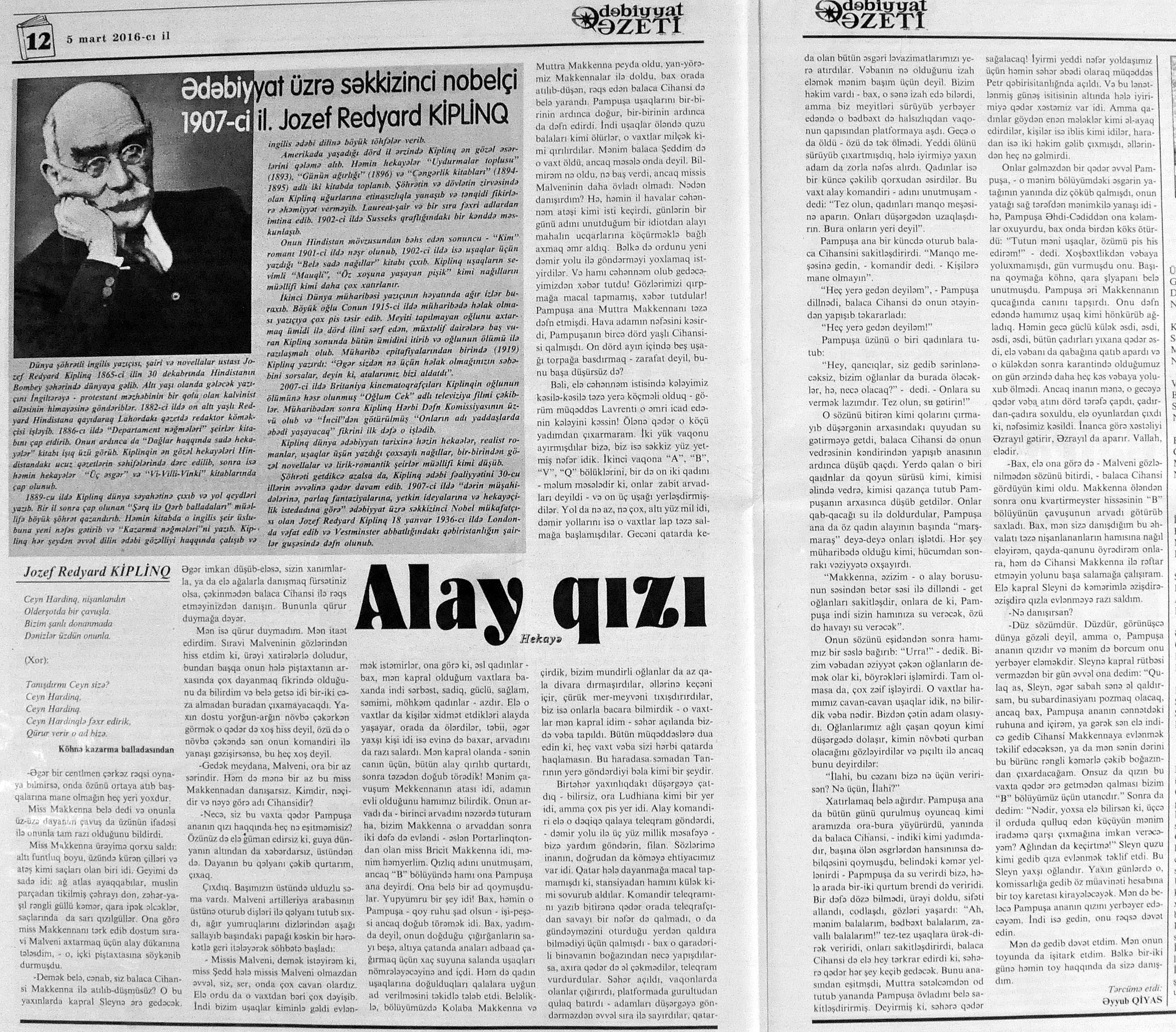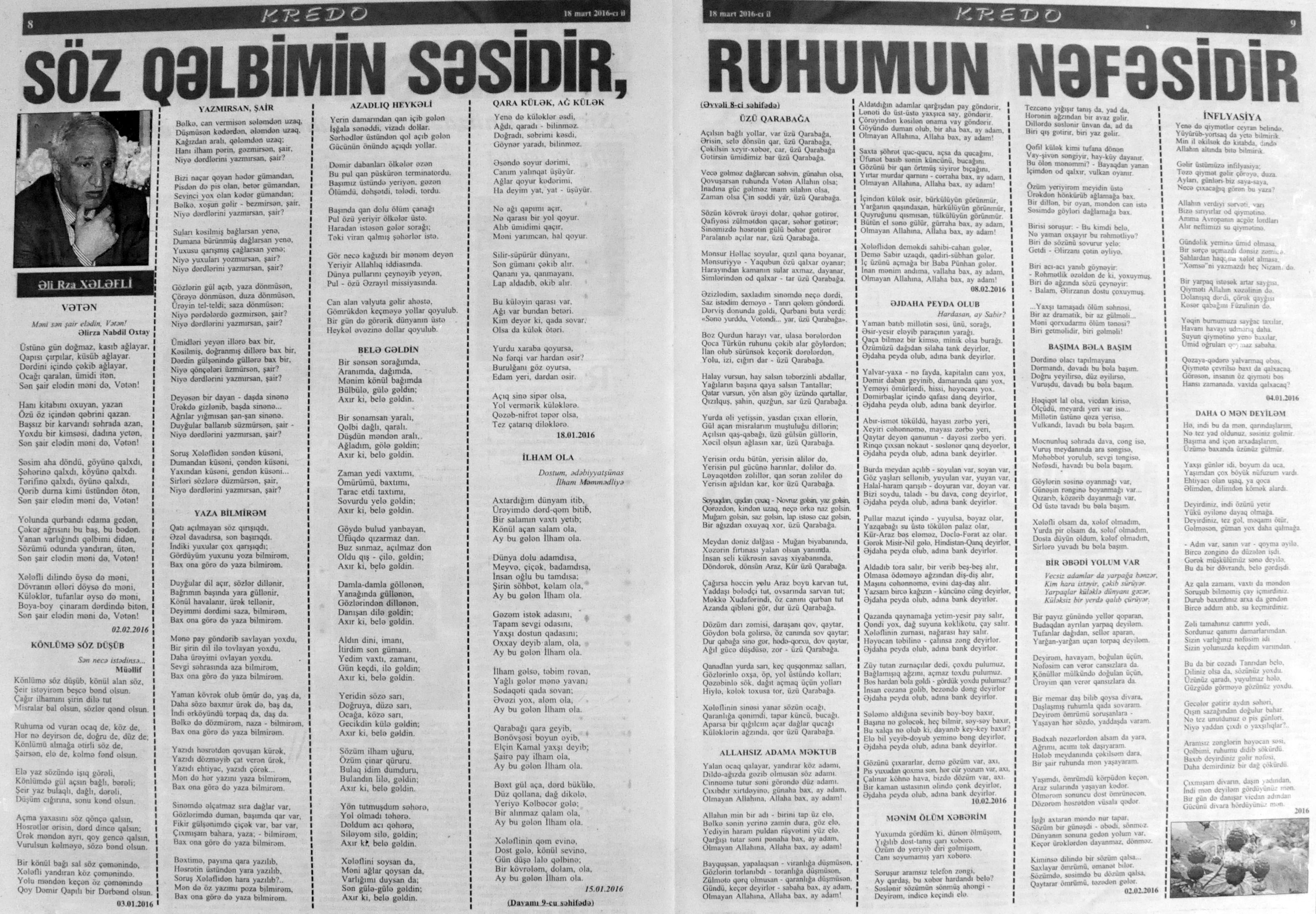 611. Aytmatov, Ç. Kassandra damğası: Rahib Filofeyin məktubu: [qırğız ədəbiyyatından tərcümə]/tərc. etdi Nərgiz Cabbarlı //Ədəbiyyat qəzeti.- 2016.- 5 mart.- S.9. 612. Böll, H. Və bircə kəlmə də demədi...: romandan parça: [alman ədəbiyyatından tərcümə] /tərc.etdi Vilayət Hacıyev //Ədəbiyyat qəzeti.- 2016.- 12 mart.- S.20-21. 613. Əmirli, Ə. Ağdamda nəyim qaldı? //525-ci qəzet.- 2016.- 5 mart.- S.23. 614. Əmirli, Ə. Ağdamda nəyim qaldı? //525-ci qəzet.- 2016.- 12 mart.- S.23. 615. Fəhmi, İ. Qapalı dairə və ya bitmək istəməyən XX: Əsərdən fraqmentlər: 2-ci hissə //Ədəbiyyat qəzeti.- 2016.- 5 mart.- S.14-15. 616. Fəhmi, İ. Qapalı dairə və ya bitmək istəməyən XX: Əsərdən fraqmentlər: 2-ci hissə //Ədəbiyyat qəzeti.- 2016.- 12 mart.- S.14-15. 617. Fəhmi, İ. Qapalı dairə və ya bitmək istəməyən XX: Əsərdən fraqmentlər //Ədəbiyyat qəzeti.- 2016.- 19 mart.- S.8-9. 618. Qan T. “Molla Sadiqin əhvalatı”: [müəllifin “Fələk qırmancı” romanından parça] //Ədəbiyyat qəzeti.- 2016.- 19 mart.- S.24-25. 619. Mirələmov, H. İki şah, iki sultan: (Romandan parçalar) //Kredo.- 2016.- 5 mart.- S.2. 620. Mirələmov, H. İki şah, iki sultan: (Romandan parçalar) ///Kredo.- 2016.- 11 mart.- S.2. 621. Mirələmov, H. İki şah, iki sultan: (Romandan parçalar) //Kredo.- 2016.- 18 mart.- S.2. 622. Mirələmov, H. İki şah, iki sultan: (Romandan parçalar) //Kredo.- 2016.- 25 mart.- S.2. 623. Mirələmov, H. İki şah, iki sultan: (Romandan parçalar) //Kredo.- 2016.- 31 mart.- S.2.