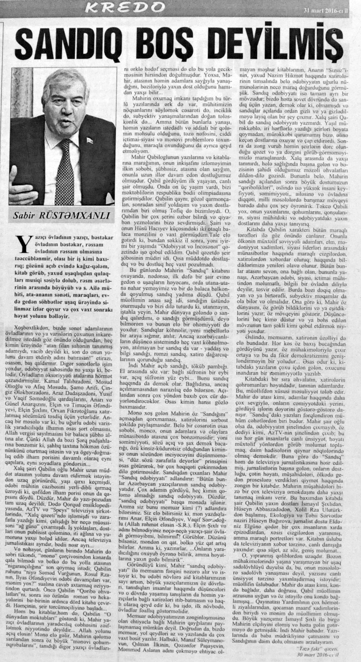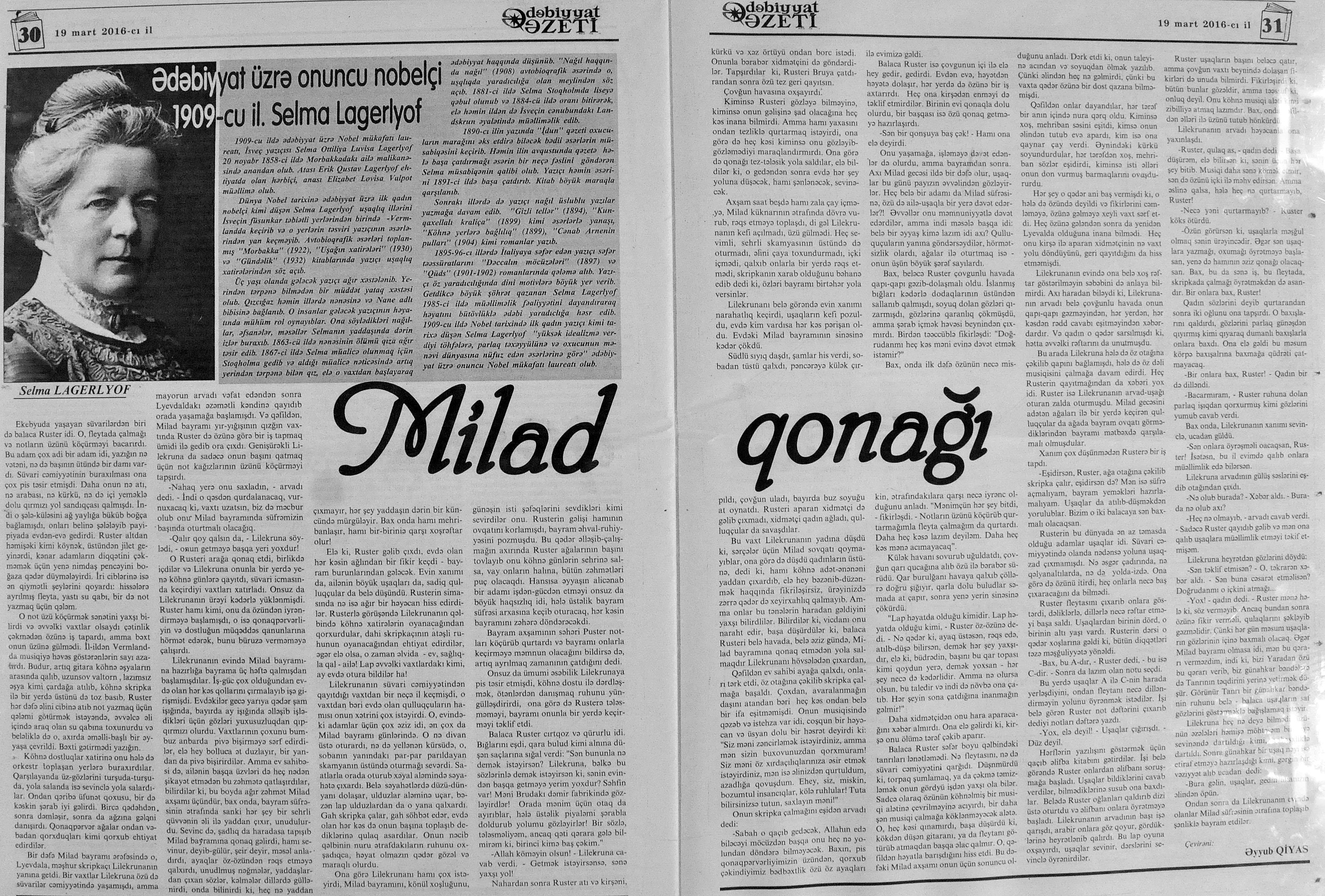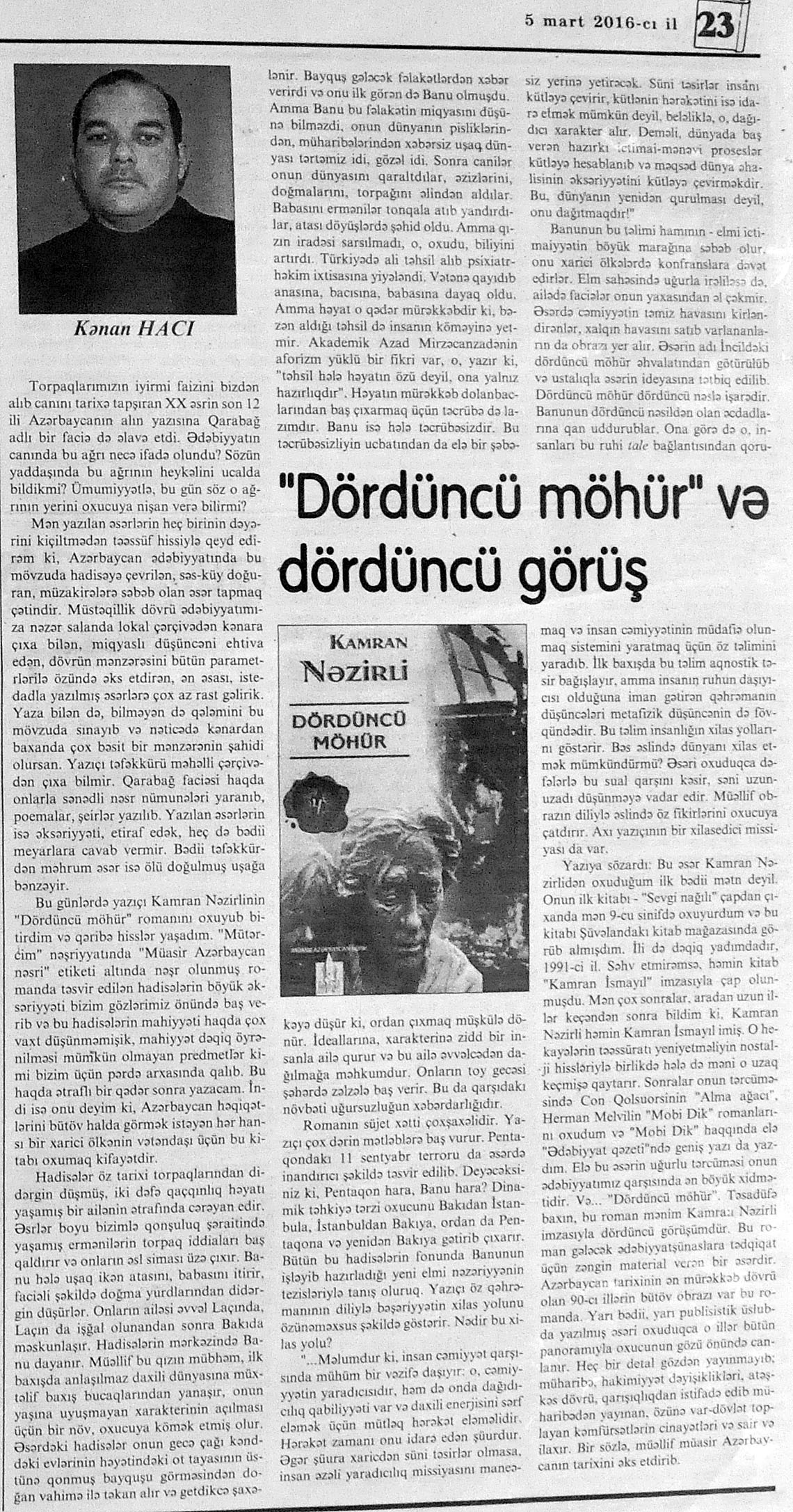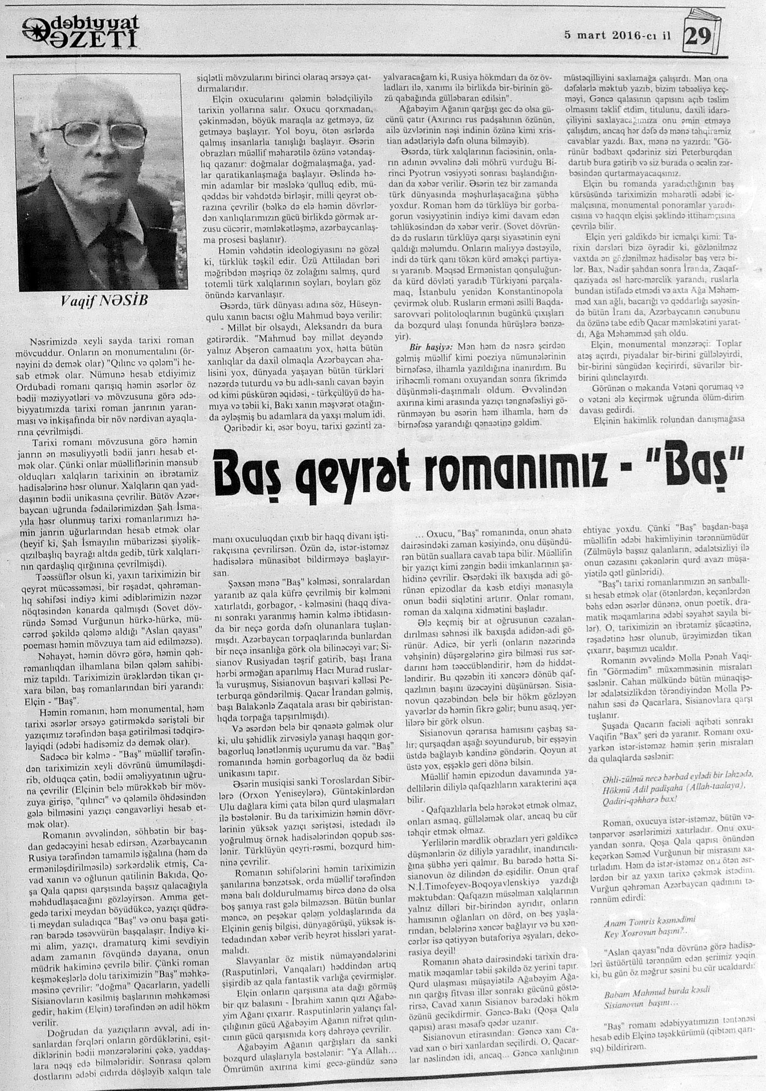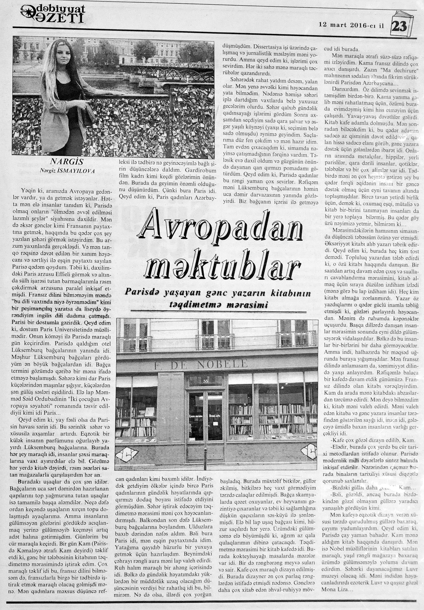 611. Aytmatov, Ç. Kassandra damğası: Rahib Filofeyin məktubu: [qırğız ədəbiyyatından tərcümə]/tərc. etdi Nərgiz Cabbarlı //Ədəbiyyat qəzeti.- 2016.- 5 mart.- S.9. 612. Böll, H. Və bircə kəlmə də demədi...: romandan parça: [alman ədəbiyyatından tərcümə] /tərc.etdi Vilayət Hacıyev //Ədəbiyyat qəzeti.- 2016.- 12 mart.- S.20-21. 613. Əmirli, Ə. Ağdamda nəyim qaldı? //525-ci qəzet.- 2016.- 5 mart.- S.23. 614. Əmirli, Ə. Ağdamda nəyim qaldı? //525-ci qəzet.- 2016.- 12 mart.- S.23. 615. Fəhmi, İ. Qapalı dairə və ya bitmək istəməyən XX: Əsərdən fraqmentlər: 2-ci hissə //Ədəbiyyat qəzeti.- 2016.- 5 mart.- S.14-15. 616. Fəhmi, İ. Qapalı dairə və ya bitmək istəməyən XX: Əsərdən fraqmentlər: 2-ci hissə //Ədəbiyyat qəzeti.- 2016.- 12 mart.- S.14-15. 617. Fəhmi, İ. Qapalı dairə və ya bitmək istəməyən XX: Əsərdən fraqmentlər //Ədəbiyyat qəzeti.- 2016.- 19 mart.- S.8-9. 618. Qan T. “Molla Sadiqin əhvalatı”: [müəllifin “Fələk qırmancı” romanından parça] //Ədəbiyyat qəzeti.- 2016.- 19 mart.- S.24-25. 619. Mirələmov, H. İki şah, iki sultan: (Romandan parçalar) //Kredo.- 2016.- 5 mart.- S.2. 620. Mirələmov, H. İki şah, iki sultan: (Romandan parçalar) ///Kredo.- 2016.- 11 mart.- S.2. 621. Mirələmov, H. İki şah, iki sultan: (Romandan parçalar) //Kredo.- 2016.- 18 mart.- S.2. 622. Mirələmov, H. İki şah, iki sultan: (Romandan parçalar) //Kredo.- 2016.- 25 mart.- S.2. 623. Mirələmov, H. İki şah, iki sultan: (Romandan parçalar) //Kredo.- 2016.- 31 mart.- S.2.