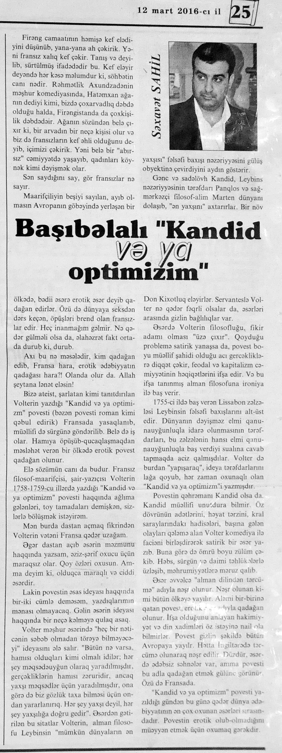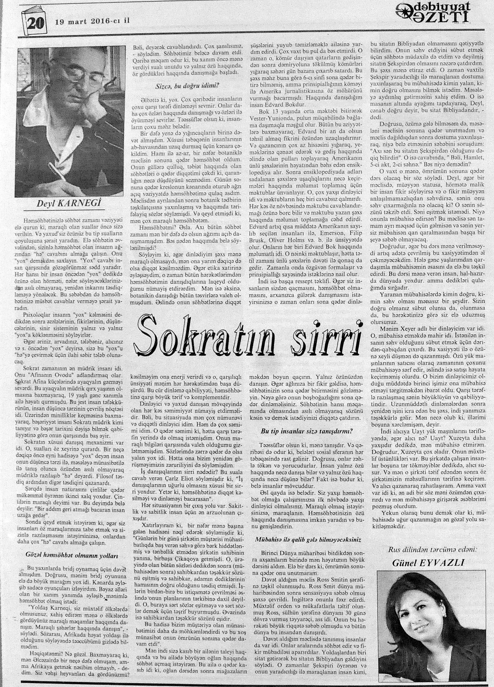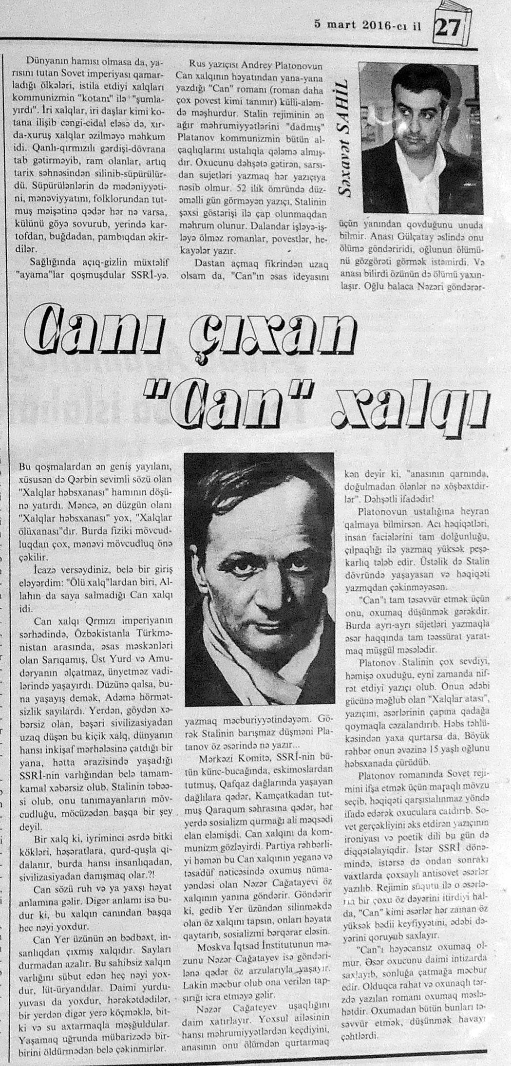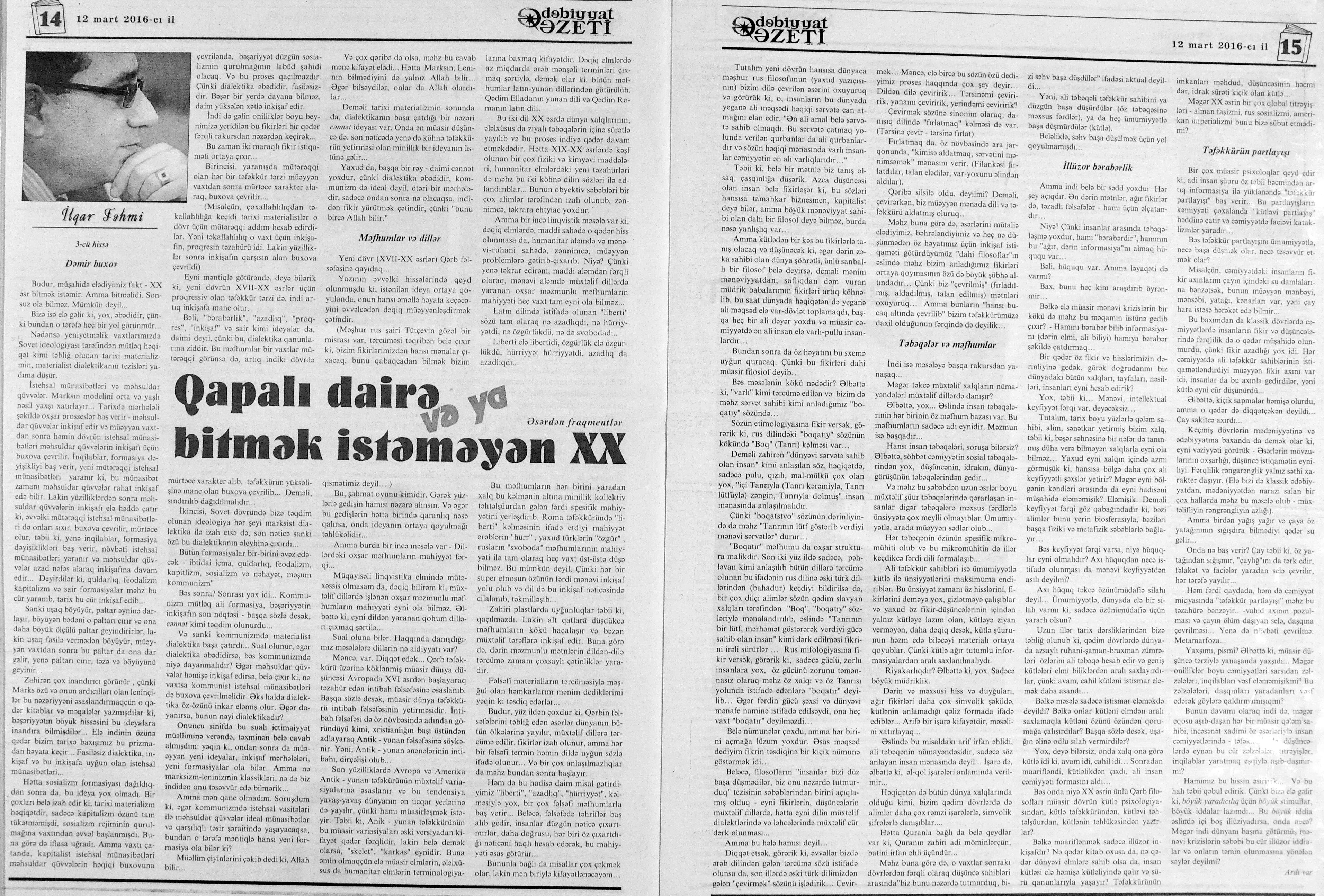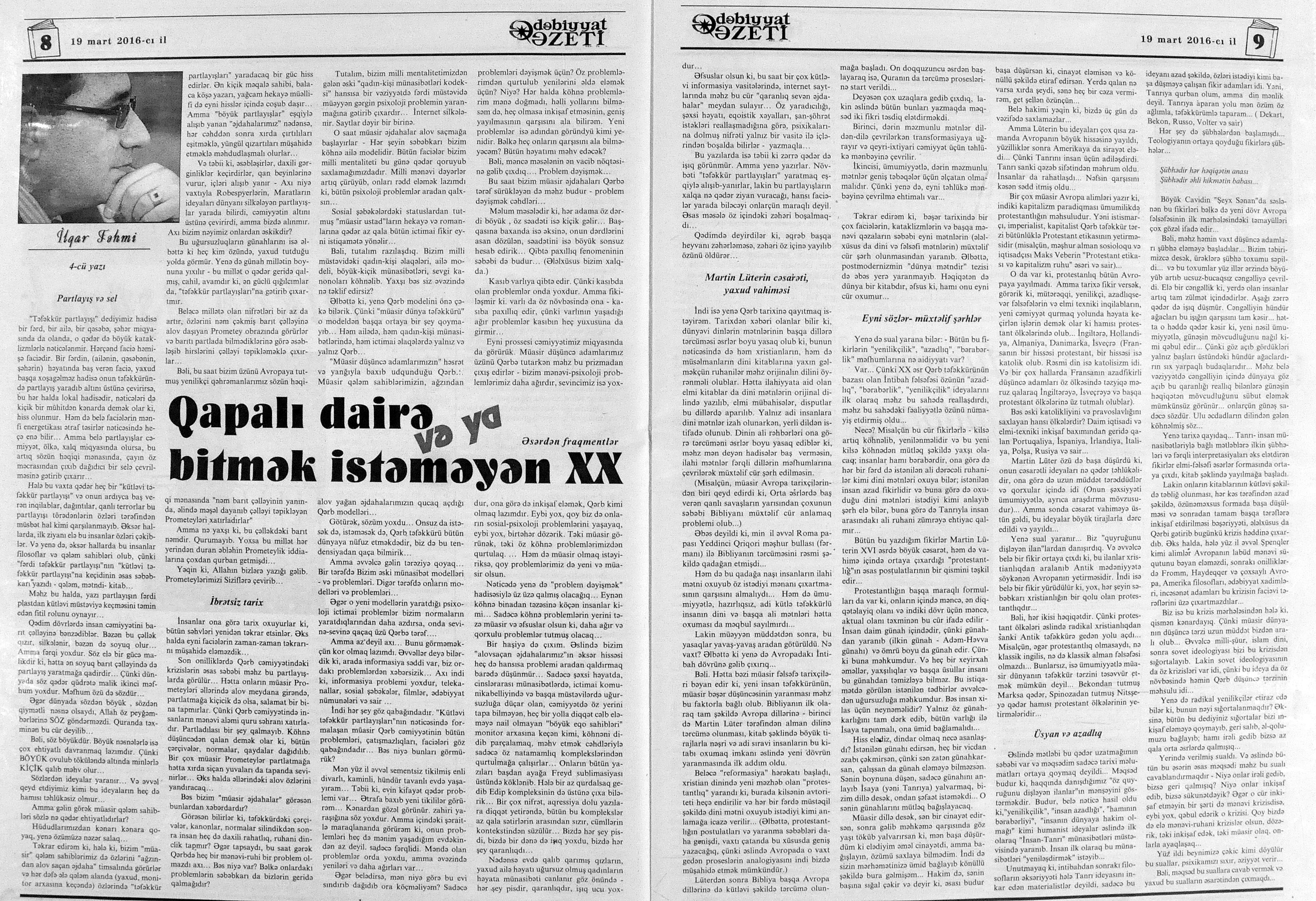 611. Aytmatov, Ç. Kassandra damğası: Rahib Filofeyin məktubu: [qırğız ədəbiyyatından tərcümə]/tərc. etdi Nərgiz Cabbarlı //Ədəbiyyat qəzeti.- 2016.- 5 mart.- S.9. 612. Böll, H. Və bircə kəlmə də demədi...: romandan parça: [alman ədəbiyyatından tərcümə] /tərc.etdi Vilayət Hacıyev //Ədəbiyyat qəzeti.- 2016.- 12 mart.- S.20-21. 613. Əmirli, Ə. Ağdamda nəyim qaldı? //525-ci qəzet.- 2016.- 5 mart.- S.23. 614. Əmirli, Ə. Ağdamda nəyim qaldı? //525-ci qəzet.- 2016.- 12 mart.- S.23. 615. Fəhmi, İ. Qapalı dairə və ya bitmək istəməyən XX: Əsərdən fraqmentlər: 2-ci hissə //Ədəbiyyat qəzeti.- 2016.- 5 mart.- S.14-15. 616. Fəhmi, İ. Qapalı dairə və ya bitmək istəməyən XX: Əsərdən fraqmentlər: 2-ci hissə //Ədəbiyyat qəzeti.- 2016.- 12 mart.- S.14-15. 617. Fəhmi, İ. Qapalı dairə və ya bitmək istəməyən XX: Əsərdən fraqmentlər //Ədəbiyyat qəzeti.- 2016.- 19 mart.- S.8-9. 618. Qan T. “Molla Sadiqin əhvalatı”: [müəllifin “Fələk qırmancı” romanından parça] //Ədəbiyyat qəzeti.- 2016.- 19 mart.- S.24-25. 619. Mirələmov, H. İki şah, iki sultan: (Romandan parçalar) //Kredo.- 2016.- 5 mart.- S.2. 620. Mirələmov, H. İki şah, iki sultan: (Romandan parçalar) ///Kredo.- 2016.- 11 mart.- S.2. 621. Mirələmov, H. İki şah, iki sultan: (Romandan parçalar) //Kredo.- 2016.- 18 mart.- S.2. 622. Mirələmov, H. İki şah, iki sultan: (Romandan parçalar) //Kredo.- 2016.- 25 mart.- S.2. 623. Mirələmov, H. İki şah, iki sultan: (Romandan parçalar) //Kredo.- 2016.- 31 mart.- S.2.