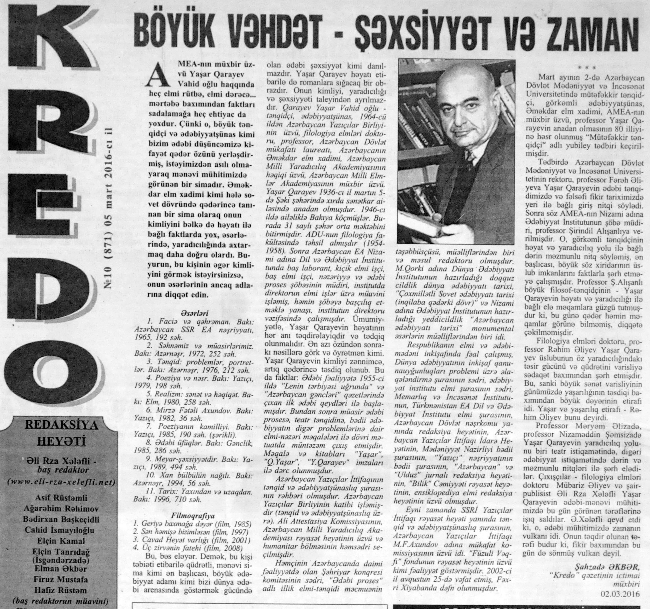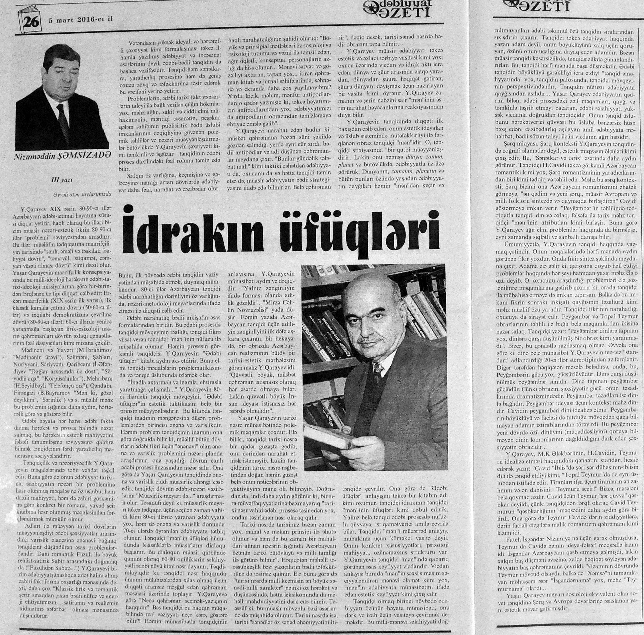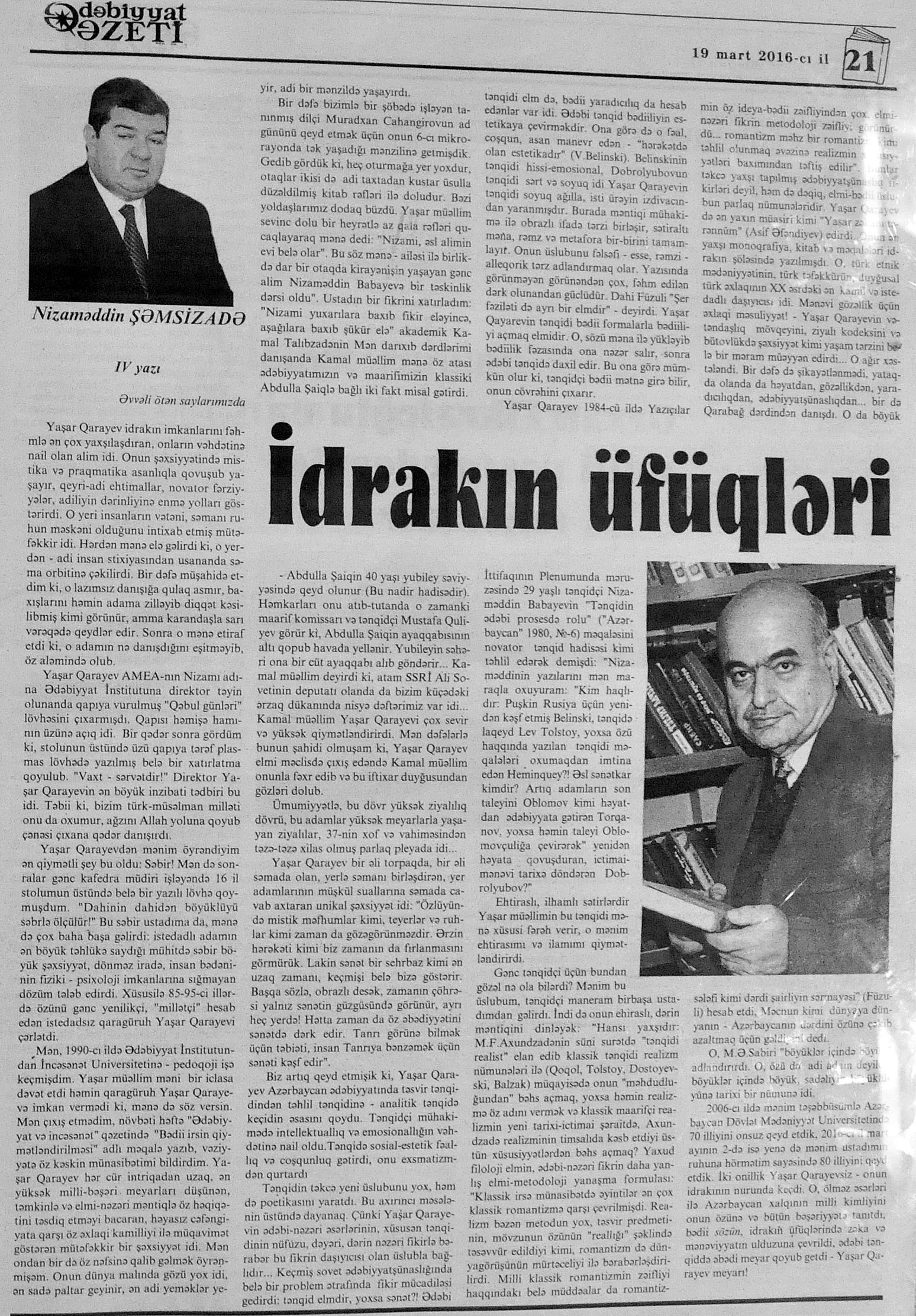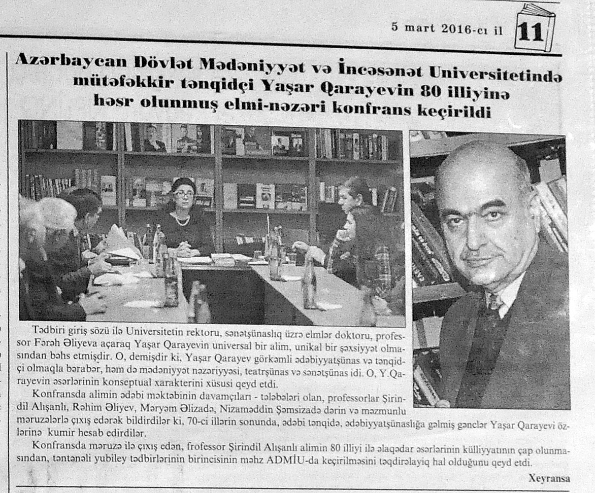 815. Alışanlı, Ş. Ədəbiyyat filosofu: Elm xadimləri //Azərbaycan.- 2016.- 6 mart- S. 7; İqtisadiyyat.- 2016.- 18-29 mart.- S.11. 816. Ədəbiyyatşünaslıqda Yaşar Qarayev fenomeni: Mütəfəkkir alimin 80 illiyinə həsr olunmuş elmi-nəzəri konfrans: [ADMİU-da] //Mədəniyyət.- 2016.- 4 mart.- S. 6. 817. Əkbər, Ş. Böyük vəhdət – şəxsiyyət və zaman: [ədəbiyyatşünas alim haqqında] //Kredo.- 2016.- 5 mart.- S.16. 818. Xeyransa. Azərbaycan Dövlət Mədəniyyət və İncəsənət Universitetində mütəfəkkir tənqidçi Yaşar Qarayevin 80 illiyinə həsr olunmuş elmi-nəzəri konfrans keçirildi //Ədəbiyyat qəzeti.- 2016.- 5 mart.- S.11. 819. Şəmsizadə, N. İdrakın üfüqləri: III yazı: [ədəbiyyatşünas alimin yaradıcılığı haqqında] //Ədəbiyyat qəzeti.- 2016.- 5 mart.- S.26-27. 820. Şəmsizadə, N. İdrakın üfüqləri: IV yazı //Ədəbiyyat qəzeti.- 2016.- 19 mart.- S.21.