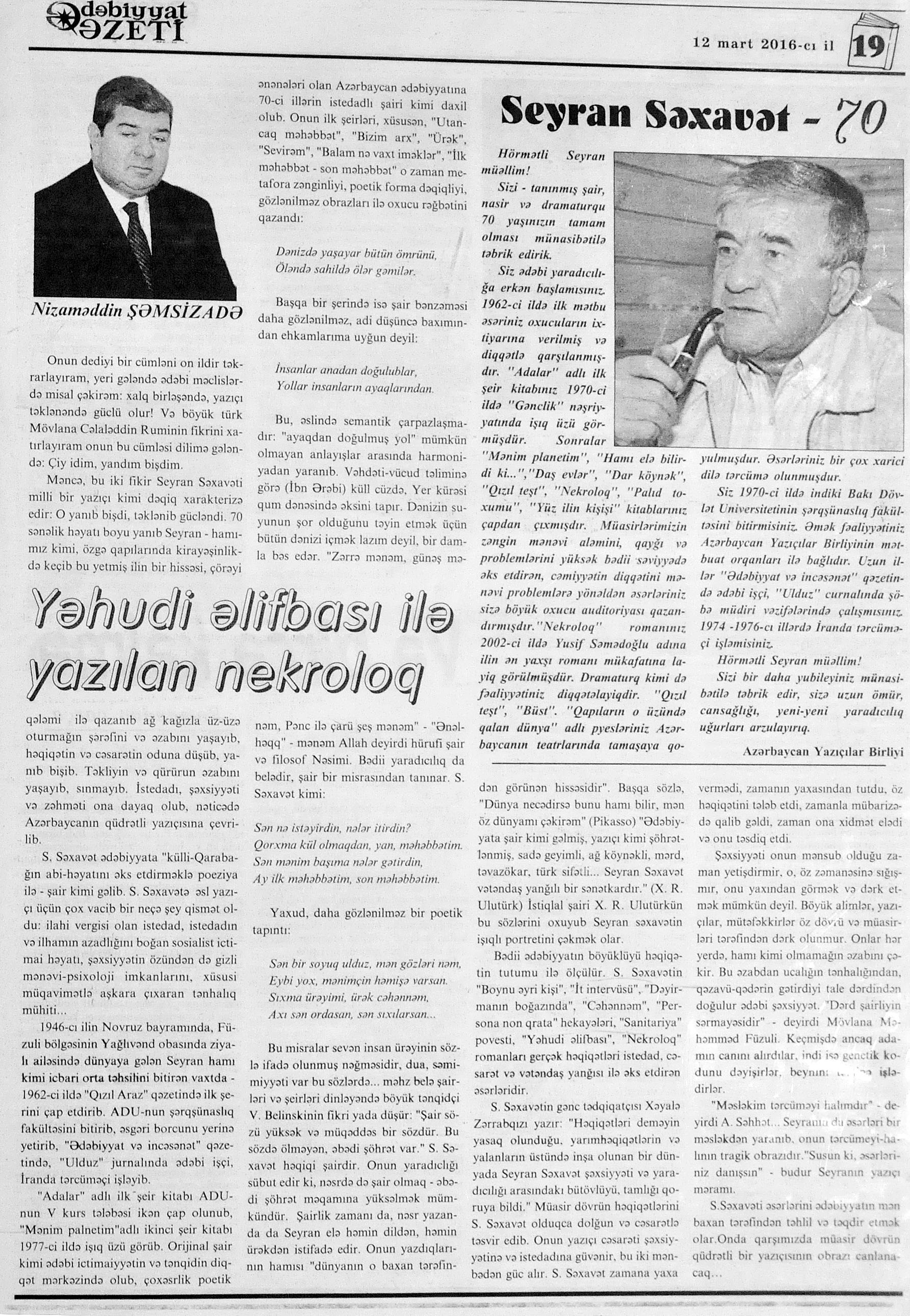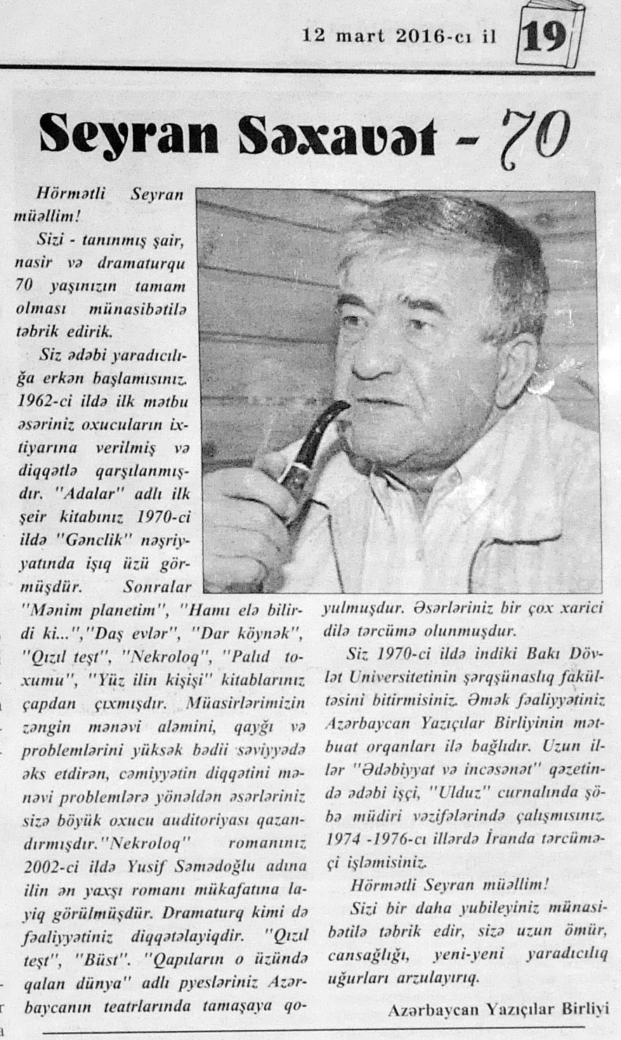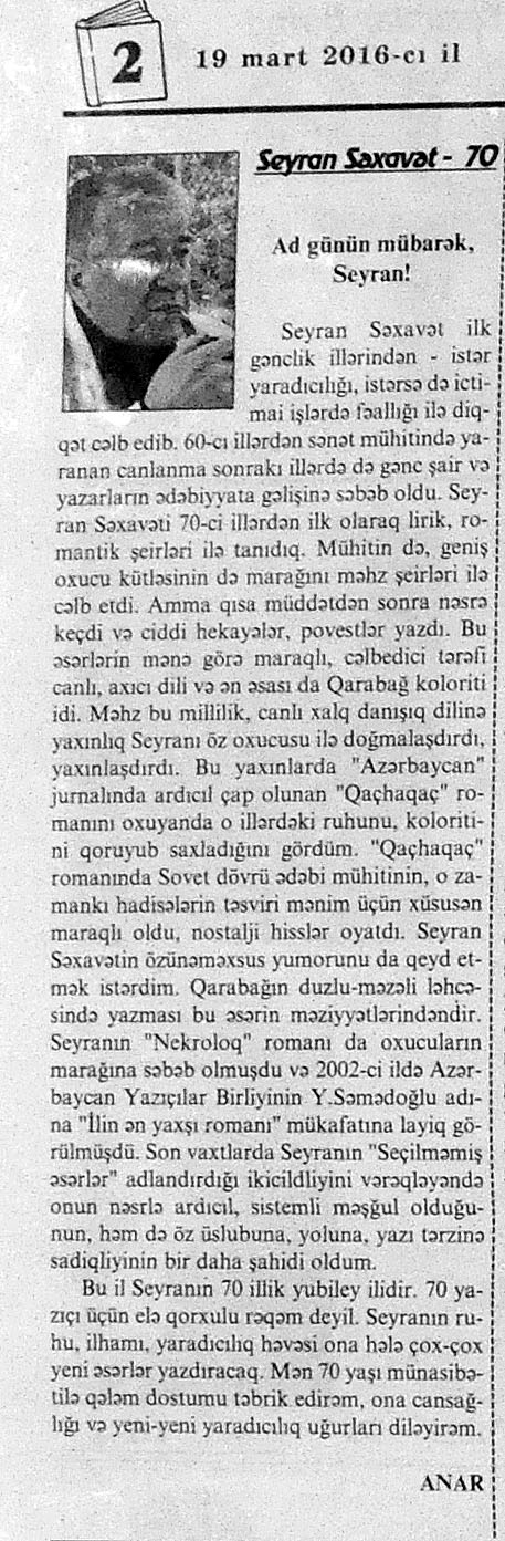 821. Anar. Seyran Səxavət – 70: Ad günün mübarək, Seyran!: [yazıçının yubileyi münasibətilə müəllifin təbriki] //Ədəbiyyat qəzeti.- 2016.- 19 mart.- S.2. 822. Cəbrayıloğlu, E. Nəsrimizin Seyranı, ədəbiyyatımızın Səxavəti //Ədalət.- 2016.- 19 mart.- S.6. 823. Musa Yaqub: “Seyran Səxavət ədəbiyyatda ölməzlik qazanıb”: [şair-publisistin müsahibəsi] /müsahibəni apardı Xəyalə Zərrabqızı //525-ci qəzet.- 2016.- 19 mart.- S.16-17. 824. “Onun qoxusu üçün darıxırdım”: [Seyran Səxavətin müsahibəsi] //Şərq.- 2016.- 4 mart.- S. 13. 825. Seyran Səxavət – 70: [yazıçının yubileyi münasibətilə AYB-nin təbriki] //Ədəbiyyat qəzeti.- 2016.- 12 mart.- S.19. 826. Seyran Səxavət – 70: Kiçik əhvalatlarda böyük həqiqətlər... //Şərq.- 2016.- 18 mart.- S.13 827. Səxavət, S. Yazandan sonra xoşbəxt bir çəkisizliyə düşürəm: Seyran Səxavət: “Müstəqillik illərində o qədər torpaqlar, oğullar itirdik ki, onların yanında oxucu itkisi məni ağrıdan məsələ deyil”: [yazıçı ilə müsahibə] /müsahibəni apardı Fərid Hüseyn //Kaspi.- 2016.- 16 mart.- S.8-9. 828. Şəmsizadə, N. Yəhudi əlifbası ilə yazılan nekroloq //Ədəbiyyat qəzeti.- 2016.- 12 mart.- S.19. 829. Şəmsizadə, N. Yəhudi əlifbasıyla yazılan nekroloq: Xalq yazıçısı Elçinin Seyran Saxavətə teleqramı //Kaspi.- 2016.- 19-28 mart.- S.19. 830. Zərrabqızı, X. Kəskin süjetli mövzular, koloritli epik qəhrəmanlar //Mədəniyyət.- 2016.- 18 mart.- S.12. 831. Zərrabqızı, X. Kiçik əhvalatlarda böyük həqiqətlər... //Kredo.- 2016.- 25 mart.- S.4-5. 832. Zərrabqızı, X. Seyran Səxavət yaradıcılığı: millilikdən bəşəriliyə //525-ci qəzet.- 2016.- 5 mart.- S. 18-19.