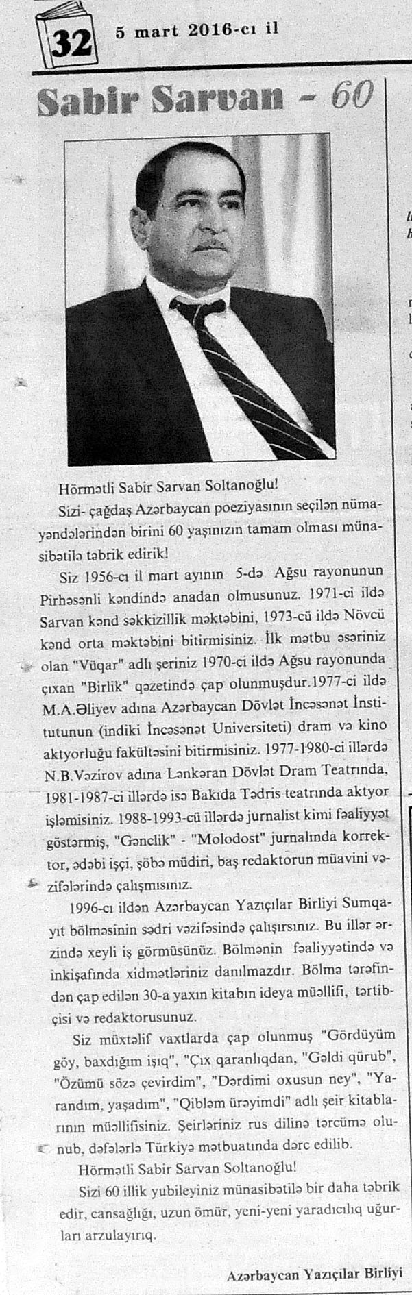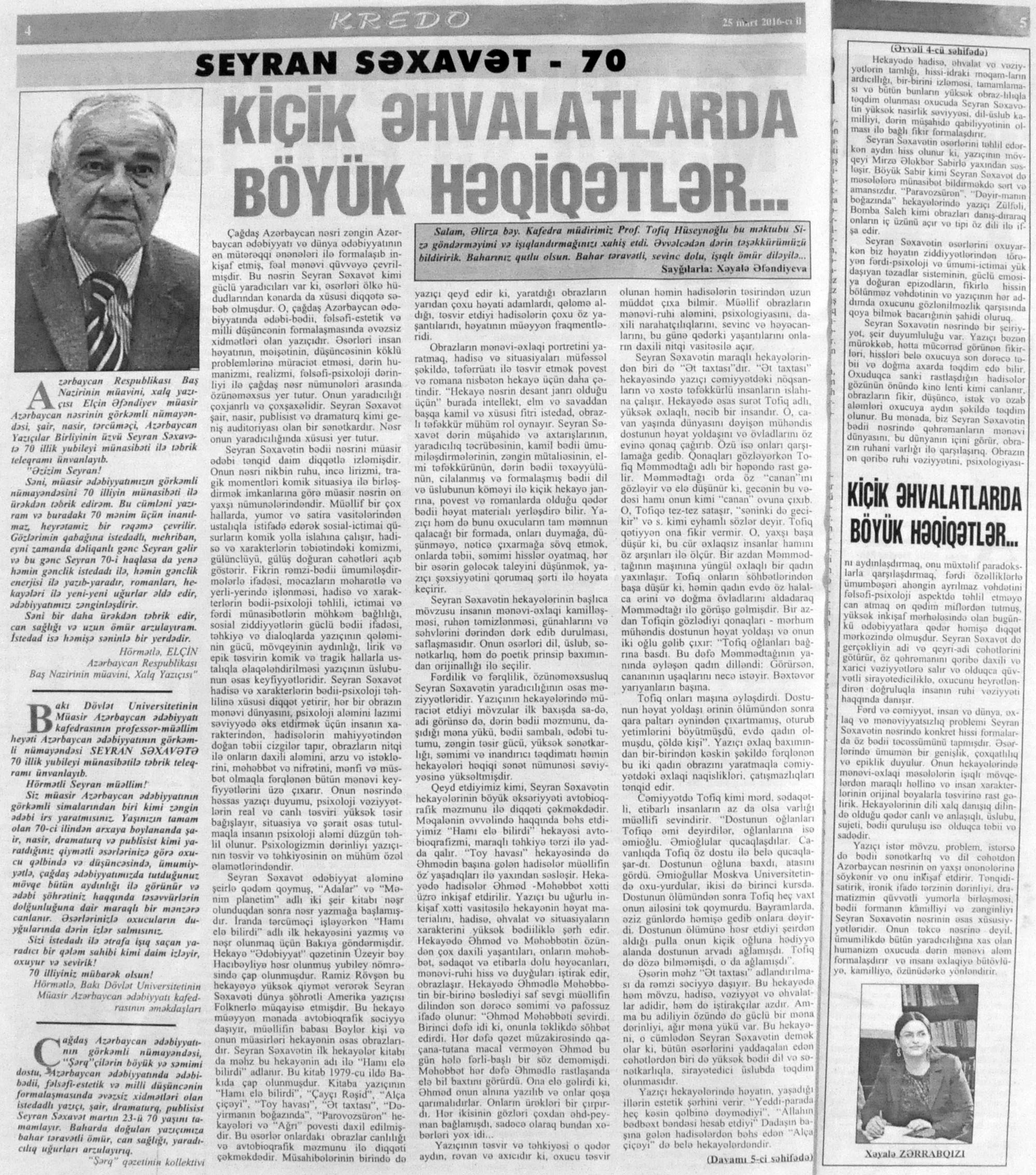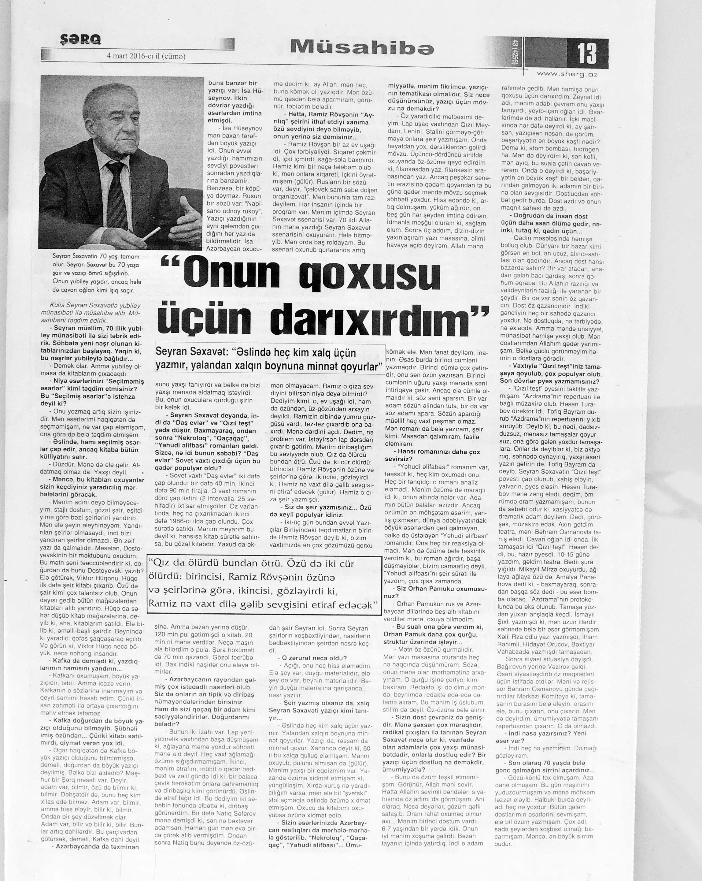 821. Anar. Seyran Səxavət – 70: Ad günün mübarək, Seyran!: [yazıçının yubileyi münasibətilə müəllifin təbriki] //Ədəbiyyat qəzeti.- 2016.- 19 mart.- S.2. 822. Cəbrayıloğlu, E. Nəsrimizin Seyranı, ədəbiyyatımızın Səxavəti //Ədalət.- 2016.- 19 mart.- S.6. 823. Musa Yaqub: “Seyran Səxavət ədəbiyyatda ölməzlik qazanıb”: [şair-publisistin müsahibəsi] /müsahibəni apardı Xəyalə Zərrabqızı //525-ci qəzet.- 2016.- 19 mart.- S.16-17. 824. “Onun qoxusu üçün darıxırdım”: [Seyran Səxavətin müsahibəsi] //Şərq.- 2016.- 4 mart.- S. 13. 825. Seyran Səxavət – 70: [yazıçının yubileyi münasibətilə AYB-nin təbriki] //Ədəbiyyat qəzeti.- 2016.- 12 mart.- S.19. 826. Seyran Səxavət – 70: Kiçik əhvalatlarda böyük həqiqətlər... //Şərq.- 2016.- 18 mart.- S.13 827. Səxavət, S. Yazandan sonra xoşbəxt bir çəkisizliyə düşürəm: Seyran Səxavət: “Müstəqillik illərində o qədər torpaqlar, oğullar itirdik ki, onların yanında oxucu itkisi məni ağrıdan məsələ deyil”: [yazıçı ilə müsahibə] /müsahibəni apardı Fərid Hüseyn //Kaspi.- 2016.- 16 mart.- S.8-9. 828. Şəmsizadə, N. Yəhudi əlifbası ilə yazılan nekroloq //Ədəbiyyat qəzeti.- 2016.- 12 mart.- S.19. 829. Şəmsizadə, N. Yəhudi əlifbasıyla yazılan nekroloq: Xalq yazıçısı Elçinin Seyran Saxavətə teleqramı //Kaspi.- 2016.- 19-28 mart.- S.19. 830. Zərrabqızı, X. Kəskin süjetli mövzular, koloritli epik qəhrəmanlar //Mədəniyyət.- 2016.- 18 mart.- S.12. 831. Zərrabqızı, X. Kiçik əhvalatlarda böyük həqiqətlər... //Kredo.- 2016.- 25 mart.- S.4-5. 832. Zərrabqızı, X. Seyran Səxavət yaradıcılığı: millilikdən bəşəriliyə //525-ci qəzet.- 2016.- 5 mart.- S. 18-19.