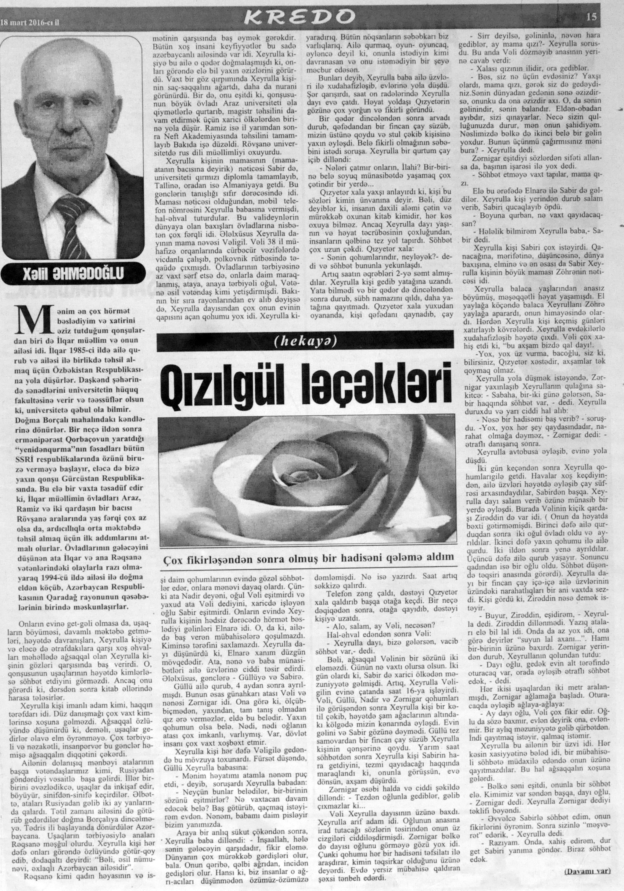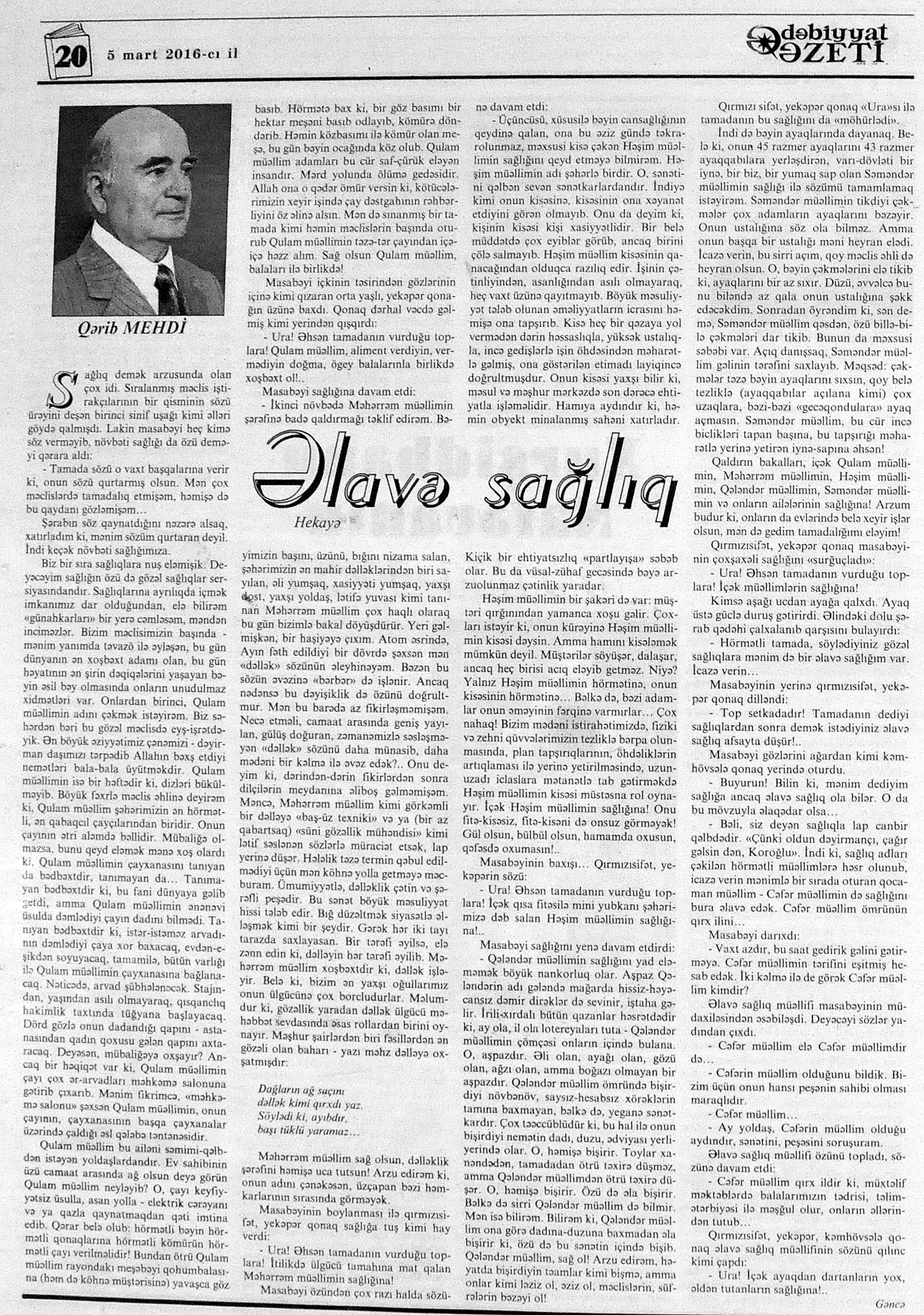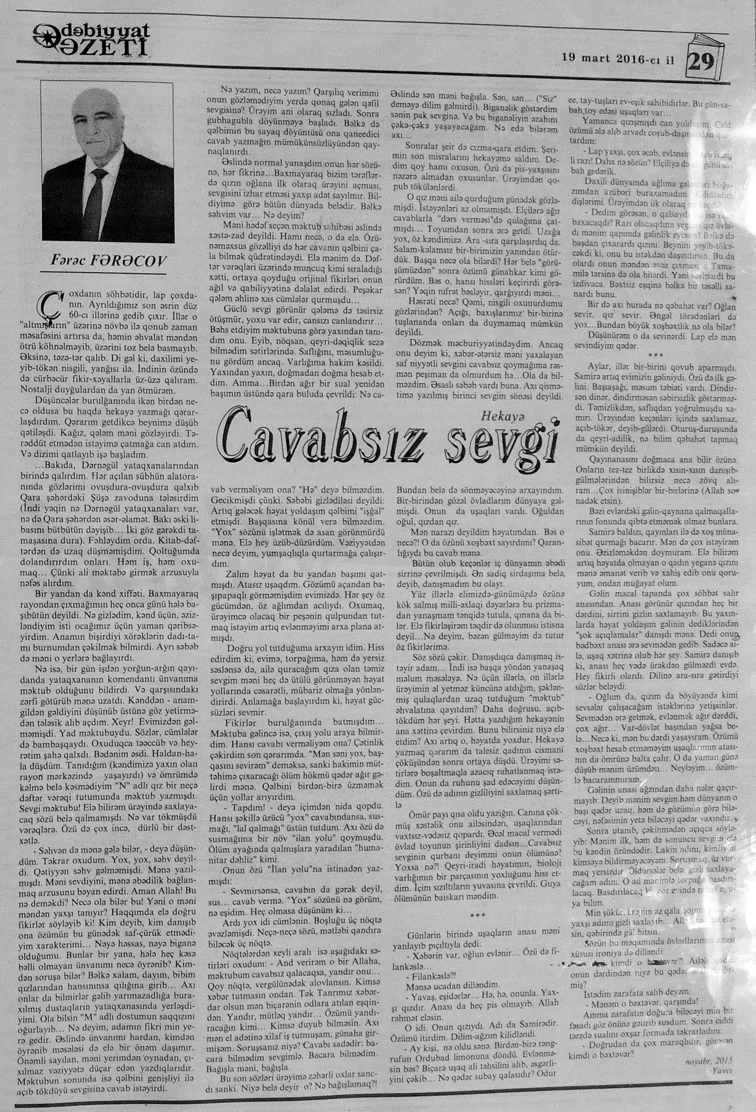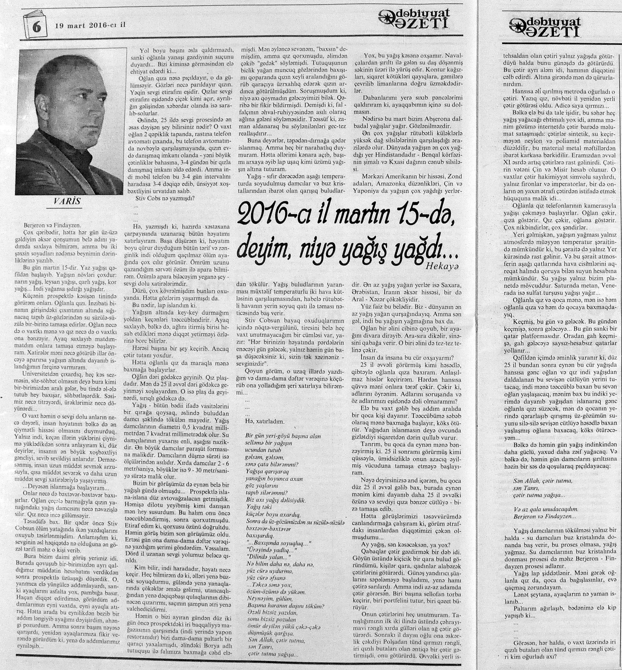 585. Bəxtiyar, N. Bal... //Kredo.-2016.- 31 mart. - S.10. 586. Bəxtiyar, N. Xoruz: Hekayə //Kredo.- 2016.- 18 mart. - S.14. 587. Əhmədoğlu, X. Qızılgül ləçəkləri //Kredo.- 2016.- 18 mart. - S.15. 588. Əhmədoğlu, X. Qızılgül ləçəkləri //Kredo.- 2016.- 25 mart. - S.14. 589. Əhmədoğlu, X. Qızılgül ləçəkləri //Kredo.- 2016.- 31 mart. - S.14. 590. Əliyeva, S. Yazıçının etirafı //Kaspi.- 2016.- 12-14 mart.- S.23. 591. Fərəcov, F. Cavabsız sevgi //Ədəbiyyat qəzeti.- 2016.- 19 mart.- S.29. 592. Kiplinq, R. Alay qızı //Ədəbiyyat qəzeti.- 2016.- 5 mart.- S.12-13. 593. Lagerlyof, S. Milad qonağı: [İsveç ədəbiyyatından tərcümə] /tərc. etdi Qiyas Əyyub //Ədəbiyyat qəzeti.- 2016.- 19 mart.- S.30-31. 594. Mehdi, Q. Əlavə sağlıq //Ədəbiyyat qəzeti.- 2016.- 5 mart.- S.20. 595. Məhərrəmov, V. İnternet sevdası //Ədalət.- 2016.- 19 mart.- S.12. 596. Munro, H. Laura: [ingilis dilindən tərcümə] /tərc etdi Gültən Sevil //Kaspi.- 2016.- 5-7 mart.- S.15. 597. Nəcəfzadə Q. Ağgülün müharibəsi //525-ci qəzet.- 2016.- 31 mart.- S. 8. 598. Otarbayev, M. Budağından qopan yarpaq //Kaspi.- 2016.- 12-14 mart.- S.16-17. 599. Tağıyev, A. Su sonasıı //525-ci qəzet.- 2016.- 15 mart. - S.8. 600. Varis. 2016-cı il martın 15-də, deyim, niyə yağış yağdı... //Ədəbiyyat qəzeti.- 2016.- 19 mart.- S.6-7. 601. Vəli, Ş. Birlikdə üşüyək //Ədəbiyyat qəzeti.- 2016.- 19 mart.- S.7. 602. Zəngəzurlu, S. Cəza //Ədəbiyyat qəzeti.- 2016.- 12 mart.- S.31.