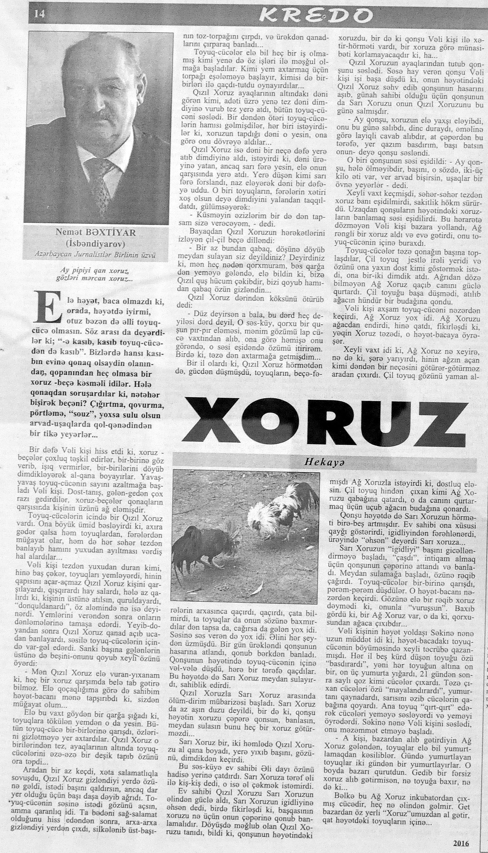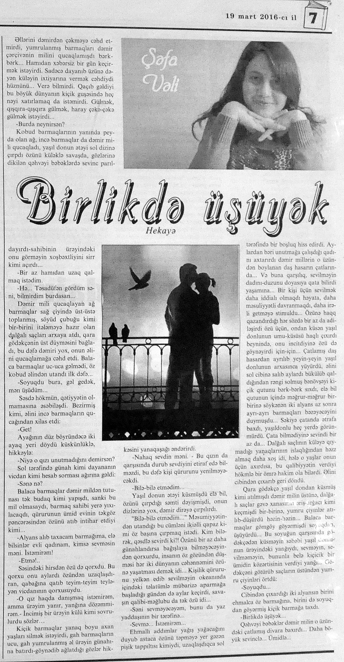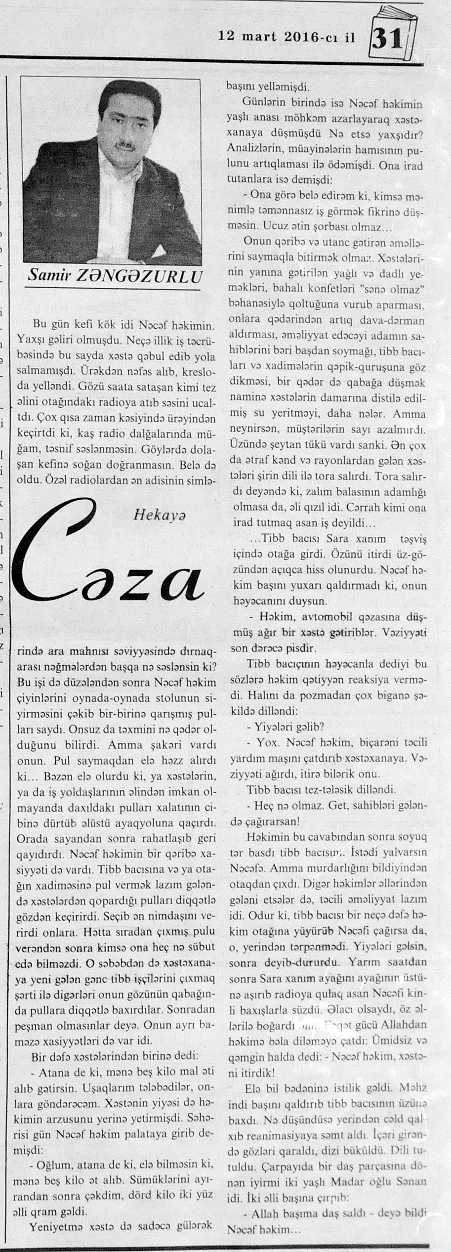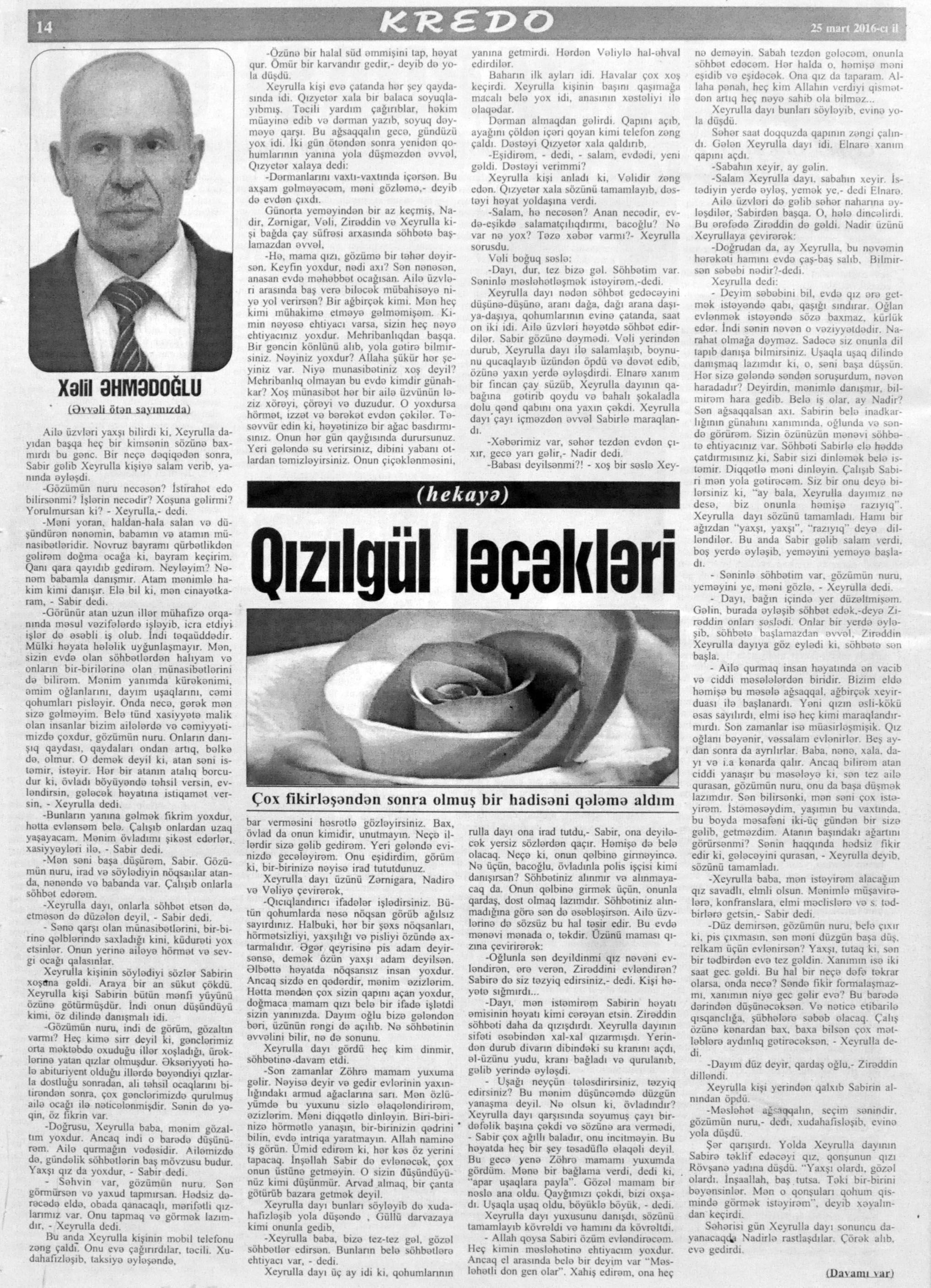 585. Bəxtiyar, N. Bal... //Kredo.-2016.- 31 mart. - S.10. 586. Bəxtiyar, N. Xoruz: Hekayə //Kredo.- 2016.- 18 mart. - S.14. 587. Əhmədoğlu, X. Qızılgül ləçəkləri //Kredo.- 2016.- 18 mart. - S.15. 588. Əhmədoğlu, X. Qızılgül ləçəkləri //Kredo.- 2016.- 25 mart. - S.14. 589. Əhmədoğlu, X. Qızılgül ləçəkləri //Kredo.- 2016.- 31 mart. - S.14. 590. Əliyeva, S. Yazıçının etirafı //Kaspi.- 2016.- 12-14 mart.- S.23. 591. Fərəcov, F. Cavabsız sevgi //Ədəbiyyat qəzeti.- 2016.- 19 mart.- S.29. 592. Kiplinq, R. Alay qızı //Ədəbiyyat qəzeti.- 2016.- 5 mart.- S.12-13. 593. Lagerlyof, S. Milad qonağı: [İsveç ədəbiyyatından tərcümə] /tərc. etdi Qiyas Əyyub //Ədəbiyyat qəzeti.- 2016.- 19 mart.- S.30-31. 594. Mehdi, Q. Əlavə sağlıq //Ədəbiyyat qəzeti.- 2016.- 5 mart.- S.20. 595. Məhərrəmov, V. İnternet sevdası //Ədalət.- 2016.- 19 mart.- S.12. 596. Munro, H. Laura: [ingilis dilindən tərcümə] /tərc etdi Gültən Sevil //Kaspi.- 2016.- 5-7 mart.- S.15. 597. Nəcəfzadə Q. Ağgülün müharibəsi //525-ci qəzet.- 2016.- 31 mart.- S. 8. 598. Otarbayev, M. Budağından qopan yarpaq //Kaspi.- 2016.- 12-14 mart.- S.16-17. 599. Tağıyev, A. Su sonasıı //525-ci qəzet.- 2016.- 15 mart. - S.8. 600. Varis. 2016-cı il martın 15-də, deyim, niyə yağış yağdı... //Ədəbiyyat qəzeti.- 2016.- 19 mart.- S.6-7. 601. Vəli, Ş. Birlikdə üşüyək //Ədəbiyyat qəzeti.- 2016.- 19 mart.- S.7. 602. Zəngəzurlu, S. Cəza //Ədəbiyyat qəzeti.- 2016.- 12 mart.- S.31.