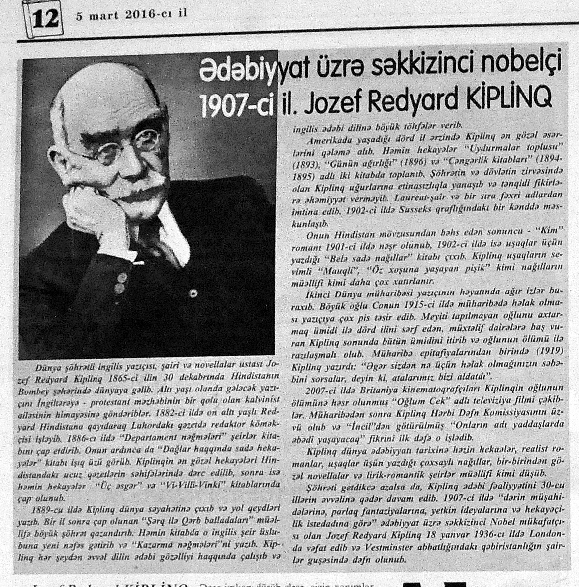624. Abbaslı, T. Bizim Elməddin müəllim!: [əsl alim, milli keçmişimizin ən müasir Məcnunu – Elməddin Məhəmməd oğlu Əlibəyzadə haqqında] //Mədəniyyət.- 2015.- 18 mart - S.13. 625. Abbaslı, T. Fikirləri dupduru...: misraları dipdiri: “Güllələr demədi, qayıdın geri, hələ uşaqsınız - nə yaşınız var...”: [şair, tərcüməçi, publisist İsa İsmayılzadə haqqında] //Mədəniyyət.- 2016.- 16 mart.- S. 10. 626. Abbaslı, T. Manaf Süleymanov: Nağıl-noğul şirəli, dastan-qəzəl ləzzətli, kinofilmlər kimi canlı qələm sahibi: [yazıçı haqqında] //Mədəniyyət.- 2016.- 2 mart.- S. 13. 627. Albalıyev, Ş. Danışan ürəkdirsə...: [şair Əbülfət Mədətoğlunun “Ürəyim sənlə danışır” kitabı haqqında] //Kredo.- 2016.- 18 mart.- S.16. 628. Anarın "Dədə Qorqud" kinopovesti Özbəkistan mətbuatında //525-ci qəzet.- 2016.- 10 mart.- S.7. 629. Anarqızı, G. Atama məktub və ya etiraflı təbrik //525-ci qəzet.- 2016.- 15 mart.- S.4. 630. Aydın, X. Dürüst yaşamdan doğulan yuxular: Səlim Babullaoğlunun “Ədəbi yuxular” kitabının müzakirəsi //Kaspi.- 2016.- 5-7 mart.- S. 16. 631. Azərbaycan Prezidenti İlham Əliyev Xalq yazıçısı Maqsud İbrahimbəyovun məzarını ziyarət edib //Azərbaycan.- 2016.- 29 mart.- S.2. 632. Azərbaycan yazıçısı beynəlxalq “Təbəssüm” ordeninə layiq görülüb: [Aygün Bünyadzadə Polşada] //Mədəniyyət.- 2016.- 8 mart.- S. 7. 633. Babayev, B. Bir də gəlməyəcək: [yazıçı Rəşad Məcidin eyniadlı kitabı haqqında] //Kredo.- 2016.- 31 mart. - S.8-9. 634. Bahar oğlu yad olundu: [Beynəlxalq Muğam Mərkəzində yazıçı-dramaturq Cəfər Cabbarlının anadan olmasının 117-ci ildönümünə həsr edilmiş eyniadlı ədəbi-bədii gecənin keçirilməsi haqqında] //Mədəniyyət.- 2016.- 30 mart.- S.5; Ədəbiyyat qəzeti.- 2016.- 19 mart.- S.32. 635. Bayramqızı, Ə. “Akademik Heydər Hüseynov” kitabının təqdimatı: [Arzu Hacıyevanın eyniadlı kitabı haqqında] //Xalq qəzeti.- 2016.- 12 mart.- S.9. 636. Bədii sözlə təsvirin ahəngi: [Əliağa Vahidin 120 illik yubileyi ilə əlaqədar şairin “Qəzəllər” kitabının çap olunması haqqında] //Mədəniyyət.- 2016.- 2 mart.- S. 15. 637. Bəşirli, Ə. Ürəyin işığı, sözün rəngi: Yazıçı Nahid Hacızadənin 80 illiyinə //525-ci qəzet.- 2016.- 2 mart.- S.4. 638. Bəşirli, Ə. Ürəyin işığı, sözün rəngi: Yazıçı Nahid Hacızadənin 80 illiyinə //525-ci qəzet.- 2016.- 5 mart.- S.17. 639. Bəşirov, K. “Tələbələrimin ayağına toxunan daş...”: Fəxrəddin Yusifov – 60 //Kredo.- 2016.- 18 mart.- S.4-5. 640. Bəydili, C. “Qurd yüzü mübarəkdir...”: “Qara başım qurban olsun, qurdum, sana...”: ("Dədə Qorqud kitabı"ndan) //Ədəbiyyat qəzeti.- 2016.- 5 mart.- S.6. 641. “Bizim nağıl dünyamız”: [Qusar Rayon Mərkəzi Kitabxanasında görkəmli maarifçi-ədib Abdulla Şaiqin 135 illiyinə həsr olunmuş eyniadlı tədbirin keçirilməsi haqqında] //Mədəniyyət.- 2016.- 11 mart.- S. 10. 642. Cahangirova, N. Müşfiqin Hamid sevgisi: [türk şairi Əbdülhəq Hamid haqqında] //Ədəbiyyat qəzeti.- 2016.- 12 mart.- S.30-31. 643. Cavidan. Popyazarlıq sindromu: [müasir bədii yazılar haqqında] //Ədəbiyyat qəzeti.- 2016.- 12 mart.- S.18. 644. Cavidan. Yazıçının günü: mart ayının 3-ünün bütün dünyada Yazıçılar Günü kimi qeyd olunması haqqında //Ədəbiyyat qəzeti.- 2016.- 5 mart.- S.3. 645. Cavidan. Yuxumdakı o adam: [müəllifin fəlsəfi düşüncələri] //Ədəbiyyat qəzeti.- 2016.- 19 mart.- S.23. 646. Cəfərov, N. Lev Qumilyovun “Qədim türklər”i yaxud türk tarixinin fəlsəfəsi: [rus aliminin yaradıcılığı haqqında] //Ədəbiyyat qəzeti.- 2016.- 5 mart.- S.21. 647. Cəfərov, N. Mifoloji təfəkkür metafizikasının ideya-estetik müasirliyi və ya “Od və büt” ətrafında gəzişmələr: [Hüseynbala Mirələmovun eyniadlı romanı haqqında] //Ədəbiyyat qəzeti.- 2016.- 19 mart.- S.18. 648. Cəmil, A. Ortaq keçmişdən ortaq gələcəyə: “Manas” və “Koroğlu” //Ədəbiyyat qəzeti.- 2016.- 19 mart.- S.28. 649. Çərkəz, S. İğdırda keçən bir gün: Sona Çərkəzlə bölüşdüyüm təəssürat: [şairlə müsahibə]/müsahibəni apardı Əbülfət Mədətoğlu //Ədalət.- 2016.- 16 mart. - S.3. 650. “Dantenin yubileyi” İranda: [Anarın eyniadlı əsərinin nəşr olunması haqqında] //Ədəbiyyat qəzeti.- 2016.- 12 mart.- S.2. 651. Dünyaminqızı, Q. “Anadangəlmə mollanəsrəddinçi” : [nasir, dramaturq Əbdürrəhim bəy Haqverdiyev haqqında] //Kaspi.- 2016.- 18 mart.- S.6. 652. Dünyaminqızı, Q. “Molla Nəsrəddin”in azyaşlı yazarı: [ədəbiyyatşünas alim Əziz Şərif haqqında] //Kaspi.- 2016.- 29 mart.- S. 15. 653. Etibarlı, E. Düşündürən və güldürən...: Əjdər Olun “Canlı lətifələr, əhvalatlar, deyimlər” kitabı haqqında //Kaspi.- 2016.- 19-28 mart.- S.21. 654. Əbdülrəhmanlı, N. Zahid Sarıtorpaq: “Ədəbiyyat qəzeti” “Mən necə yazıçı oldum” layihəsində Nəriman Əbdülrəhmanlı ilə müsahibəni təqdim edir /müsahibəni apardı Mirmehdi Ağaoğlu //Ədəbiyyat qəzeti.- 2016.- 27 fevral.- S.15. 655. Əbilov, A. Koreyalı türkoloq: Bizi birləşdirən keçmişdən gələcəyə: [alimlə müsahibə] //Ədəbiyyat qəzeti.- 2016.- 19 mart.- S.14. 656. Ədəbiyyat üzrə onuncu nobelçi: 1909-cu il. Selma Lagerlyof: [tanınmış isveç yazıçısı haqqında] //Ədəbiyyat qəzeti.- 2016.- 19 mart.- S.30. 657. Ədəbiyyat üzrə səkkizinci nobelçi: 1907-ci il. Jozef Redyard Kiplinq: [tanınmış ingilis yazıçısı haqqında] //Ədəbiyyat qəzeti.- 2016.- 5 mart.- S.12. 658. Əhməd, V. Aqibət axtarıb tapacaq səni…: Bir ürəyi iki yerə paralayıb bölən kimdir?: [şair Beytulla Əfsərin yaradıcılığı haqqında] //Xalq cəbhəsi.- 2016.- 16 mart.- S.14. 65