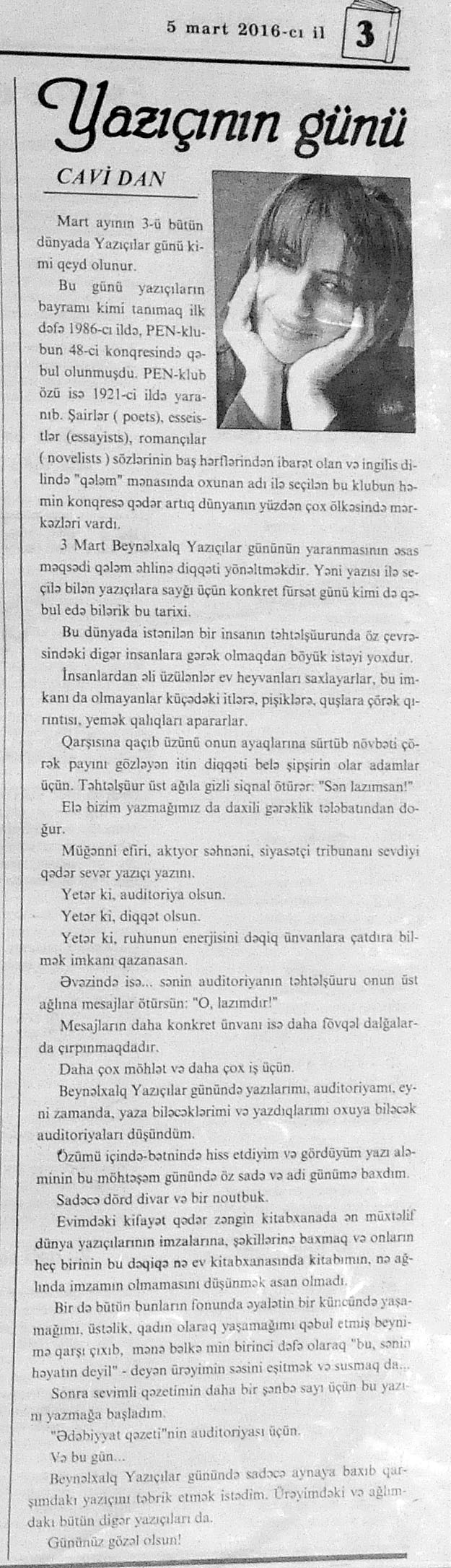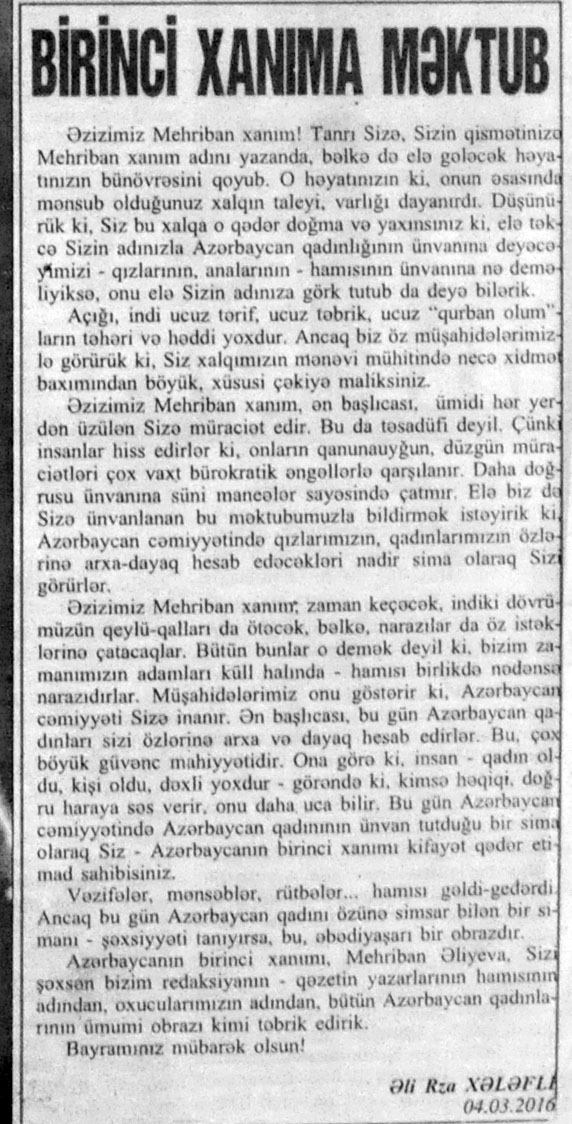 151. Abdullayev, M. Qadın – gözəllik və fədakarlıq rəmzi! //Xalq qəzeti.- 2016.- 8 mart.- S.6. 152. “Azərbaycan incəsənətinin yaradıcı qadınları”: [Gəncə Şəhər Mərkəzi Kitabxanasında Beynəlxalq Qadınlar Günü münasibətilə eyniadlı sərgi-söhbətin təşkil edilməsi haqqında] //Mədəniyyət.- 2016.- 11 mart.- S. 10. 153. Azərbaycanlı aktyorun Kalmıkiyada konserti: [Gənc Tamaşaçılar Teatrının aktyoru İlham Əsədovun Kalmıkiyanın Elista şəhərində “Vostok - delo tonkoe” adlı konsert proqramı ilə çıxışı haqqında] //Mədəniyyət.- 2016.- 16 mart.- S. 6. 154. Bayramınız mübarək, əziz qadınlar! //Azərbaycan müəllimi.- 2016.- 5 mart.- S.7. 155. Beynəlxalq Muğam Mərkəzində Novruz öncəsi konsertlər //Mədəniyyət.- 2016.- 11 mart. - S. 8. 156. Fətəliyeva, S. Azərbaycanda uğurlu dövlət qadın siyasəti həyata keçirilir: Milli Məclisin Beynəlxalq münasibətlər və parlamentlərarası əlaqələr komitəsinin sədr müavini, YAP Beynəlxalq əlaqələr şöbəsinin müdiri Sevinc Fətəliyevanın müsahibəsi //İki sahil.- 2016.- 8 mart.- S.10. 157. Xələfli, Ə. Birinci xanıma məktub: [yazıçı Əli Rza Xələflinin Azərbaycanın birinci xanımı, Heydər Əliyev Fondunun prezidenti Mehriban Əliyevaya məktubu] //Kredo.- 2016.- 5 mart.- S.1. 158. Lalə. “Gözəllik nuru” – qadın və təbiətin zərifliyi: Ənənəvi bayram layihəsi bahar dirçəlişini qadın obrazında təcəssüm etdirir: [Muzey Mərkəzinin qalereyasında] //Mədəniyyət.- 2016.- 8 mart.- S. 8. 159. Masallıda qadınlar bayramına həsr olunmuş tədbir: [konsert proqramı haqqında] //Mədəniyyət.- 2016.- 11 mart.- S.10. 160. Mirməmməd, G. Xeyirxahlıq xanımları birləşdirir: [Beynəlxalq Qadınlar Klubu Azərbaycan Dövlət Filarmoniyasının foyesində yerli məhsullar, sənət əsərləri və əl işlərindən ibarət “Novruz bazarı” xeyriyyə sərgisini keçirməsi haqqında] //Mədəniyyət.-2016.-8mart.-S. 8. . 161. Oruclu, O. Dünyadakı cənnətim //İqtisadiyyat.- 2016.- 4-10 mart.- S.6. 162. Soltan. Bayram sərgisi: [Qusar Dövlət Rəsm Qalereyasında 8 Mart – Beynəlxalq Qadınlar Gününə həsr olunmuş sərginin açılışı haqqında] //Mədəniyyət.- 2016.- 8 mart.- S. 8. 163. “Восток – дело тонкое”...: [Dövlət Gənc Tamaşaçılar Teatrının aktyoru İlham Əsədovun Kalmıkiyada təşkil etdiyi eyniadlı konsert proqramı haqqında] //Üç nöqtə.- 2016.- 14 mart.- S.5. 164. Yunusova, G. “Qızlar bayramı” – “Hina Matsuri”: [Qədim yapon ənənələrinə söykənən bayram haqqında] //525-ci qəzet.- 2016.- 8 mart.- S.7.