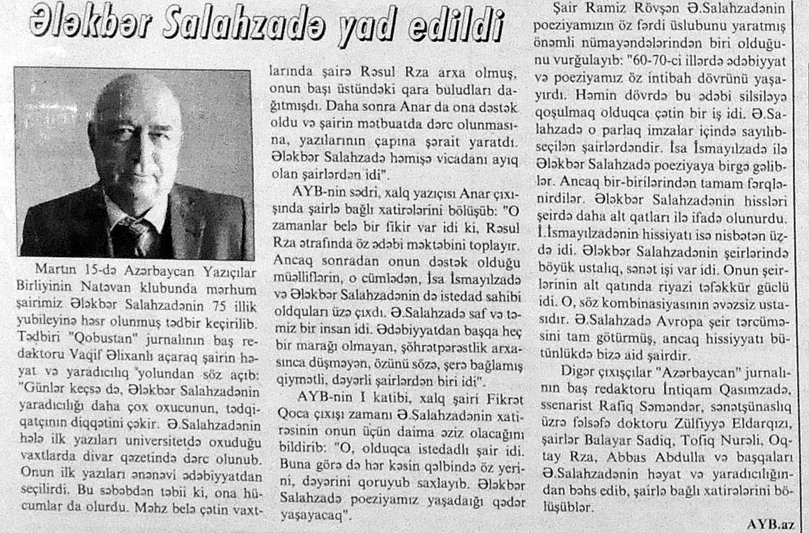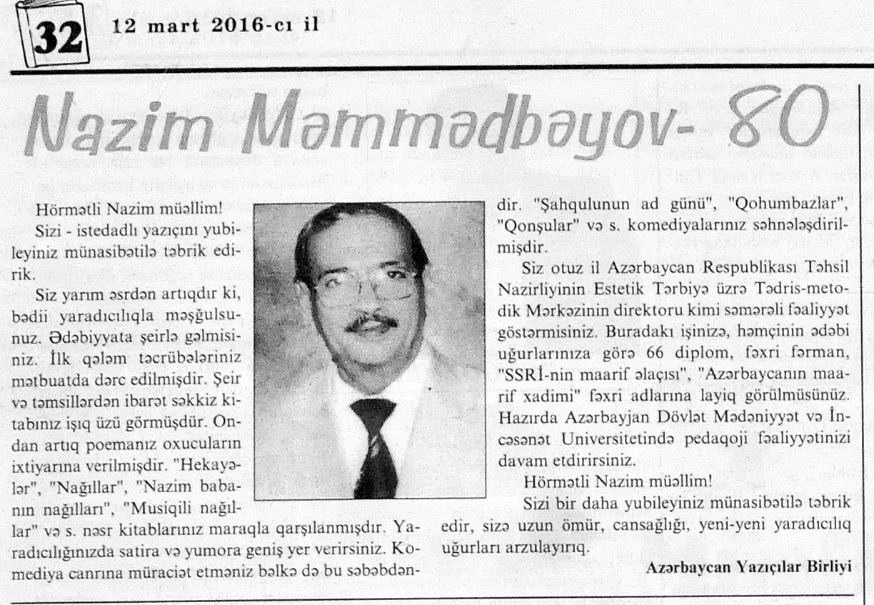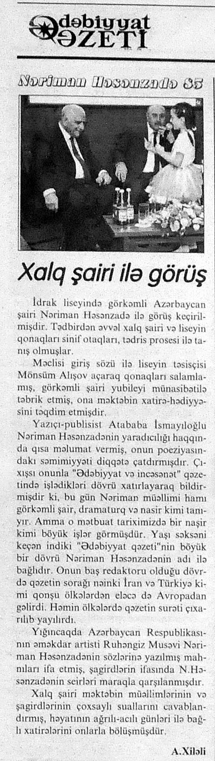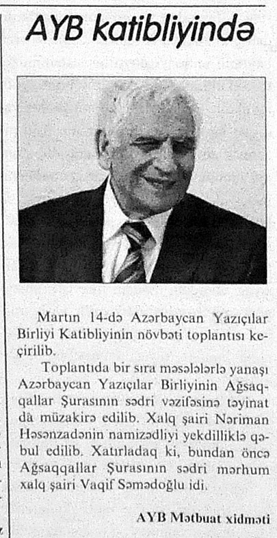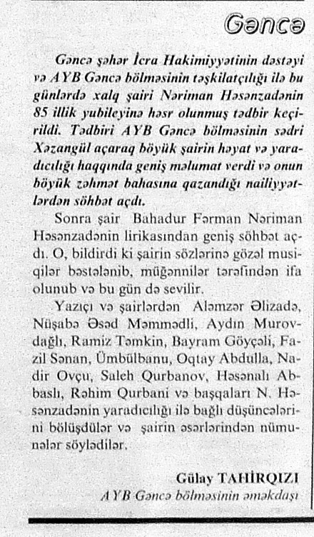 810. AYB katibliyində: [Nəriman Həsənzadənin AYB-nin Ağsaqqallar Şurasının sədri vəzifəsinə seçilməsi münasibətilə keçirilən tədbir haqqında] //Ədəbiyyat qəzeti.- 2016.- 19 mart.- S.2. 811. Xiləli, A. Xalq şairi ilə görüş: [İdrak liseyində keçirilən tədbir haqqında] //Ədəbiyyat qəzeti.- 2016.- 5 mart.- S.7. 812. Qasımbəyli, Y. Şairin sevgi dastanı: Xalq şairi Nəriman Həsənzadənin 85 yaşına ithaf olunur: (Birinci yazı) //Kaspi.- 2016.- 4 mart.- S.6. 813. Nəriman Həsənzadə Yazıçılar Birliyinin Ağsaqqallar Şurasının sədri vəzifəsinə seçildi //Üç nöqtə.- 2016.- 14 mart.- S.6. 814. Tahirqızı, G. Gəncə: [Xalq şairinin yubileyi münasibətilə Gəncə şəhərində keçirilən tədbir haqqında] //Ədəbiyyat qəzeti.- 2016.- 5 mart.- S.9.