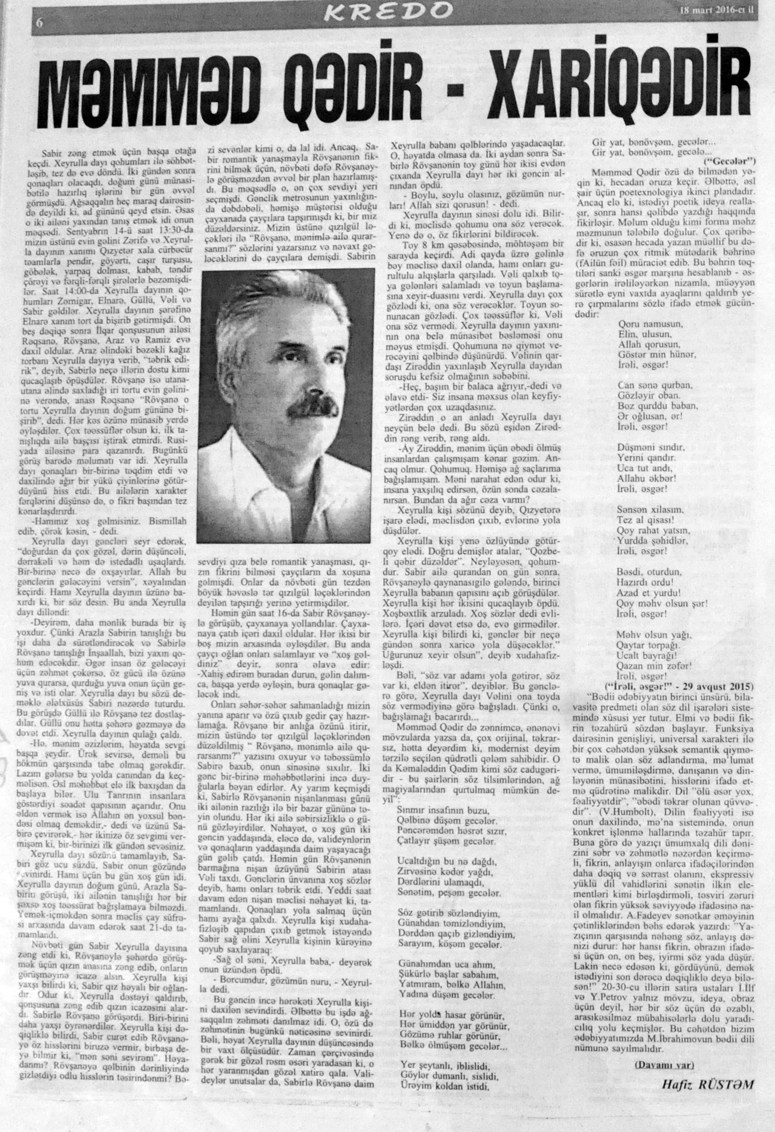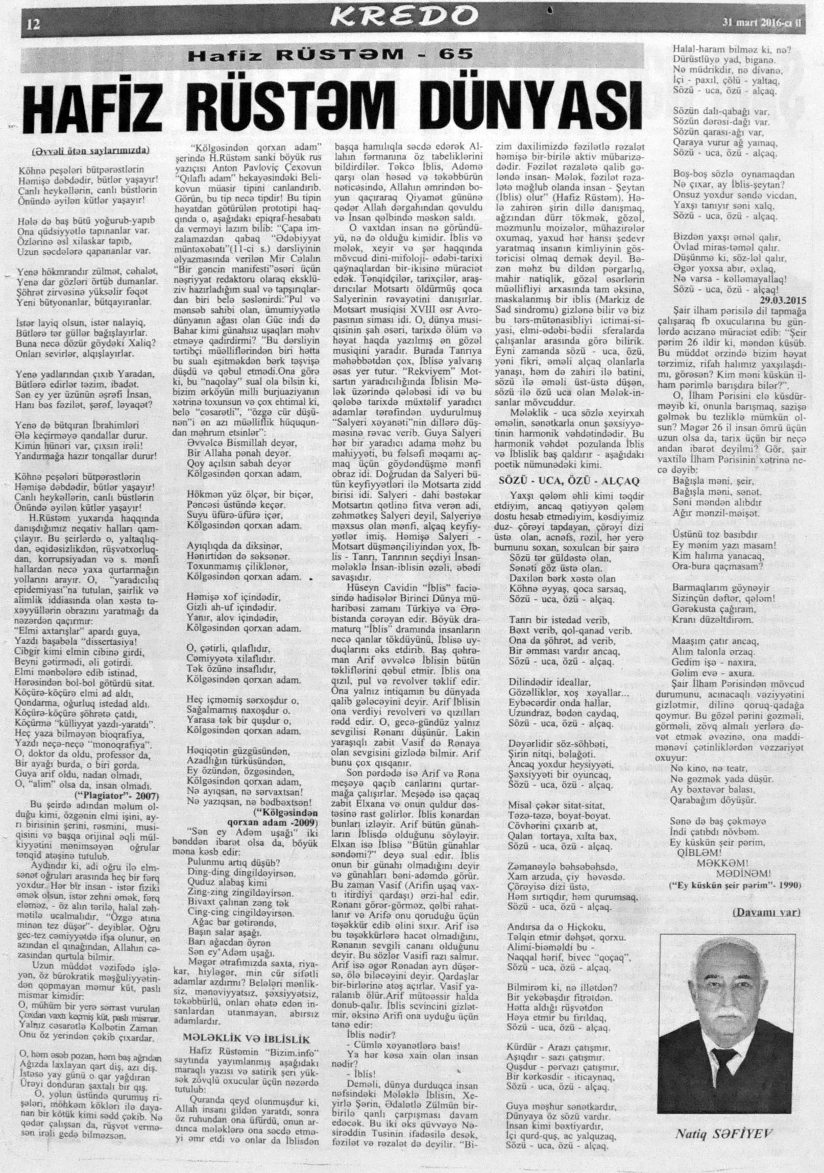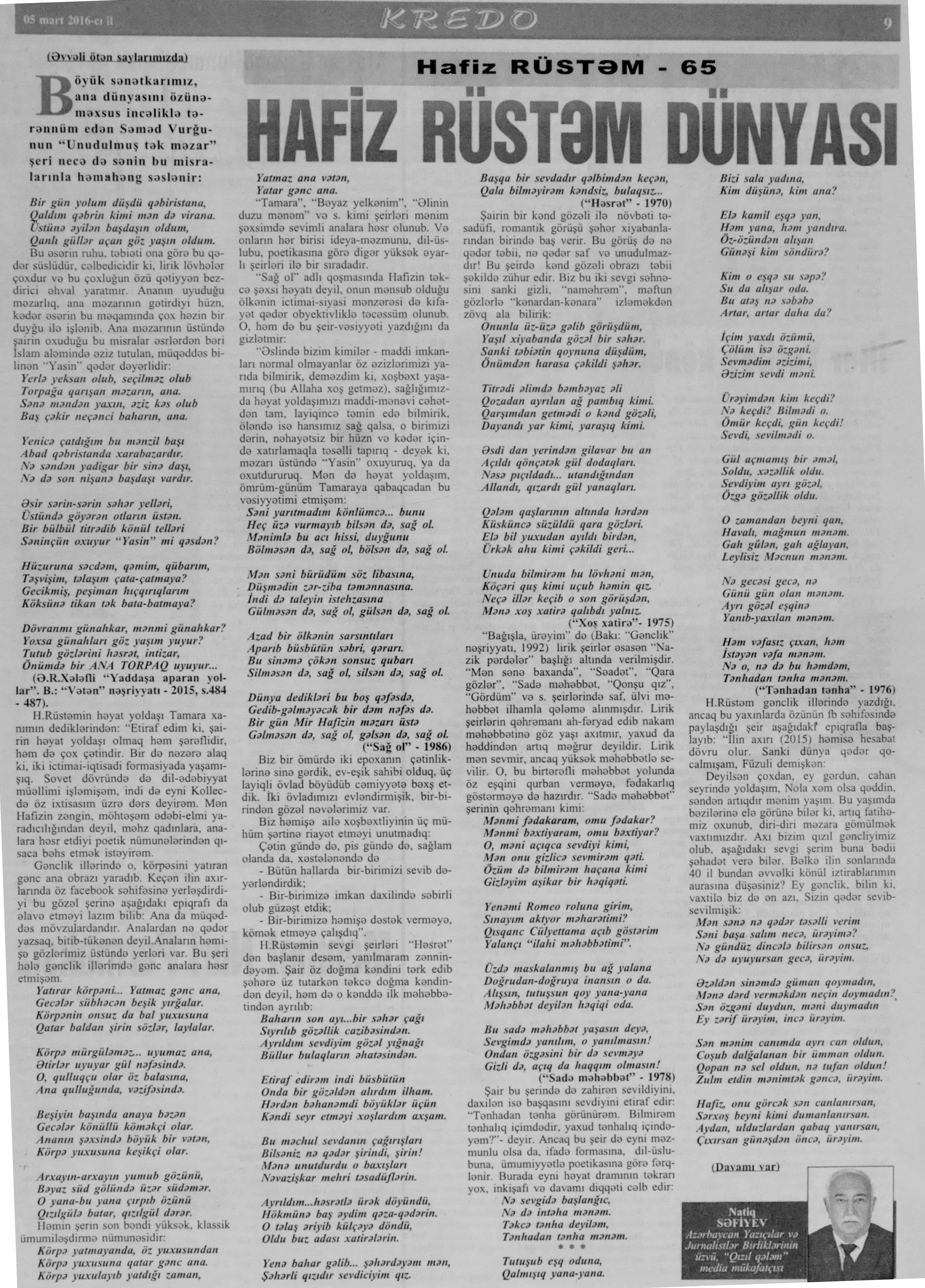 833. Səfiyev, N. Hafiz Rüstəm dünyası: Hafiz Rüstəm – 65: [şair-publisistin yaradıcılığı haqqında] //Kredo.- 2016.- 5 mart.- S.9. 834. Səfiyev, N. Hafiz Rüstəm dünyası: Hafiz Rüstəm – 65: //Kredo.- 2016.- 11 mart.- S.9. 835. Səfiyev, N. Hafiz Rüstəm dünyası: Hafiz Rüstəm – 65: //Kredo.- 2016.- 31 mart.- S.12.