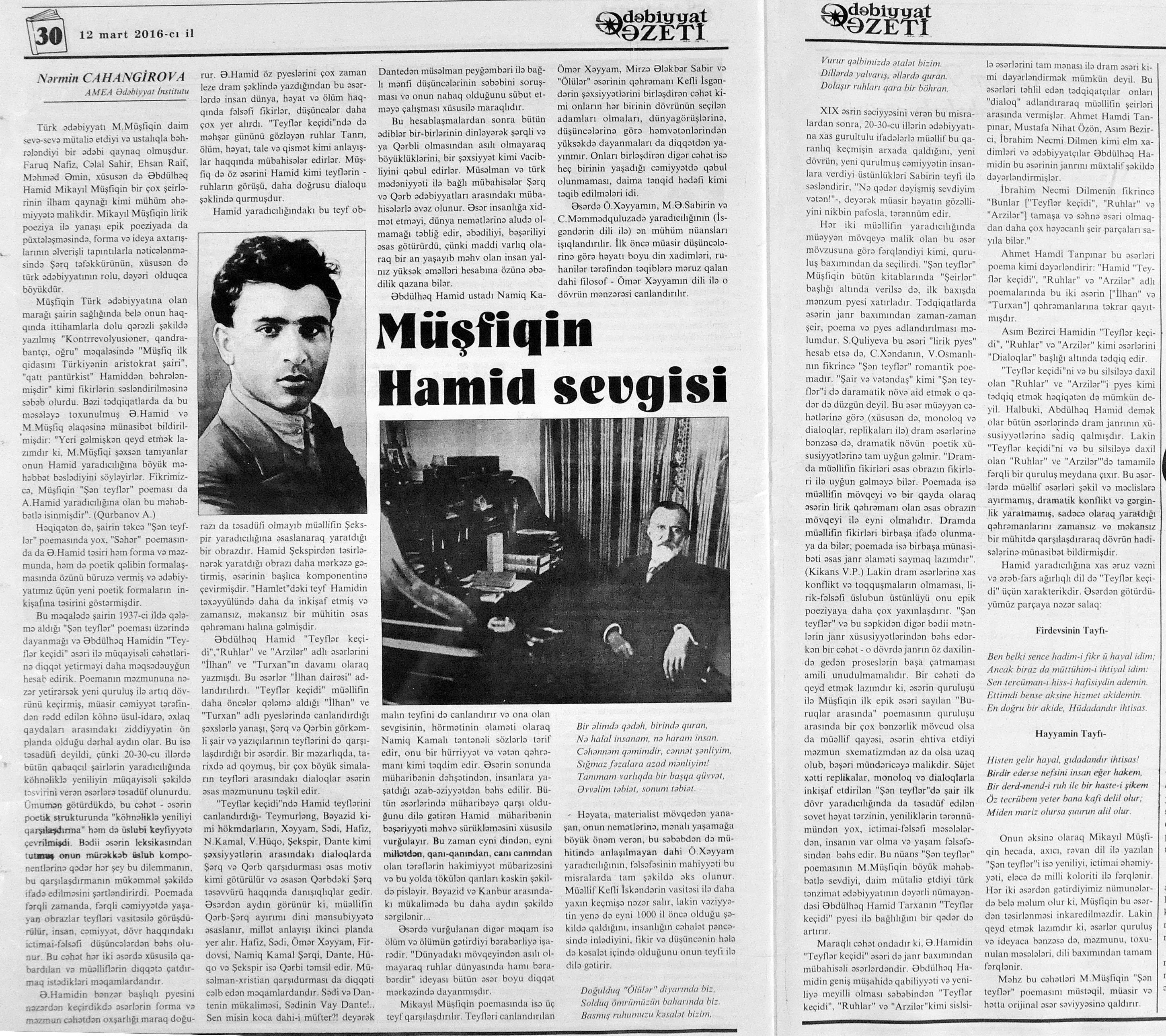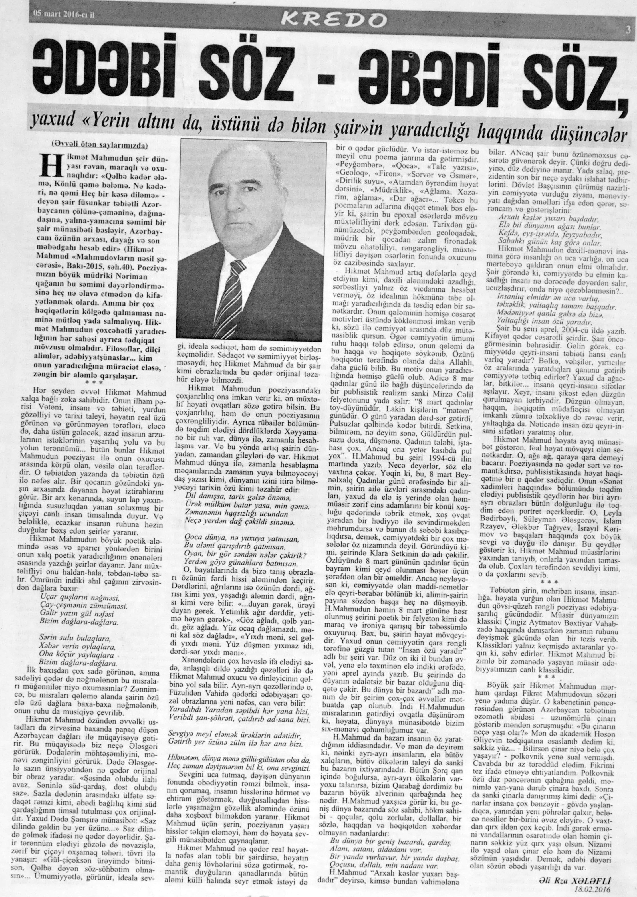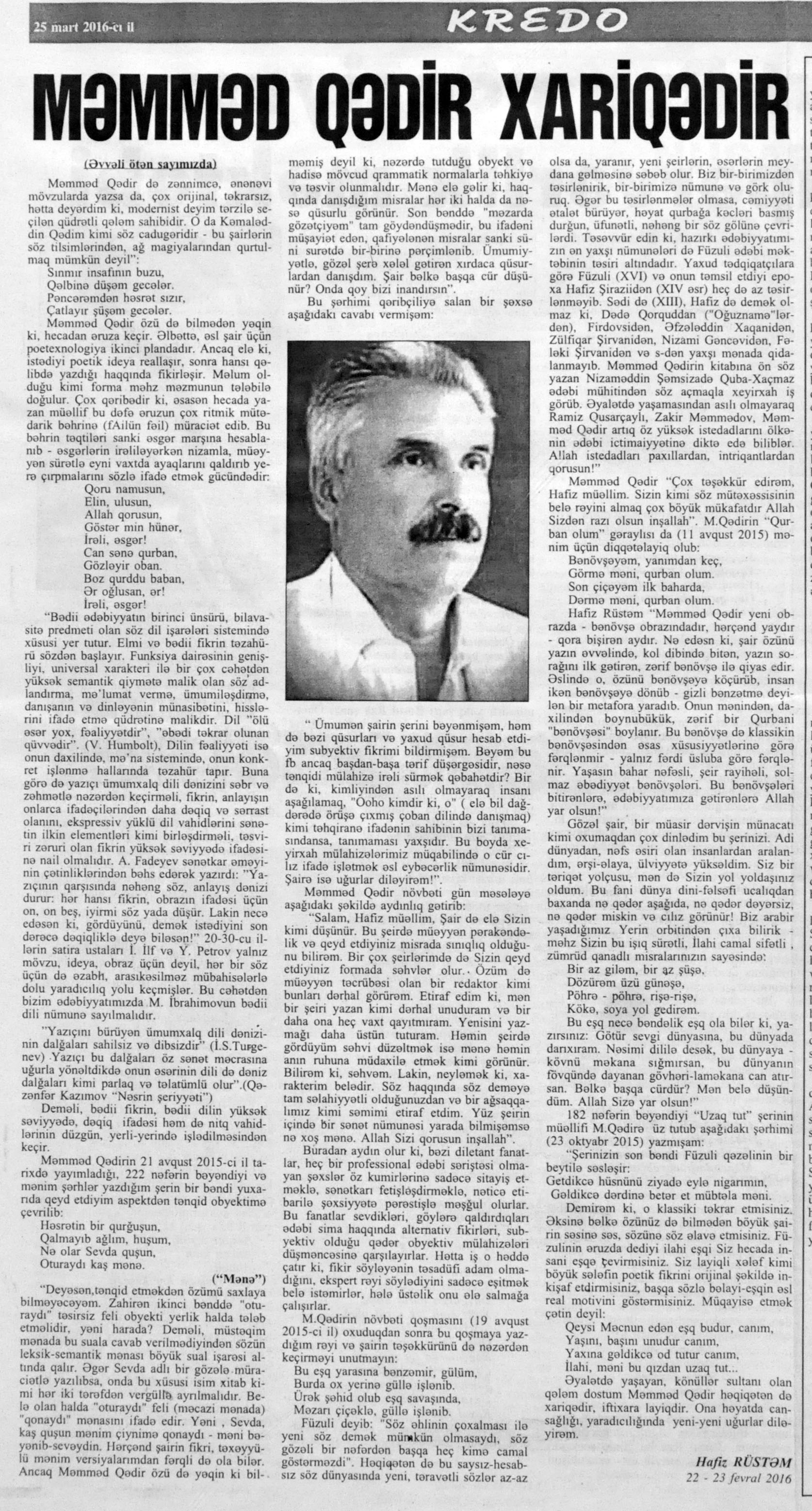 833. Səfiyev, N. Hafiz Rüstəm dünyası: Hafiz Rüstəm – 65: [şair-publisistin yaradıcılığı haqqında] //Kredo.- 2016.- 5 mart.- S.9. 834. Səfiyev, N. Hafiz Rüstəm dünyası: Hafiz Rüstəm – 65: //Kredo.- 2016.- 11 mart.- S.9. 835. Səfiyev, N. Hafiz Rüstəm dünyası: Hafiz Rüstəm – 65: //Kredo.- 2016.- 31 mart.- S.12.