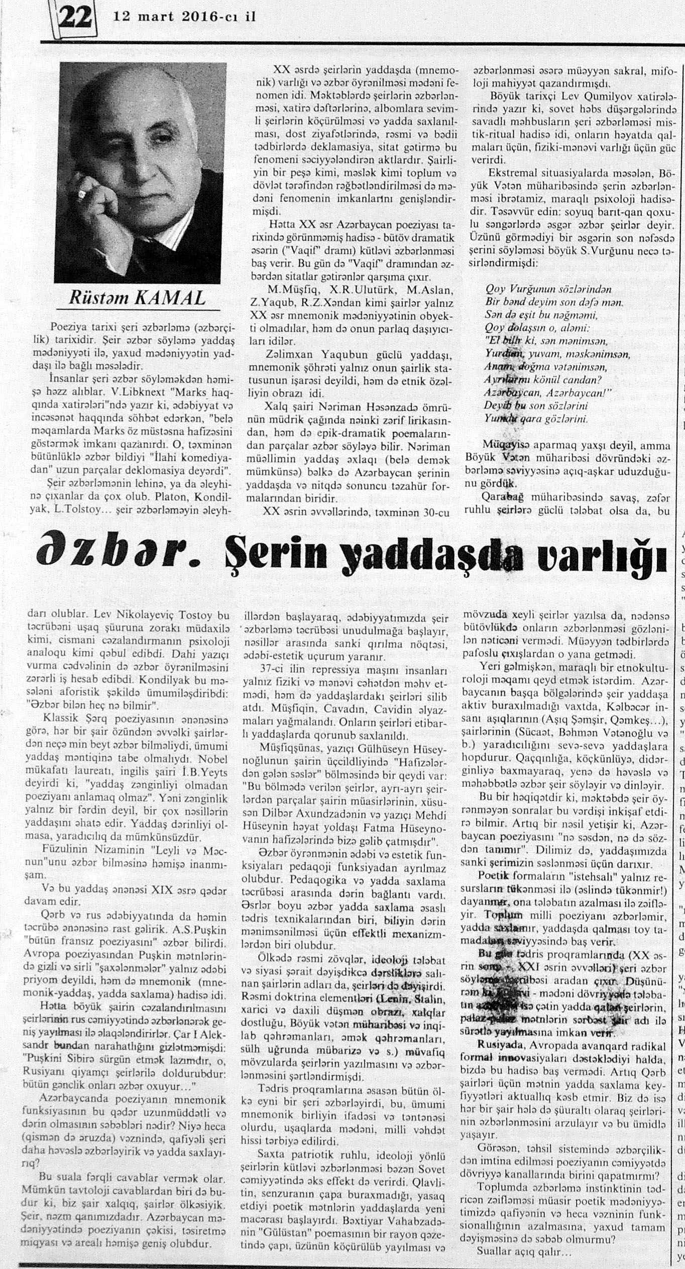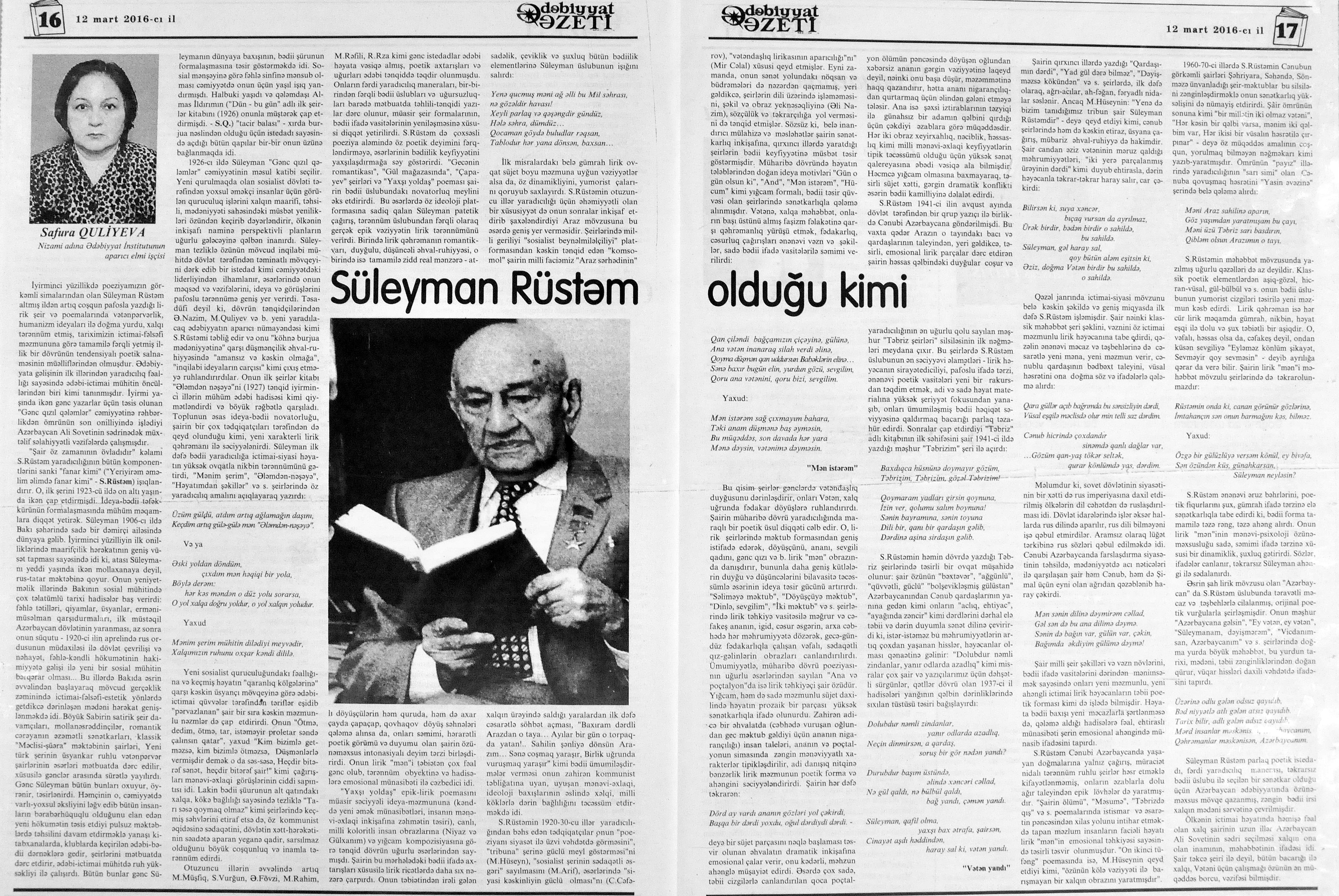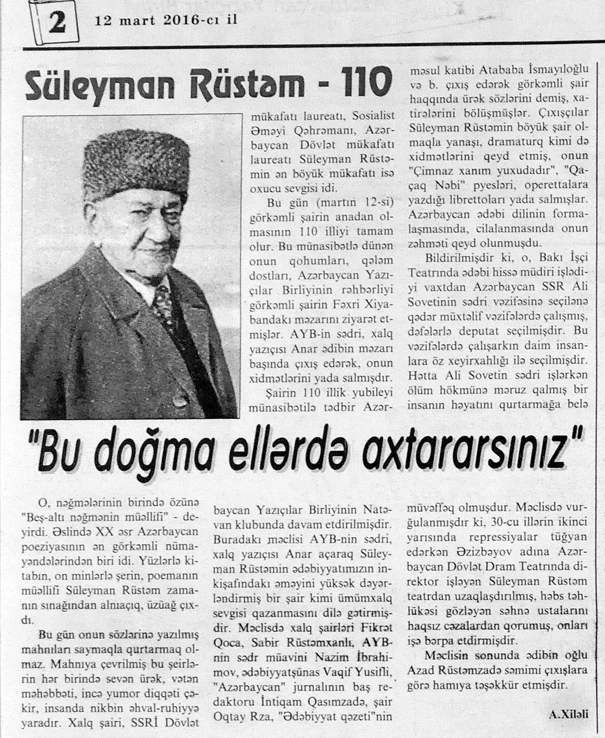 805. Xalq şairinin yubileyinə həsr olunan şeir müsabiqəsi //Mədəniyyət.- 2016.- 16 mart.- S. 11. 806. Xəlilzadə, F. İlhamın qüdrəti, qəlbin həsrəti: [Xalq şairinin poeziyası haqqında] //Kaspi.- 2016.- 12-14 mart.- S. 21. 807. Xiləli, A. Süleyman Rüstəm – 110: [AYB-nın yubileylə bağlı keçirdiyi tədbirlər haqqında] //Ədəbiyyat qəzeti.- 2016.- 12 mart.- S.2. 808. Quliyeva, S. Süleyman Rüstəm olduğu kimi //Ədəbiyyat qəzeti.- 2016.- 12 mart.- S.16-17. 809. Şükürlü, M. Süleyman Rüstəm Yazıçılar Birliyində anıldı //525-ci qəzet.- 2016.- 12 mart.- S. 13.