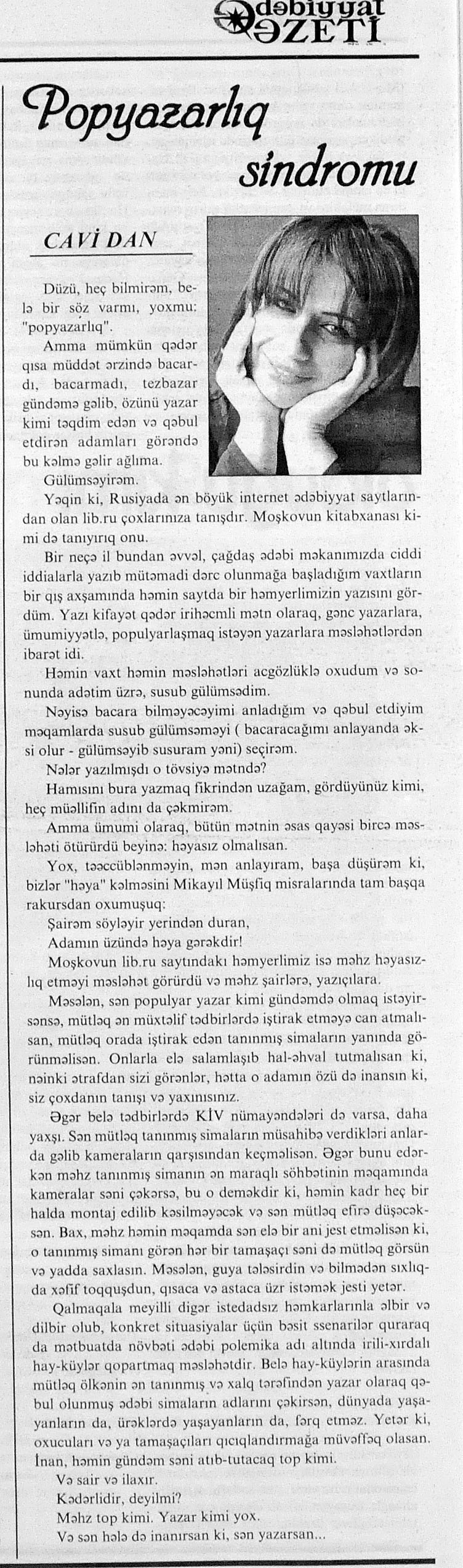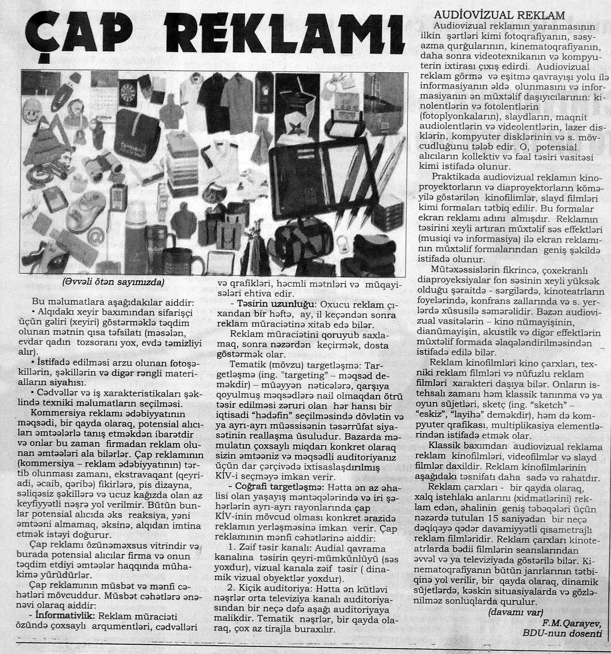 287. Fariz. Gənc reklam menecerləri üçün treninqlər: [Sabunçu Gənclər Evində treninqlərin keçirilməsi haqqında] //Mədəniyyət.- 2016.- 2 mart.- S. 8. 288. Qarayev, F. Çap reklamı //İqtisadiyyat.- 2016.- 11-17 mart.- S.8. 289. Qarayev, F. Çap reklamı //İqtisadiyyat.- 2016.- 18-29 mart.- S.16.