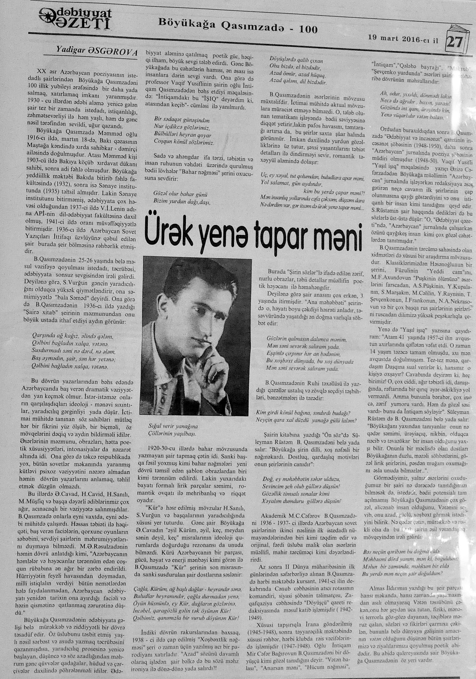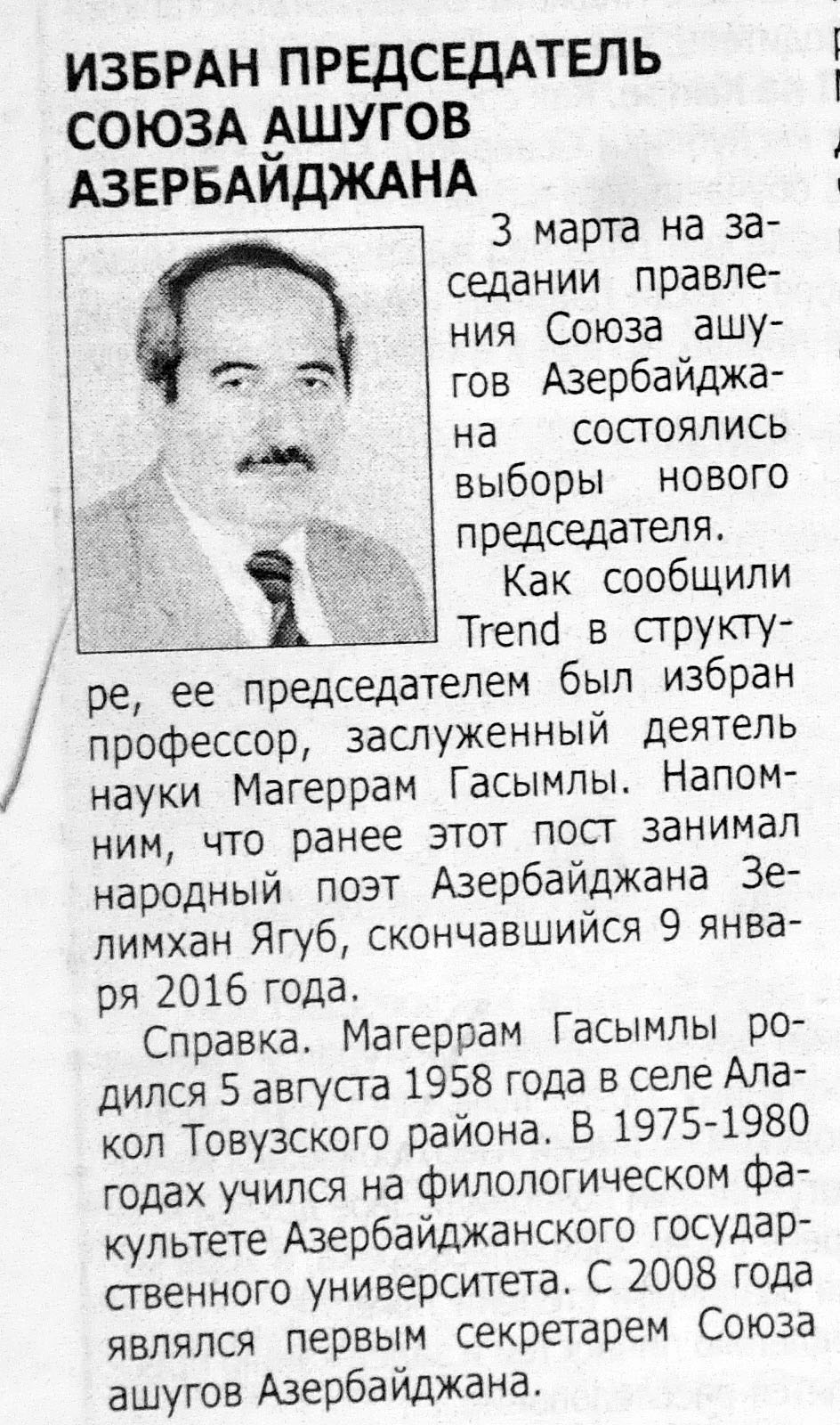 955. Избран председатель Союза Ашугов Азербайджана»: [Магеррам Гасымлы] //Ежедневные новости.- 2016.- 4 марта.- С. 10.