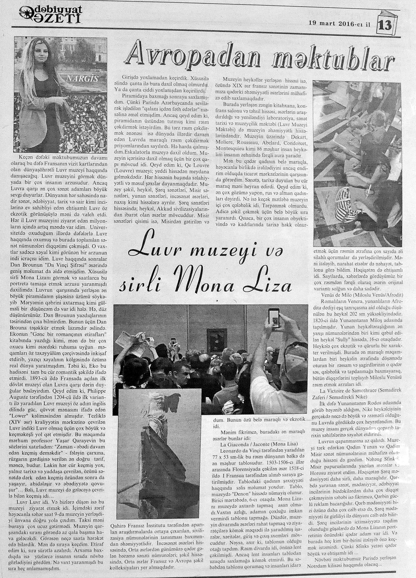 301. “Azərbaycan fəxr edir” miniatür kitabının təqdimatı olub: [Miniatür Kitab Muzeyində] //Azərbaycan.- 2016.- 6 mart- S. 6; Xalq qəzeti 2016.- 5 mart.- S.4; Respublika.- 2016.- 5 mart- S.5. 302. “Barokko dövrünün musiqisi”: Milli İncəsənət Muzeyinin 80 illiyinə həsr olunmuş konsert //Mədəniyyət.- 2016.- 8 mart.- S. 2. 303. Hüseynov, F. Azərbaycan Xalça Muzeyinə yeni direktor təyin edilib: “Muzeyin fəaliyyəti dünyanın ən qabaqcıl muzeyləri səviyyəsində qurulmalıdır” : [Mədəniyyət və Turizm naziri Əbülfəs Qarayevin əmri ilə Şirin Yaşar qızı Məlikovanın Azərbaycan Xalça Muzeyinin direktoru təyin olunması haqqında] //Mədəniyyət.- 2016.- 4 mart.- S.5. 304. Quliyev, Ə. Gözəl sənətin zəngin məkanı: Azərbaycan Milli İncəsənət Muzeyi – 80 //Mədəniyyət.- 2016.- 11 mart.- S.11. 305. Nargis. Avropadan məktublar: Luvr muzeyi və sirli Mona Liza: [Fransanın dünya şöhrətli muzeyi haqqında] //Ədəbiyyat qəzeti.- 2016.- 19 mart.- S.13.