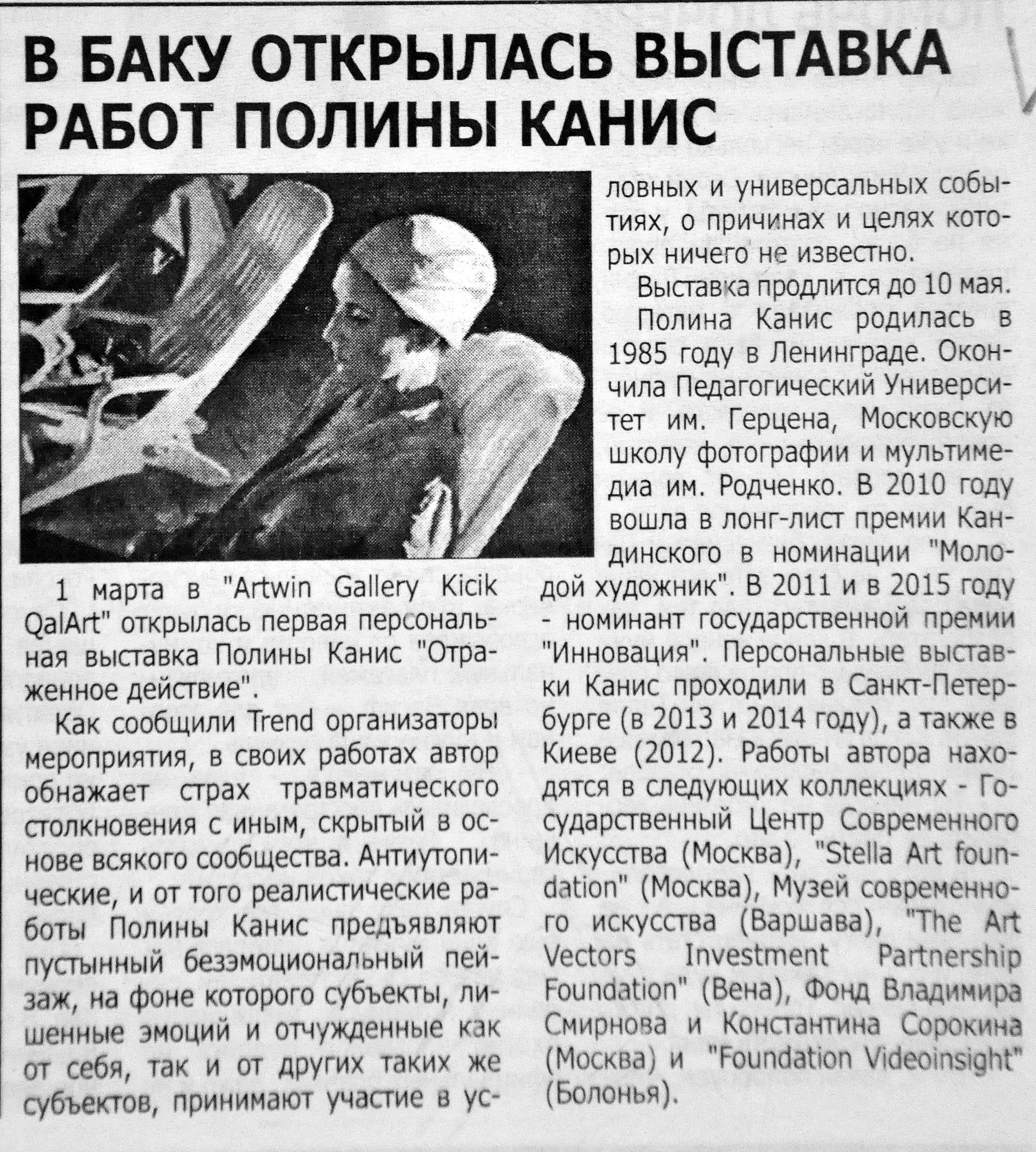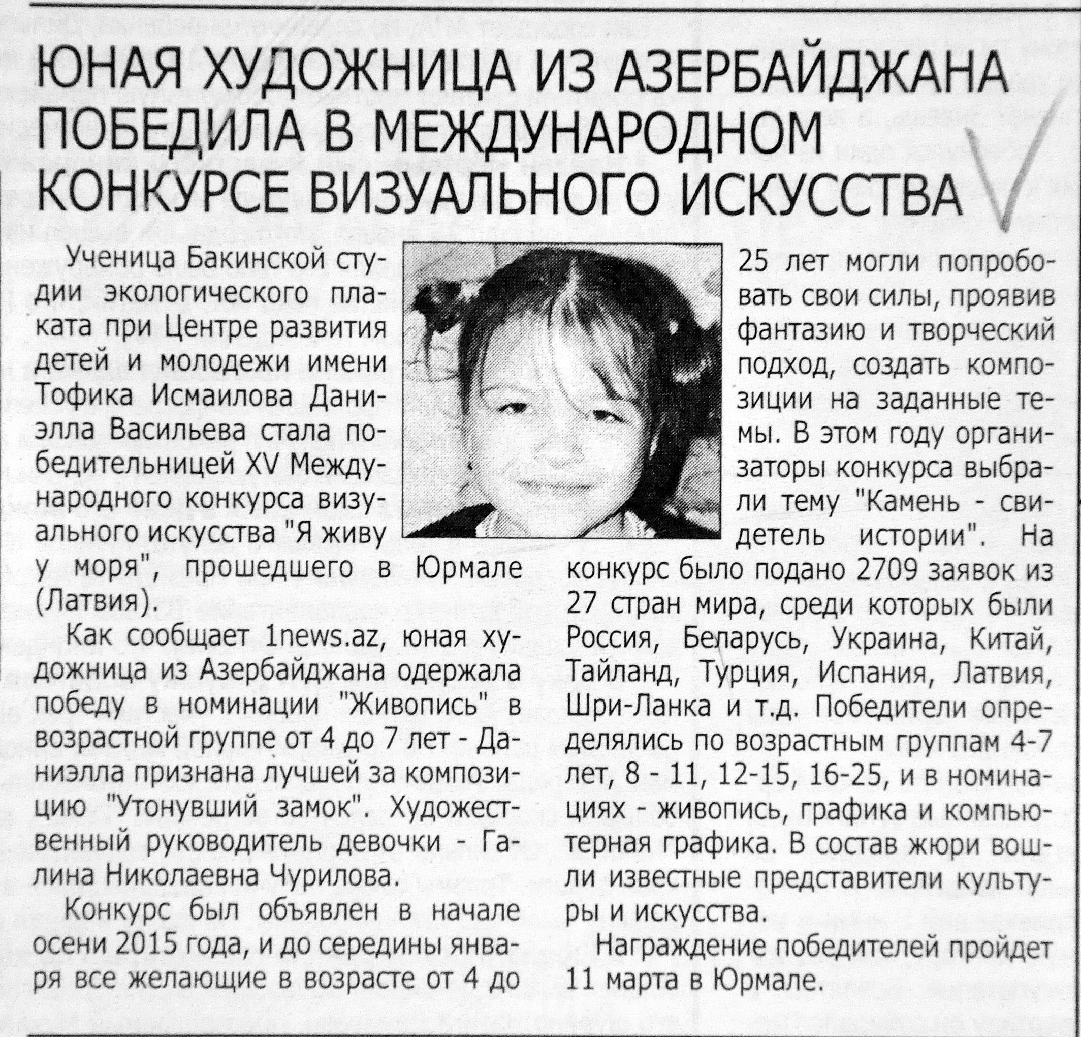 956. Асадова, И. И снова - «Есенин»: [представление детского театра-студии «Гюнай»] //Эхо.- 2016.- 16 марта.- С. 8. 957. Юная художница из Азербайджана победила в Международном конкурсе визуального искусства: [Даниэлла Васильева в Юрмале] //Ежедневные новости.- 2016.- 4 марта.- С. 10.