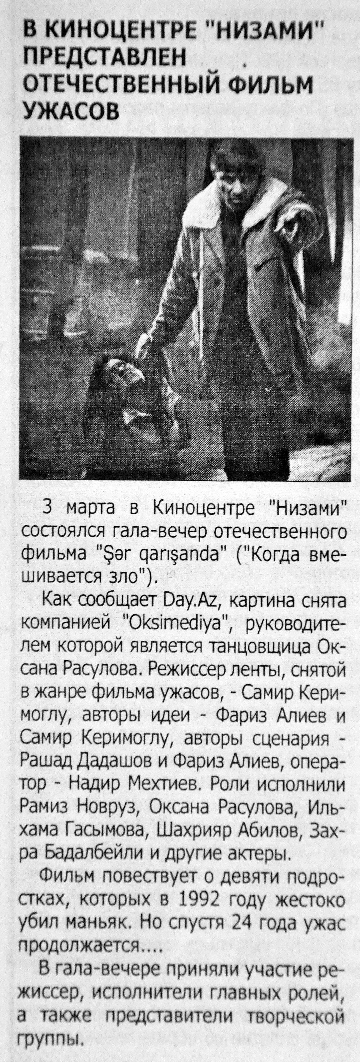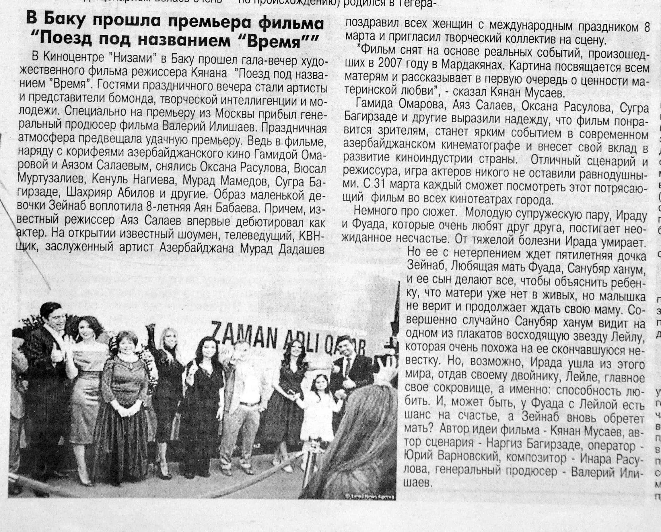 960. Асадова, И. Ильгар Сафат представил свой Içəri Şəhər: Фильм нашел большой отклик в сердцах зрителей, посетивших премьеру //Эхо.- 2016.- 5 марта.- С. 3. 961. Асадова, И. «Поезд под названием «Время»: В Баку прошел гала-вечер отечественного фильма: [режиссера Кянана Мусаева] //Эхо.- 2016.- 10 марта.- С. 8. 962. Асланова, Р. Премьеры историй любви: Презентация азербайджанского мультимедийного проекта «Прогулка» имела большой успех: [кинорежиссер-Рауф Мамедов] //Азербайджанские известия.- 2016.- 5 марта.- С. 3. 963. В Баку прошла премьера фильма «Поезд под названием «Время»: [режиссера Кянана Мусаева] //Неделя.- 2016.- 11 марта.- С. 15. 964. В киноцентре «Низами» представлен отечественный фильм ужасов: [«Когда вмешивается зло» - режиссер Самир Керимоглу] //Ежедневные новости.- 2016.- 4 марта.- С.10. 965. Запущен официальный сайт фестиваля буктрейлеров: [видеороликов] //Эхо.- 2016.- 4 марта.- С. 8. 966. Кязимова, С. Любовь и предубеждение: В киноцентре «Низами» состоялся гала-вечер нового фильма режиссера Ильгара Сафата «Ичери шэхэр» //Азербайджанские известия.- 2016.-3 марта.- С.4. 967. Сафат, И. Внутренний город: Ильгар Сафат: Национальный колорит придает фильму особую атмосферу: [беседа с режиссером-постановщиком фильма «Içəri Şəhər»] /провела В.Третьякова //Каспiй.- 2016.-10 марта.- С.13. 968. Скончался режиссер Фикрет Алиев //Ежедневные новости.- 2016.-11 марта.- С.10. 969. Cтартовал кинофестиваль «Азербайджанская семья - 2016» //Бакинский рабочий.- 2016.-30 марта.- С.4. 970. Халилов, А. Анар Халилов: «Если бы Скорсезе только знал о моем существовании... »: Интервью с героем нового фильма Ильгара Сафата Içəri Şəhər //Эхо.- 2016.-8 марта.- С.8.