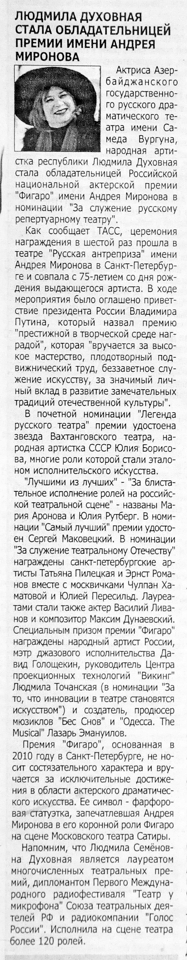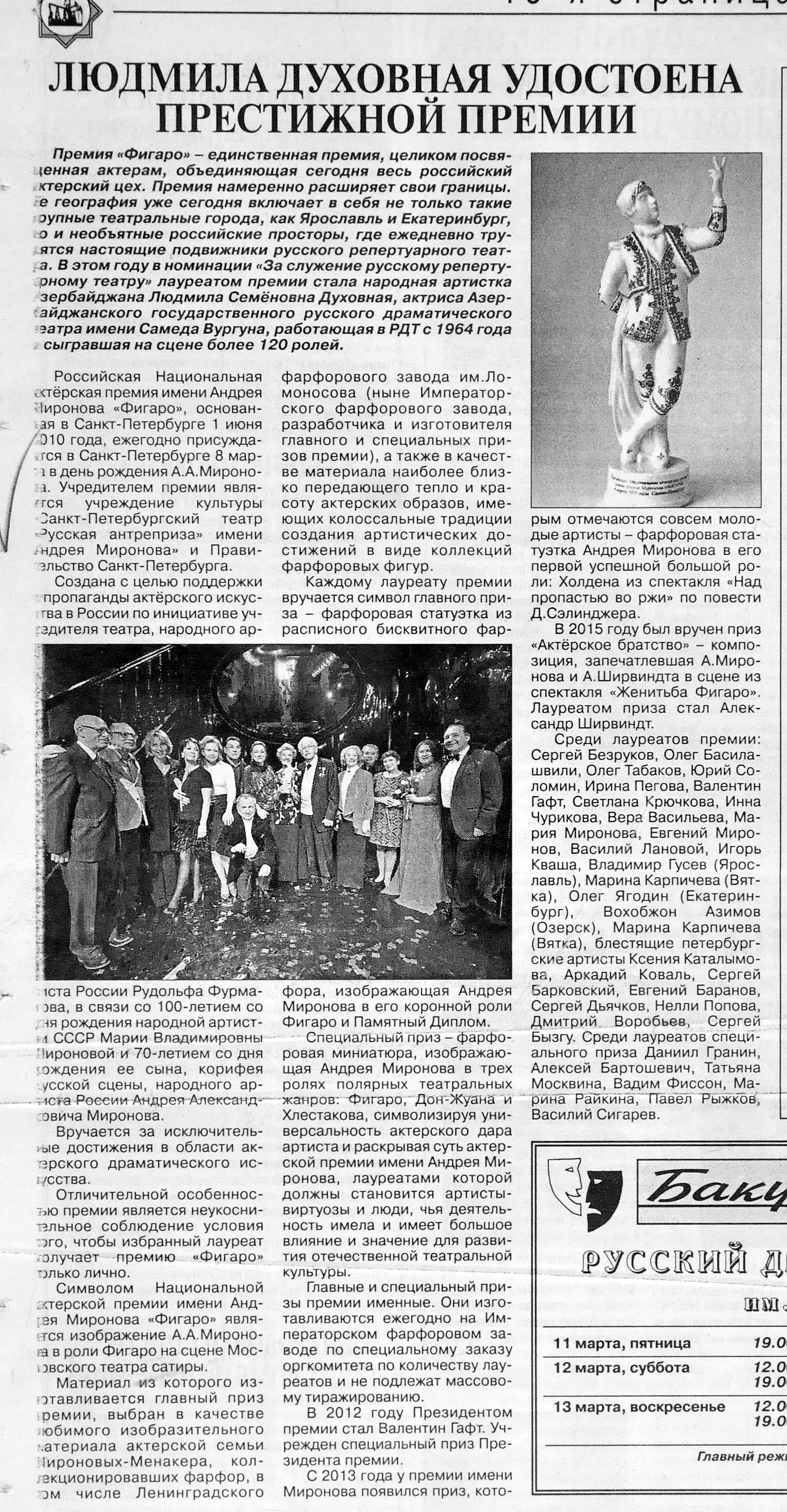 978. Асадова, И. Зрители пообщались с героями спектакля «Гордость и предубеждение»: В Русском Драмтеатре продолжается эксперимент «Открытый диалог: разговор без рампы» //Эхо.- 2016.-1 марта.- С.8. 979. Асадова, И. Ирана Тагизаде и актеры пообщались со зрителем: По окончании спектакля «Еще одна ночь Шахерезады» в Русском Драмтеатре //Эхо.- 2016.-15 марта.- С.8. 980. Людмила Духовная стала обладательницей премии имени Андрея Миронова //Ежедневные новости.- 2016.-11 марта.- С.10. 981. Людмила Духовная удостоена престижной премии //Вышка.- 2016.-11 марта.- С.16. 982. Микеладзе, Г. Королеву делает свита: «Фигаро» - заслуженная и особенная премия Людмилы Духовной //Каспiй.- 2016.-19 марта.- С.18-19. 983. Президент России поблагодарил коллектив Русской Драмы //Ежедневные новости.- 2016.-11 марта.- С.10.