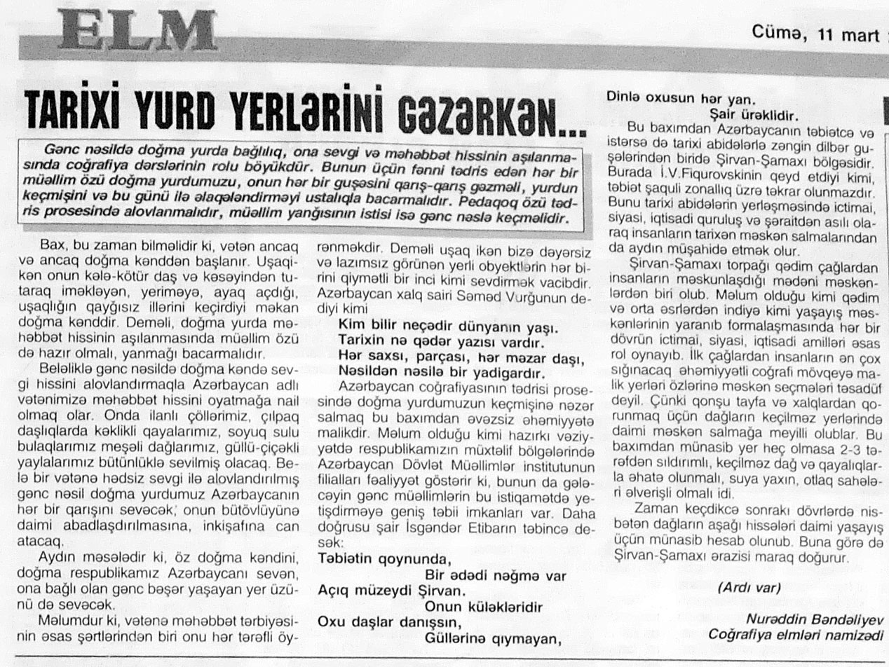 306. Bəndəliyev, N. Tarixi yurd yerlərini gəzərkən... //Elm.- 2016.- 11 mart.- S.7. 307. Cavadov, S. Keçmişə güzgü tutan abidə: [Lənkəranda yerləşən Lənkəran xanı Mir Mustafa xanın nəvəsi Mir Əhməd xanın sarayı barədə] //Azərbaycan.- 2016.- 30 mart.- S.7. 308. “Qədimi qayaüstü incəsənət izləri”: Beynəlxalq mədəni marşrut layihəsi ilə bağlı işlər davam etdirilir //Mədəniyyət.- 2016.- 16 mart.- S. 9.