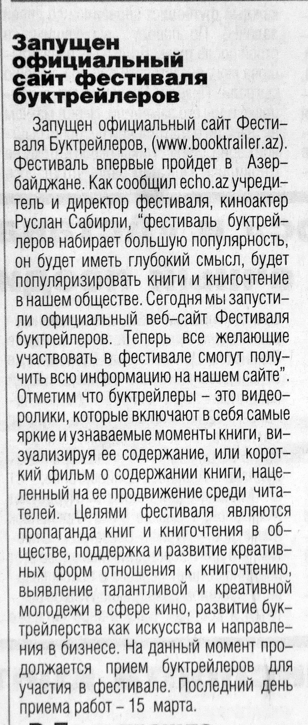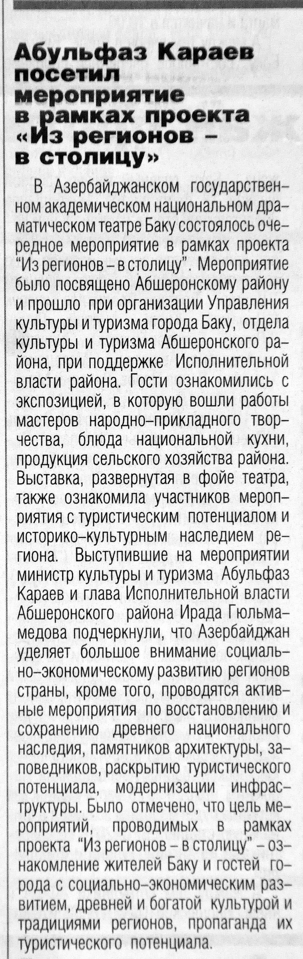843. Абульфас Гараев посетил мероприятие в рамках проекта «Из регионов - в столицу» //Эхо.- 2016.- 2 марта.- С.8. 844. Азербайджанский министр в интервью Радио ООН рассказал о Глобальном форуме Альянса цивилизаций: [Абульфас Гараев] //Бакинский рабочий.- 2016.- 3 марта.- С.2. 845. Асадова, И. Новый меморандум послужит пропаганде детского чтения: Его подписали начальник Управления культуры и туризма Баку и руководитель проекта ATV Kitab //Эхо.- 2016.- 11 марта.- С. 8. 846. Гусар выбран «Столицей фольклора Азербайджана» //Бакинский рабочий.- 2016.- 12 марта.- С. 9. 847. «Из регионов - в столицу» – проект Министерства Культуры и Туризма //Бакинский рабочий.- 2016.- 16 марта.- С. 6; Эхо.- 2016.- 17 марта.- С. 8. 848. Ислам, А. Первый свадебный фестиваль в Азербайджане состоялся в отеле «Кемпински Бадамдар Баку»: [при участии дизайнеров и фотографов, модельеров и организаторов торжеств, декораторов, журналистов и артистов] //Эхо.- 2016.- 4 марта.- С. 8. 849. Озчобан, И. «Роль молодежи в пропаганде и развитии культуры»: [семинар Научно-методического центра культуроведения МКиТ] //Эхо.- 2016.- 16 марта.- С. 8. 850. Səs... Söz... Rəng... — книга о талантливой азербайджанской молодежи: [о композиторах, поэтах и художниках, изданная при поддержке Фонда молодежи при Президенте АР] //Бакинский рабочий.- 2016.- 5 марта.- С. 5.