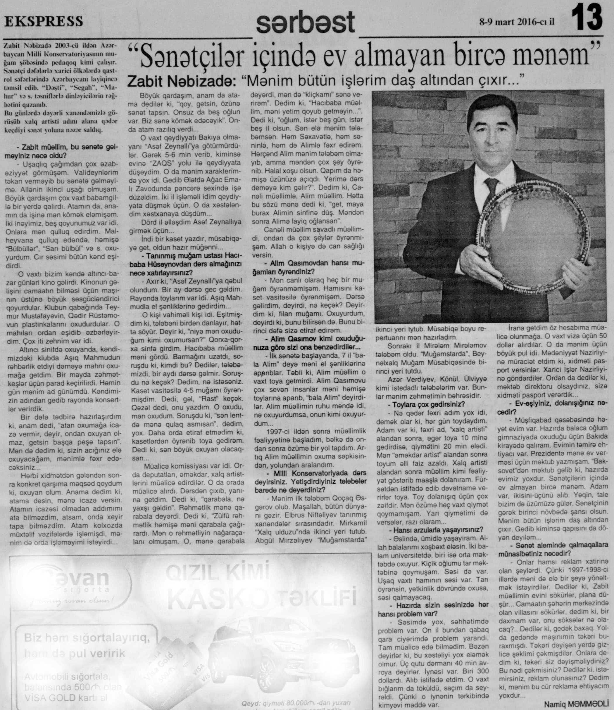 360. Abdullayev, M. “Qaya” adlı həyat”: [Xalq artisti Rauf Babayevin eyniadlı kitabı haqqında] //Xalq qəzeti.- 2016.- 6 mart.- S.7. 361. Abdullayeva, E. “Bu səs heç vaxt batmayacaq”: [Əməkdar artist, xanəndə Elnarə Abdullayeva ilə müsahibə] /müsahibəni apardı Xəyalə Rəis //Kaspi.- 2015.- 31 mart.- S.13. 362. ADMİU-nun tələbəsi beynəlxalq müsabiqənin qalibi olub: [gənc pianoçu Natəvan Dinkayeva İspaniyada keçirilən müsabiqədə] //Mədəniyyət.- 2016.-18 mart.- S. 10. 363. Arzusu Milli Konservatoriyanın tələbəsi olmaqdır: [gənc musiqiçi Zəminə Kərimova haqqında] //Azərbaycan müəllimi.- 2016.- 12 mart.- S.11. 364. Azərbaycanlı dirijor beynəlxalq müsabiqənin münsiflər heyətində: [Əyyub Quliyevin dirijorluğu ilə Astanada keçirilən dirijor və vokal ifaçılarının birinci beynəlxalq müsabiqəsi haqqında] //Mədəniyyət.- 2016.- 30 mart.- S. 4. 365. Bayramlı, N. “Əslində biz sənəti seçmirik, sənət bizi seçir”: [müğənni Nadir Bayramlı ilə müsahibə] /müsahibəni apardı Nərmin Haqverdiyeva //Zaman.- 2016.- 1 mart.- S.6. 366. Beynəlxalq müsabiqənin Qran-Pri mükafatçısı: [gənc fortopianoçu Şəkərxanım Cavadzadə haqqında] //Azərbaycan müəllimi.- 2016.- 12 mart.- S.11. 367. Elnarə Abdullayevanın üç günlük konserti uğurla yekunlaşıb: [Heydər Əliyev Sarayında] //525-ci qəzet.- 2016.- 31 mart.- S.7. 368. Elsevər, S. Belə qəmli dayanma: [bəstəkar Bəhram Nəsibov haqqında] //Kaspi.- 2016.- 2 mart.- S.12. 369. Ələsgərova, K. Musiqi tellərindən dostluq körpüsü [bəstəkar Tofiq Bakıxanovun İran musiqiləri əsasında yazdığı əsərlər haqqında ] //Mədəniyyət.- 2016.- 11 mart.- S. 12. 370. Əlixan Səmədov dostluq konsertində çıxış edib: TÜRKSOY-un dəstəyi ilə Vaşinqtonda qala-gecə keçirilib //Mədəniyyət.- 2016.- 16 mart.- S. 16. 371. Əmiraslanov, Z. Ən yaxşı iş vətənə qulluq etməkdir: [Əməkdar artist Zaur Əmiraslanovla müsahibə] /müsahibəni apardı Xəyalə Rəis //Kaspi.- 2016.- 11 mart.- S.11. 372. Əsəd, F. Əllərinin dalınca uçan adam: [dünya şöhrətli maestro Niyazi haqqında] //Ədəbiyyat qəzeti.- 2016.- 5 mart.- S.30-31. 373. Əyyub Quliyev beynəlxalq müsabiqənin münsiflər heyətində: [Qazaxıstanda keçirilən vokal ifaçılarının müsabiqəsində dirijorun iştirakı haqqında] //525-ci qəzet.- 2016.- 30 mart.- S. 4. 374. Əziz, A. Müəllimlikdən müğənniliyə: [Əməkdar artist Baloğlan Əşrəfovla müsahibə] //Kaspi.- 2016.- 11 mart.- S.12. 375. Fərəcov, S. Xalq artisti ilə vida mərasimi: [Rəşid Behbudov adına Dövlət Mahnı Teatrında Xalq artisti İlhamə Quliyeva ilə keçirilən vida mərasimi haqqında] //Mədəniyyət.- 2016.- 2 mart.- S.6. 376. Fərəcov, S. İncəsənət Gimnaziyası kamera orkestrinin yubiley konserti //Mədəniyyət.- 2016.- 16 mart.- S. 5. 377. Fərəcov, S. “Qadın, zəriflik, musiqi”: Tanınmış bəstəkar, Əməkdar incəsənət xadimi Ruhəngiz Qasımova ilə görüş: [Azərbaycan Musiqi Mədəniyyəti Dövlət Muzeyində] //Mədəniyyət.- 2016.- 4 mart.- S. 6. 378. Fərəcov, S. Musiqi məktəbinin muzeydə “Bayram təbrikləri”: [Azərbaycan Musiqi Mədəniyyəti Dövlət Muzeyinin Bülbül adına orta ixtisas musiqi məktəbi ilə birgə təşkil etdiyi tədbir haqqında] //Mədəniyyət.- 2016.- 11 mart.- S. 7. 379. Fərəcov, C. Sənətə məhəbbət nümunəsi: Unudulmazlar: [Xalq artisti Sara Qədimova haqqında] //Azərbaycan.- 2016.- 8 mart.- S. 10, 11. 380. “Gənc qığılcımlar” festival-müsabiqənin qalibi olub: [Gəncə Musiqi Kollecinin eyniadlı ansamblı haqqında] //Mədəniyyət.- 2016.- 30 mart.- S. 7. 381. Görkəmli musiqiçilərin dostluğu: [Mstislav və Leopold Rostropoviçlərin ev-muzeyində məşhur ispan violonçelisti Pablo Kazalsın 140 illiyinə həsr olunmuş tədbirin keçirilməsi haqqında] //Mədəniyyət.- 2016.- 4 mart.- S. 12. 382. Heydər Əliyev Mərkəzində Budapeştin Ferens List Kamera Orkestrinin konserti keçiriləcək //Yeni Azərbaycan.- 2016.- 15 mart.- S.5 383. Hərbçilərə musiqi töhfəsi: [Bərdə Rayon Mədəniyyət Mərkəzinin “Qarabağ” xalq çalğı alətləri ansamblının ifasında] //Mədəniyyət.- 2016.- 16 mart.- S. 11. 384. Hüseynov, F. Görkəmli bəstəkar Zakir Bağırovun xatirəsi yad edilib: [100 illiyi ilə bağlı] //Mədəniyyət.- 2016.- 18 mart.- S. 6. 385. Hüseynov, F. Muğam Mərkəzində musiqi beşiyinin təqdimatı: “Bölgələrdən paytaxta” layihəsinin növbəti tədbiri Şuşaya həsr olunmuşdu: [Beynəlxalq Muğam Mərkəzində keçiirilən tədbirdə Mədəniyyət və Turizm naziri Əbülfəs Qarayev çıxış edib] //Mədəniyyət.- 2016.- 16 mart.- S. 4. 386. Xəlilzadə, F. Tarı bülbül kimi oxuyurdu: Hacı Məmmədovun tarı bu gün də susmayıb //Kaspi.- 2016.- 1 mart.- S.13. 387. İsmayılova, S. “Həyat yoldaşımın sözü bizim üçün qanundur”: [Xalq artisti Səkinə İsmayılova ilə müsahibə] /müsahibəni apardı Namiq Məmmədli //Ekspress.- 2016.- 19-28 mart. - S.13. . 388. “İstedad Mərkəzi”nin növbəti konserti: [Qara Qarayev adına Mərkəzi İncəsənət Məktəbində] //Mədəniyyət.- 2016.- 16 mart.- S. 4. 389. “İstedad mərkəzi”nin konsert proqramı: Yaponiyanın “VA-LİQA” musiqi qrupu İsmayıllıda çıxış edib: [Beynəlxalq Muğam Mərkəzində] //Mədəniyyət.- 2016.- 4 mart. - S. 4. 390. İsveçrədə keçirilən müsabiqədə həmyerlimiz laureat olub: [Vurğun Vəkilov haqqında] //Mədəniyyət.- 2016.- 16 mart.- S. 6. 391. Kərimi, S. “Xaricilərə muğamı öyrətməyin yeni metodunu yaradırıq”: [Xalq artisti Siyavuş Kərimi ilə müsahibə] /müsah. apardı S.Soltanlı //Mədəniyyət.- 2016.- 8 mart.- S.10. 392. Mahmudova, C. Şəhid xatirəsinə layiqli ithaf: Bəstəkar Oqtay Rəcəbovun “Çingiz” simfoniya-rekviyemi haqqında qeydlər //525-ci qəzet.