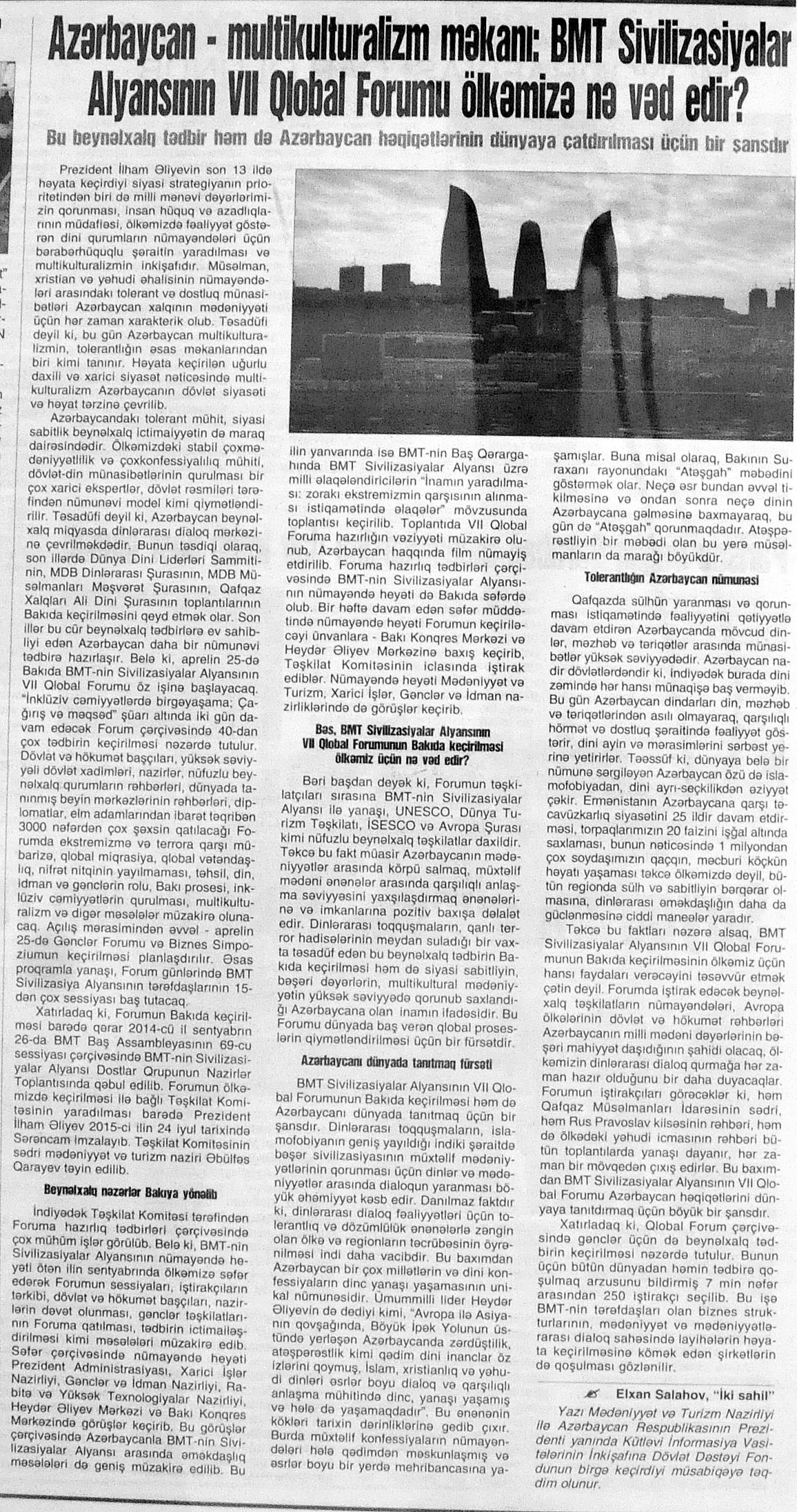 56. Abdullayeva, F. Rusiya ekspertləri: Azərbaycan dünyaya təcrübədən qaynaqlanan hörmət ideologiyası təklif edir: [forumu çərçivəsində ekspertlərin fikirləri haqqında] //Azərbaycan.- 2016.- 12 mart.- S. 5. 57. Azərbaycan ilə İSESCO arasında sıx əməkdaşlıq mövcuddur: Bu fikir birinci xanım Mehriban Əliyevanın İSESCO-nun Baş direktoru ilə görüşündə səslənib //Azərbaycan.- 2016.- 11 mart.- S. 7. 58. Azərbaycan mədəniyyətlərarası dialoqun keçirilməsi üçün ideal məkandır: [forumda iştirak edən Livanın sabiq Baş naziri Fouad Sinioranın fikirləri] //Azərbaycan.- 2016.- 12 mart.- S. 5. 59. Azərbaycan Prezidenti İlham Əliyevin adından IV Qlobal Forumunun iştirakçılarının şərəfinə ziyafət verilib //Azərbaycan.- 2016.- 11 mart.- S. 4. 60. Azərbaycanın birinci xanımı Mehriban Əliyeva Albaniyanın birinci xanımı Odeta Nişani ilə görüşüb //Azərbaycan.- 2016.- 11 mart.- S. 7. 61. Azərbaycanın birinci xanımı Mehriban Əliyeva Latviyanın sabiq birinci xanımı ilə görüşüb //Azərbaycan.- 2016.- 11 mart.- S. 7. 62. Baxşəliyev, R. Azərbaycanın beynəlxalq nüfuzunun növbəti təsdiqi: IV Qlobal Bakı Forumu ölkəmizə həm də iqtisadi dividendlərin qazanılmasında yeni yollar açacaq:[Millət vəkillərinin forum haqqında fikirləri] //Azərbaycan.- 2016.- 29 mart.- S.4. 63. Bakıda Qarşılıqlı Fəaliyyət Şurasının 33-cü illik plenar iclası keçirilib: IV Qlobal Bakı Forumu //Azərbaycan.- 2016.- 10 mart.- S. 8. 64. Boris Tadiç: “Azərbaycan Cənubi Qafqazda xüsusi əhəmiyyətə malik ölkədir”: [forumda iştirak edən Serbiyanın sabiq prezidentinin fikirləri] //Azərbaycan.- 2016.- 11 mart.- S. 9. 65. Cəfərli, R. Bəşəriyyəti düşündürən problemlərin həllinə xidmət edən platforma //Azərbaycan.- 2016.- 29 mart.- S. 4. 66. Çoxqütblü dünyaya doğru: IV Qlobal Bakı Forumunda münaqişələrin qarşısının alınmasında dinlərarası dialoqun rolu, miqrasiya, multikulturalizm və inteqrasiya məsələləri müzakirə edilir //Mədəniyyət.- 2016.- 11 mart.- S. 2. 67. Dördüncü Qlobal Bakı Forumu ikinci iş gününü sessiya və panel iclaslarla davam etdirib //Azərbaycan.- 2016.- 12 mart.- S. 4, 5. 68. IV Qlobal Bakı Forumu rəsmi hissədən sonra işini sessiyalarla davam etdirib //Azərbaycan.- 2016.- 11 mart.- S. 7, 9. 69. Əl-Tuveycri: Azərbaycanın ərazi bütövlüyünün bərpası dünyada ədaləti müdafiə edən bütün insanların tələbidir: [forumda iştirak edən ISESCO-nun Baş direktorunun fikirləri] //Azərbaycan.- 2016.- 11 mart.- S. 9. 70. Əsrlərdən gələn multikultural dəyərlərin sənət təcəssümü: IV Qlobal Bakı Forumunun iştirakçıları “Yeddi gözəl” baletinə tamaşa ediblər: [Azərbaycan Dövlət Akademik Opera və Balet Teatrında] //Mədəniyyət.- 2016.- 11 mart.- S. 8. 71. Franko Frattini: “Azərbaycan bütün dünyaya multikulturalizmi təbliğ edir”: [forumda iştirak edən İtaliyanın sabiq Xarici İşlər nazirinin fikirləri] //Azərbaycan.- 2016.- 11 mart.- S.9. 72. Hikmət Çətin: Azərbaycan getdikcə daha böyük uğurlara imza atır: [forumda iştirak edən Türkiyənin sabiq Xarici İşlər naziri Hikmət Çətinin fikirləri] //Azərbaycan.- 2016.- 13 mart.- S.2. 73. İSESCO üzrə Azərbaycan Respublikası Milli Komissiyasının Katibliyi yaradılıb //Mədəniyyət.- 2016.- 11 mart.- S. 4. 74. Kanadanın keçmiş Baş naziri Azərbaycanın mədəniyyətlərarası dialoqa önəmli töhfələr verəcəyinə əmindir: [forumda iştirak edən Jan Çretyenin fikirləri] //Azərbaycan.- 2016.- 10 mart.- S. 8. 75. Qlobal Bakı Forumu aktual məsələlərin müzakirə olunduğu mühüm platformadır: [forumda iştirak edən Beynəlxalq və Avropa Məsələləri üzrə İrlandiya İnstitutunun nümayəndəsi, səfir Fransis O’Donnellin fikirləri] //Azərbaycan.- 2016.- 12 mart.- S.5. 76. Qro Harlem Brudtland: Bakı uğurlu beynəlxalq əməkdaşlığın mərkəzinə çevrilib: [forumda iştirak edən Norveçin sabiq Baş nazirinin fikirləri] //Azərbaycan.- 2016.- 11 mart.- S. 9. 77. Linda Lanzilotta: Bakı Forumunda dünyanı narahat edən problemlərin həllinə dair səmərəli müzakirələr aparıldı: [forumda iştirak edən İtaliya Senatının vitse-prezidenti Linda Lanzilottanın fikirləri] //Azərbaycan.- 2016.- 13 mart.- S. 2. 78. Makedoniya Prezidenti George İvanov: “Biz birgə səylərimizlə ölkələrimizi daha da yaxınlaşdıra bilərik”: [forumda iştirak edən Makedoniya Prezidenti George İvanovun fikirləri] //Azərbaycan.- 2016.- 11 mart.- S. 9. 79. Mədəniyyət və Turizm naziri BMT Radiosuna müsahibə verib: “Sivilizasiyalar Alyansının Bakıda keçiriləcək Qlobal Forumu dünyada baş verən prosesləri qiymətləndirmək üçün daha bir imkandır”: [forumun Təşkilat Komitəsinin sədri, Mədəniyyət və Turizm naziri Əbülfəs Qarayevin çıxışı] //Mədəniyyət.- 2016.- 4 mart.- S. 3. 80. Monteneqro ilə Azərbaycan arasında yüksək səviyyəli dostluq münasibətləri var: [forumda iştirak edən Monteneqronun Prezidenti Filip Vuyanoviçin fikirləri] //Azərbaycan.- 2016.- 11 mart.- S. 9. 81. Musa, S. Mədəniyyət və Turizm naziri İSESCO-nun Baş direktoru ilə görüşüb: [Əbülfəs Qarayevin forumda iştirak etmək məqsədilə ölkəmizdə səfərdə olan İslam Təhsil, Elm və Mədəniyyət Təşkilatının (İSESCO) Baş direktoru Əbdüləziz bin Osman əl-Tüveycri ilə görüşü haqqında] //Mədəniyyət.- 2016.- 16 mart.- S. 5. 82. Nigeriyanın keçmiş prezidenti: “Bakıda yeni çağırışların şahidi oluruq”: [forumda iştirak edən Olusegun Obasanjonun fikirləri] //Azərbaycan.- 2016.- 10 mart.- S. 8. 83. Peter Medeşi: “Qlobal Bakı Forumu sivilizasiyalararası dialoqun inkişafına mühüm töhfələr verir”: [forumda iştirak edən Macarıstanın sabiq Baş naziri Peter Medeşinin fikirləri] //Azə
