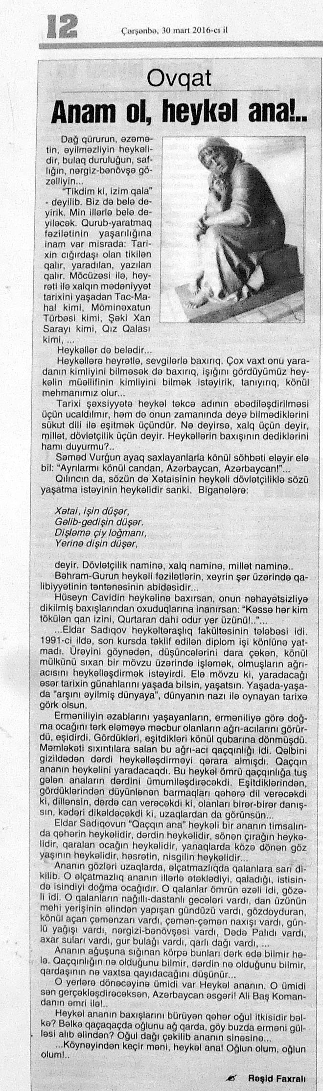 355. Faxralı, R. Anam ol, heykəl ana!...: [Eldar Sadıqovun “Qaçqın ana” heykəli haqqında] //İki sahil.- 2016.- 30 mart.- S.12. 356. Xəlilov, Z. Daşlara can verən Ləyaqət: [heykəltəraş Ləyaqət Məmmədovun yaradıcılığı haqqında] //Respublika.- 2016.- 30 mart.- S. 6.
