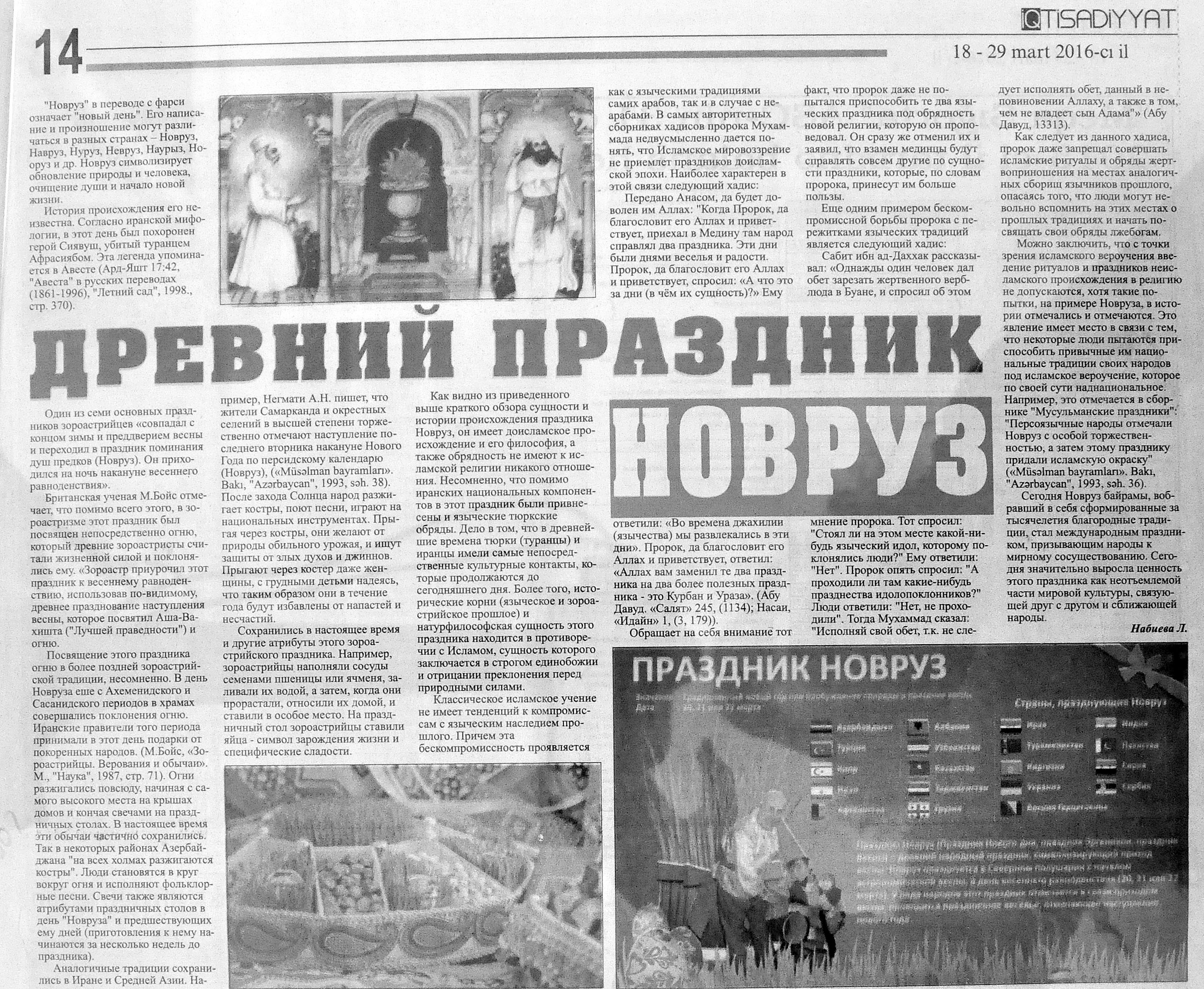 886. Алиев, И. Поздравление азербайджанскому народу по случаю праздника Новруз //Бакинский рабочий.- 2016.- 17 марта.- С. 1. 887. Алиев, И. Президент Ильхам Алиев принял участие в общенародном веселье по случаю Новруз байрамы: Речь Президента Ильхама Алиева//Бакинский рабочий.- 2016.- 20 марта.- С. 1-3. 888. Асадова, И. В Центре современного искусства YARAT состоялся концерт юных талантов Центра «Истедад», действующего при Управлении Культуры и Туризма города Баку //Эхо.- 2016.- 18 марта.- С. 8. 889. Асадова, И. Новруз приносит радость: В Баку проходят мероприятия, посвященные празднику и приходу Весны //Эхо.- 2016.- 17 марта.- С. 8. 890. Баннаева, Н. Торжество жизни: На азербайджанскую землю вновь пришел Новруз //Азербайджанские известия.- 2016.- 15 марта.- С. 4. 891. Баннаева, Н. Фейс-арт, келагаи и тильды: Средства, вырученные организаторами выставки «Новруз», направлены на благотворительные цели //Азербайджанские известия.- 2016.- 15 марта.- С. 4. 892. В АУЯ прошла выставка-продажа, посвященная празднику Новруз: [в Азербайджанском Университете Языков] //Бакинский рабочий.- 2016.- 19 марта.- С. 5. 893. В АУЯ состоялась концертная программа, посвященная Новруз байрамы //Бакинский рабочий.- 2016.- 17 марта.- С. 6. 894. В Баку наградили победителей конкурса «Весенние сюжеты»: [выставка любительской фотографии] //Бакинский рабочий.- 2016.- 20 марта.- С. 6. 895. В зале Генеральной Ассамблеи ООН состоялся концерт, организованный TÜRKSOY //Бакинский рабочий.- 2016.- 30 марта.- С. 5. 896. В Польше отмечен Новруз байрамы //Бакинский рабочий.- 2016.- 20 марта.- С. 4. 897. В Приморском национальном парке состоялись концерт и фейерверк по случаю Новруз байрамы //Бакинский рабочий.- 2016.- 20 марта.- С. 4. 898. «Горящие сердца» страны огней на празднике «Новруз»: В рамках международного фестиваля приедут гости из разных стран //Неделя.- 2016.- 11 марта.- С. 19. 899. Набиева, Л. Древний праздник Новруз //İqtisadiyyat.- 2016.- 18-29 марта.- С. 14. 900. Награждены победители конкурса, проведенного ФГПРСМИ по случаю Новруз байрамы //Бакинский рабочий.- 2016.- 18 марта.- С. 3. 901. «Новруз нахышы» в Баку //Бакинский рабочий.- 2016.- 20 марта.- С. 5.