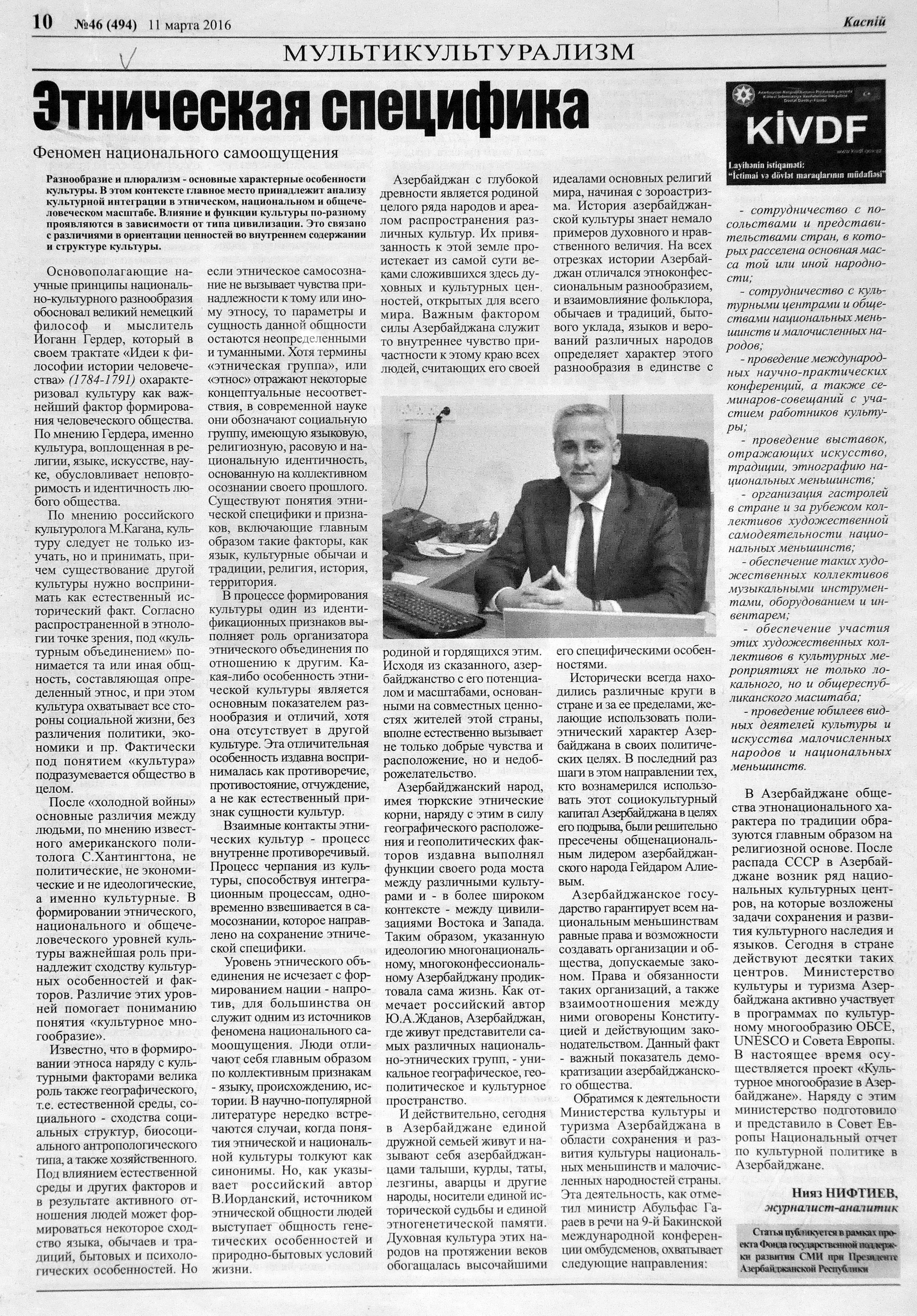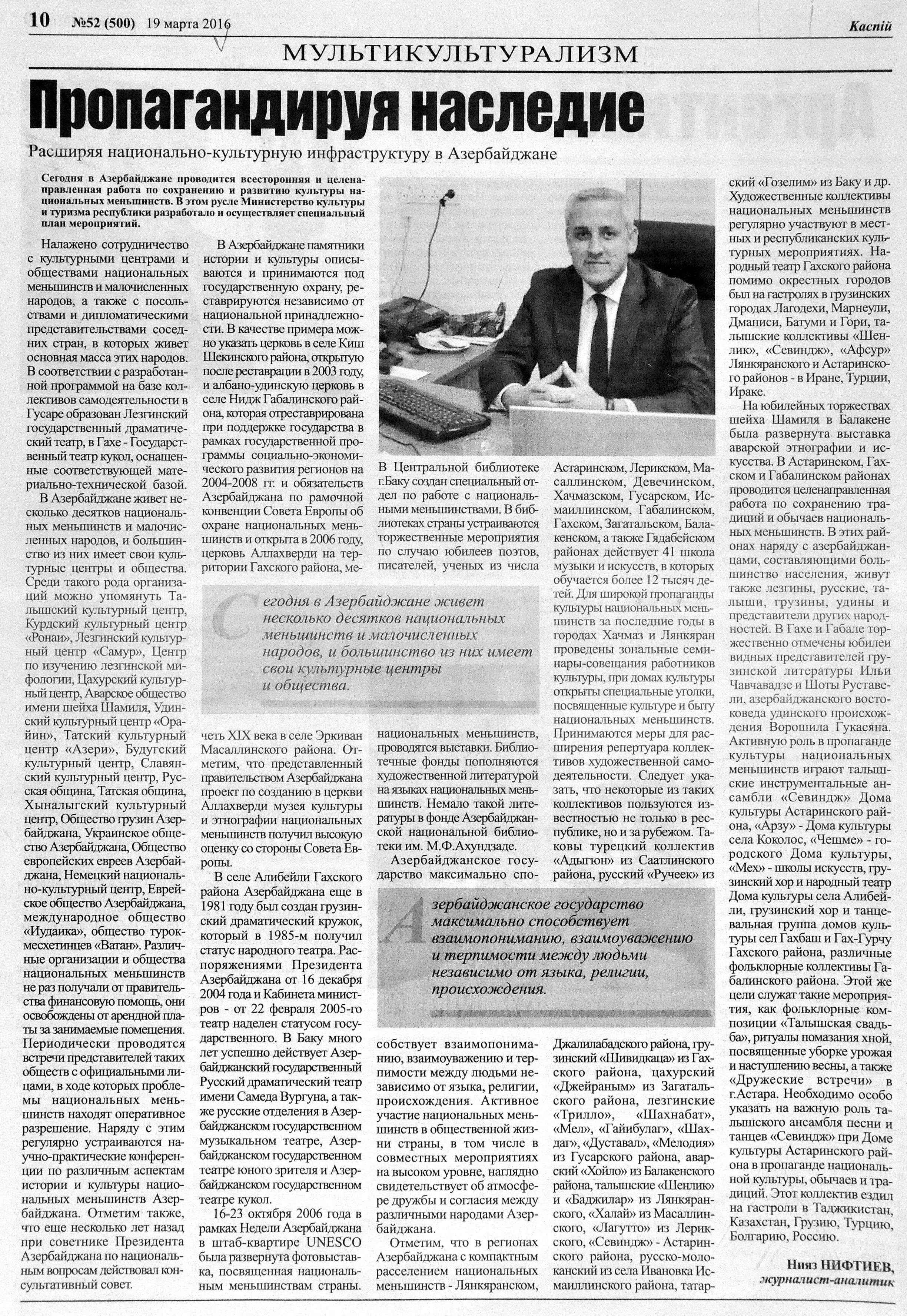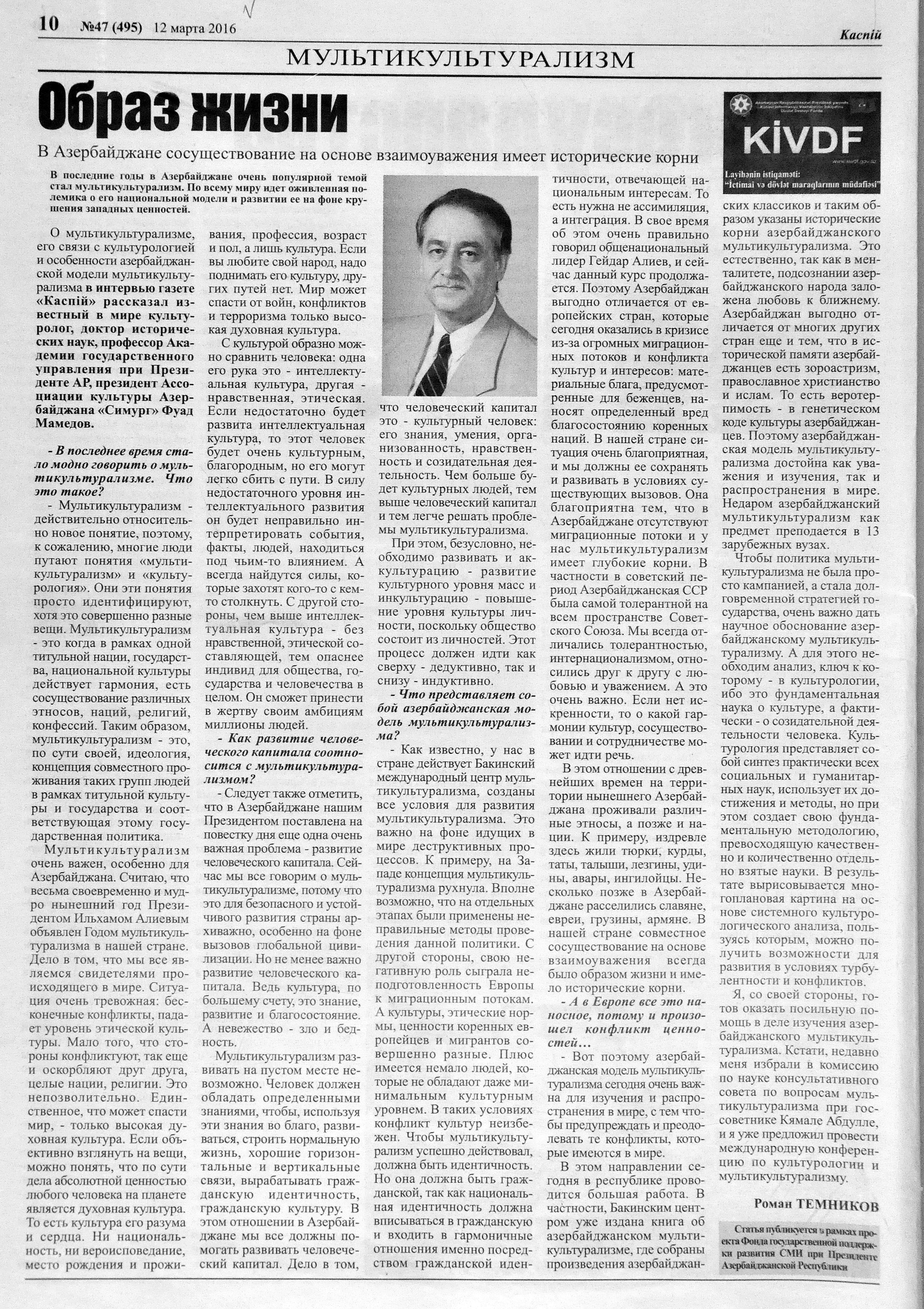 873. Абаскулиева, Э. В основе успеха - бесценный опыт: Президент Ильxам Aлиeв подписал распоряжение об утверждении плана мероприятий в связи с объявлением нынешнего года в нашей стране Годом мультикультурализма //Азербайджанские известия.- 2016.- 15 марта.- С. 1. 874. Азербайджан как оазис мультикультурализма //Бакинский рабочий.- 2016.- 15 марта.- С. 5. 875. Бакинский международный центр мультикультурализма провел Масленицу в Германии //Бакинский рабочий.- 2016.- 15 марта.- С. 5. 876. В штаб-квартире ООН состоялся симпозиум по проекту «Шелковый путь-2030» //Бакинский рабочий.- 2016.- 30 марта.- С. 2. 877. Караваев, А. Бренд мультивекторности: Почему азербайджанский опыт стал привлекательной темой для мировой политической элиты? //Азербайджанские известия.- 2016.- 17 марта.- С. 2. 878. Красовская, Н. Бренд «Азербайджанский мультикультурализм» в России //Бакинский рабочий.- 2016.- 12 марта.- С. 8. 879. Нифтиев, Н. Пропагандируя наследие: Расширяя национально-культурную инфраструктуру в Азербайджане //Каспiй.- 2016.- 12 марта.- С. 9. 880. Нифтиев, Н. Этническая специфика: Феномен национального самоощущения //Каспiй.- 2016.- 12 марта.- С. 9. 881. Образец азербайджанского мультикультурализма отчетливо виден в этнополитической панораме Габалы //Бакинский рабочий.- 2016.- 5 марта.- С. 3-4. 882. Состоялась презентация книги «Литературно-художественные источники мультикультурализма Азербайджана» //Бакинский рабочий.- 2016.- 3 марта.- С. 2. 883. Состоялось обсуждение исполнения утвержденного Президентом Азербайджана Плана мероприятий в связи с «Годом мультикультурализма» //Бакинский рабочий.- 2016.- 19 марта.- С. 3. 884. Состоялась презентация книги «Литературно-художественные источники мультикультурализма Азербайджана» //Бакинский рабочий.- 2016.- 3 марта.- С. 2. 885. Темников, Р. Образ жизни: В Азербайджане сосуществование на основе взаимоуважения имеет исторические корни //Каспiй.- 2016.- 12 марта.- С. 9.