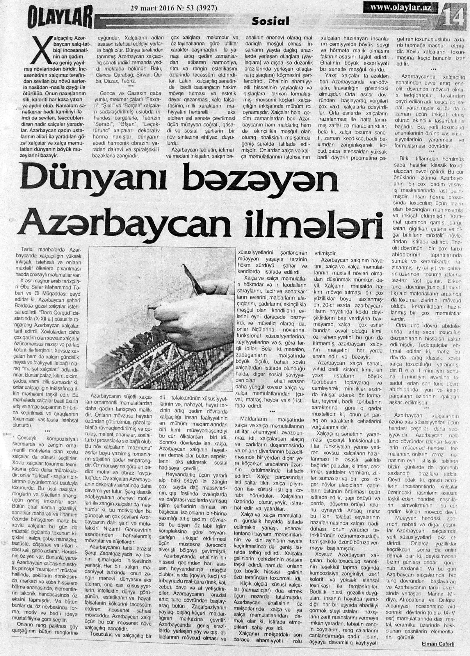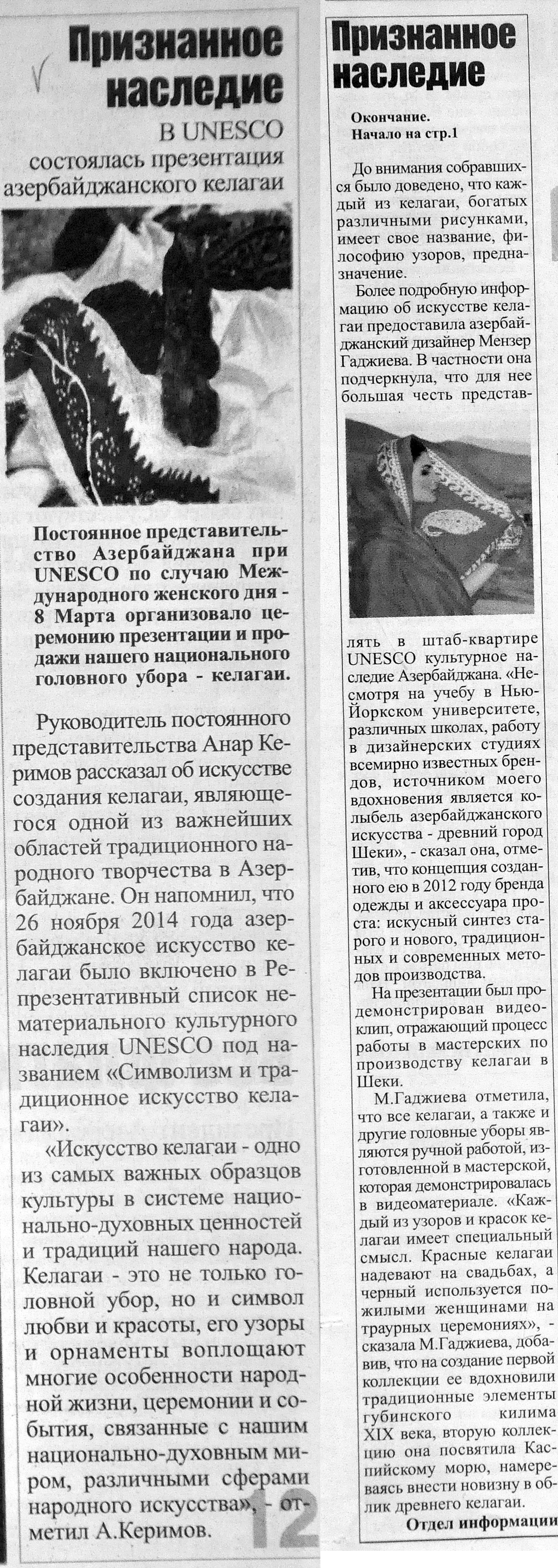 931. В Париже организован бутик азербайджанского келагаи //Бакинский рабочий.- 2016.- 8 марта.- С. 7. 932. Мамедов, Т. Дуэт-симпозиум: Мир-Теймур Мамедов: В нашей стране, которая импортировала глину, нет музея керамики!: [беседа с художником-керамистом] /провела В.Третьякова //Каспiй.- 2016.- 12 марта.- С. 18. 933. Признанное наследие: В UNESCO состоялась презентация азербайджанского келагаи //Каспiй.- 2016.- 10 марта.- С. 1, 12.