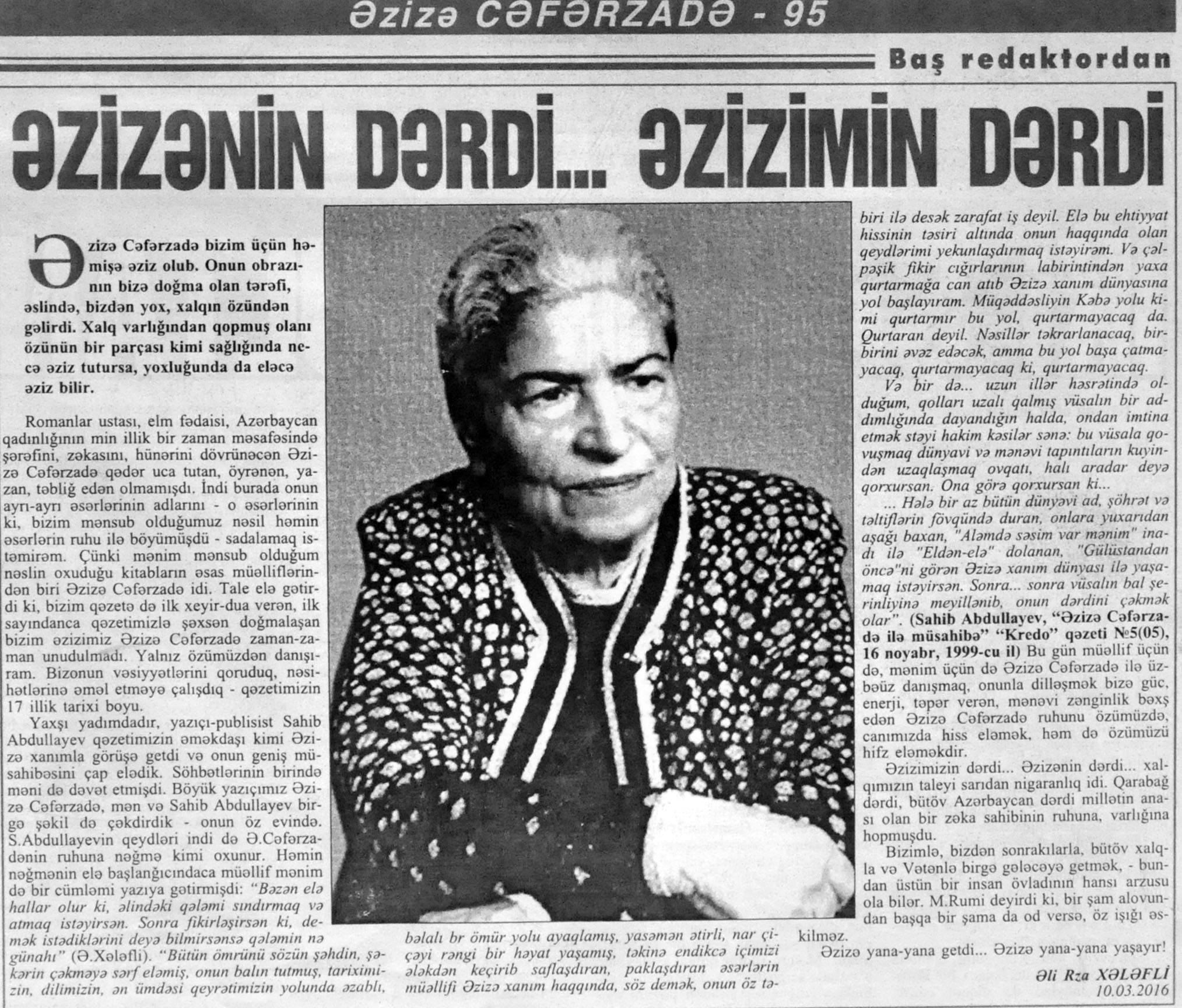 997. Алиева, Э. Она была творцом: Гюльрух Алибейли – ученый, публицист и… великий романтик //Каспiй.- 2016.-12 марта.- С.12-13. 998. Анар. О времени и о себе: Анар: Хочется воплотить все свои замыслы, а их у меня немало: [беседа с Народным писателем] /провела Р.Аббасова //Каспiй.- 2016.-12 марта.- С.12-13. 999. Асадова, И. Встреча с Ильхамом Бадалбейли состоялась в Союзе Писателей Азербайджана //Эхо.- 2016.-18 марта.- С.8. 1000. Асадова И. «Гольфстрим» Натика Расулзаде: Роман вышел отдельным изданием //Эхо.- 2016.-10 марта.- С.8. 1001. Ахундова, Э. Кардиограмма Натика Расулзаде: Роман «Гольфстрим» известного азербайджанского прозаика увидел свет в журнальном варианте //Каспiй.- 2016.-19 марта.- С.16. 1002. Бахшалиева, Г. Гимн женской красоте: Умозаключения человека, умудренного величайшими достижениями человеческого Разума и Восприятия: [о книге стихов «Слово о красоте женской» доктора технических наук Арифа Кулиева] //Каспiй.- 2016.-8 марта.- С.8. 1003. Микеладзе, Г. Скажи мне, кто твой герой…: Профессор Рафик Аскеров пишет книги об искусстве любить людей: [художественная проза «Люди вокруг нас и мы среди людей» профессора Медуниверситета] //Каспiй.- 2016.-15 марта.- С.11-12.