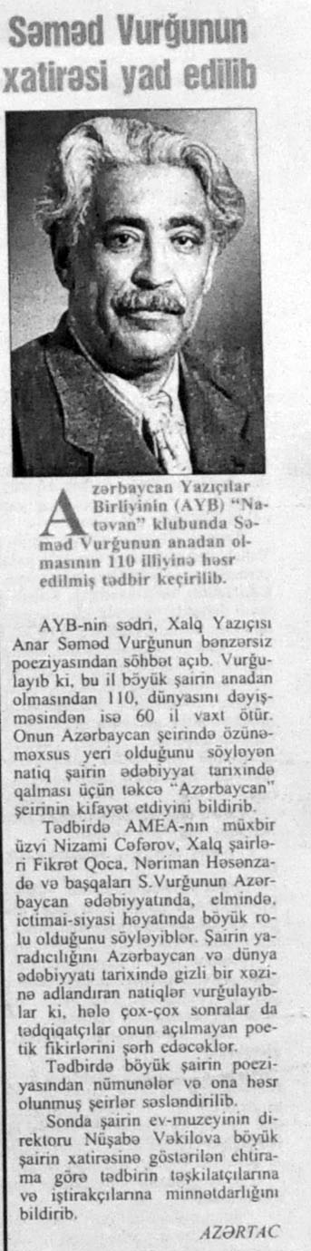 796. Bayramov, A. Molla Pənah Vaqif və “Vaqif” pyesi: Səməd Vurğun – 110 //Mədəniyyət.- 2016.- 16 mart.- S. 12-13. 797. Xasiyev, H. Şairi el yaşadır: Böyük söz ustadının Qusar görüşləri haqqında //Mədəniyyət.- 2016.- 8 mart.- S. 12. 798. Kitabxanalarda Səməd Vurğunun 110 illiyi qeyd olunub //Mədəniyyət.- 2016.- 30 mart.- S. 11. 799. Ölməz şairin xatirəsinə ehtiram //Mədəniyyət.- 2016.- 18 mart.- S.13. 800. Rasimoğlu, M. Bölgələrdə Vurğun təntənələri //525-ci qəzet.- 2016.- 30 mart.- S.4. 801. Salmansoy, A. Səməd Vurğuna qarşı toplanmış “İki qovluq donos”un aqibəti... //Ədəbiyyat qəzeti.- 2016.- 12 mart.- S.6-7. 802. Səməd Vurğunun xatirəsi yad edildi: [AYB-də] //Kredo.- 2016.- 31 mart.- S.16. 803. Şəfa, Ş. Azərbaycan poeziyasının Vurğunu: [AYB-də şairin yubileyinin qeyd olunması haqqında] //Ədalət.- 2016.- 30 mart.- S.4. 804. Şükürlü, M. “...Bir əbədi sənəti var!”: Yazıçılar Birliyində Səməd Vurğun anılıb //525-ci qəzet.- 2016.- 30 mart.- S.4.