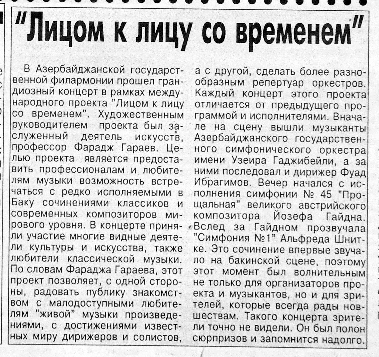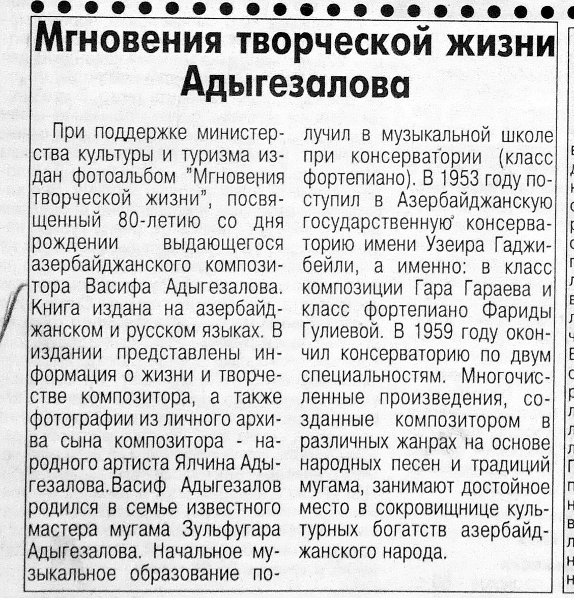 939. Агаев, Н. Музыка, полная радости: Сочинения Закира Багирова были отражением его собственного характера — мягкого, доброжелательного, жизнерадостного //Азербайджанские известия.- 2016.- 19 марта.- С. 3. 940. Гараев, Ф. Фарадж Гараев, композитор: «Музыканты в театре одновременно и актеры» //Азербайджанские известия.- 2016.- 5 марта.- С. 3. 941. Дадашева, Н. Самородок из Шуши: К 100-летию со дня рождения композитора Закира Багирова //Каспiй.- 2016.- 16 марта.- С. 11-12. 942. «Лицом к лицу со временем»: [о музыкальном проекте Фараджа Гараева] //Неделя.- 2016.- 11 марта.- С. 19. 943. Мгновения творческой жизни Адыгезалова: [об одноименном фотоальбоме к 80-летию композитора] //Неделя.- 2016.- 11 марта.- С. 19. 944. «Слово Кыргызстана» опубликовала статью, посвященную 130-летнему юбилею Узеира Гаджибейли //Бакинский рабочий.- 2016.- 30 марта.- С. 6. 945. Султанова, А. Ася Султанова, композитор: «Я не представляю своего дня без игры на рояле» /провела беседу Р.Асланова //Азербайджанские известия.- 2016.- 19 марта.- С. 1, 3. 946. Ханджанбекова, Ф. Ее родиной был Азербайджан: [памяти И.Г. Плям — старейшего педагога БМА, пианиста, просветителя] //Бакинский рабочий.- 2016.- 3 марта.- С. 3. 947. Юсифов, А. Многоликая скрипка: Анар Юсифов: Мечтаю познакомить бакинскую публику со своим новым проектом: [беседа с скрипачом-виртуозом] /провела А.Бабкина //Каспiй.- 2016.-5 марта.- С.18.