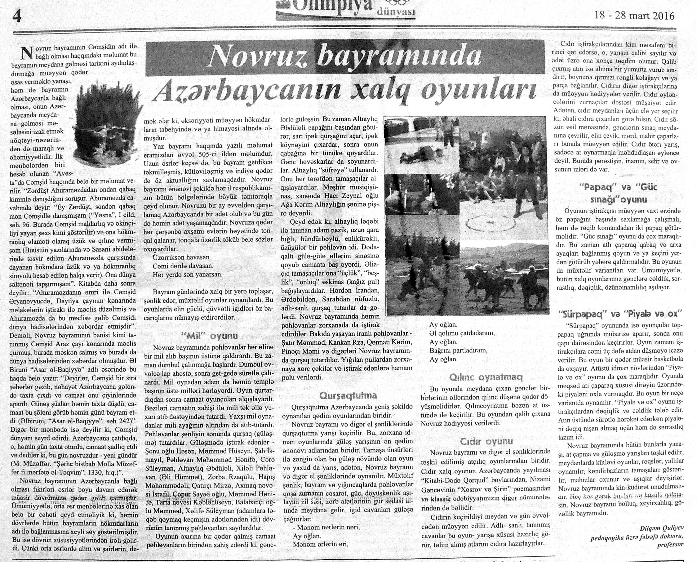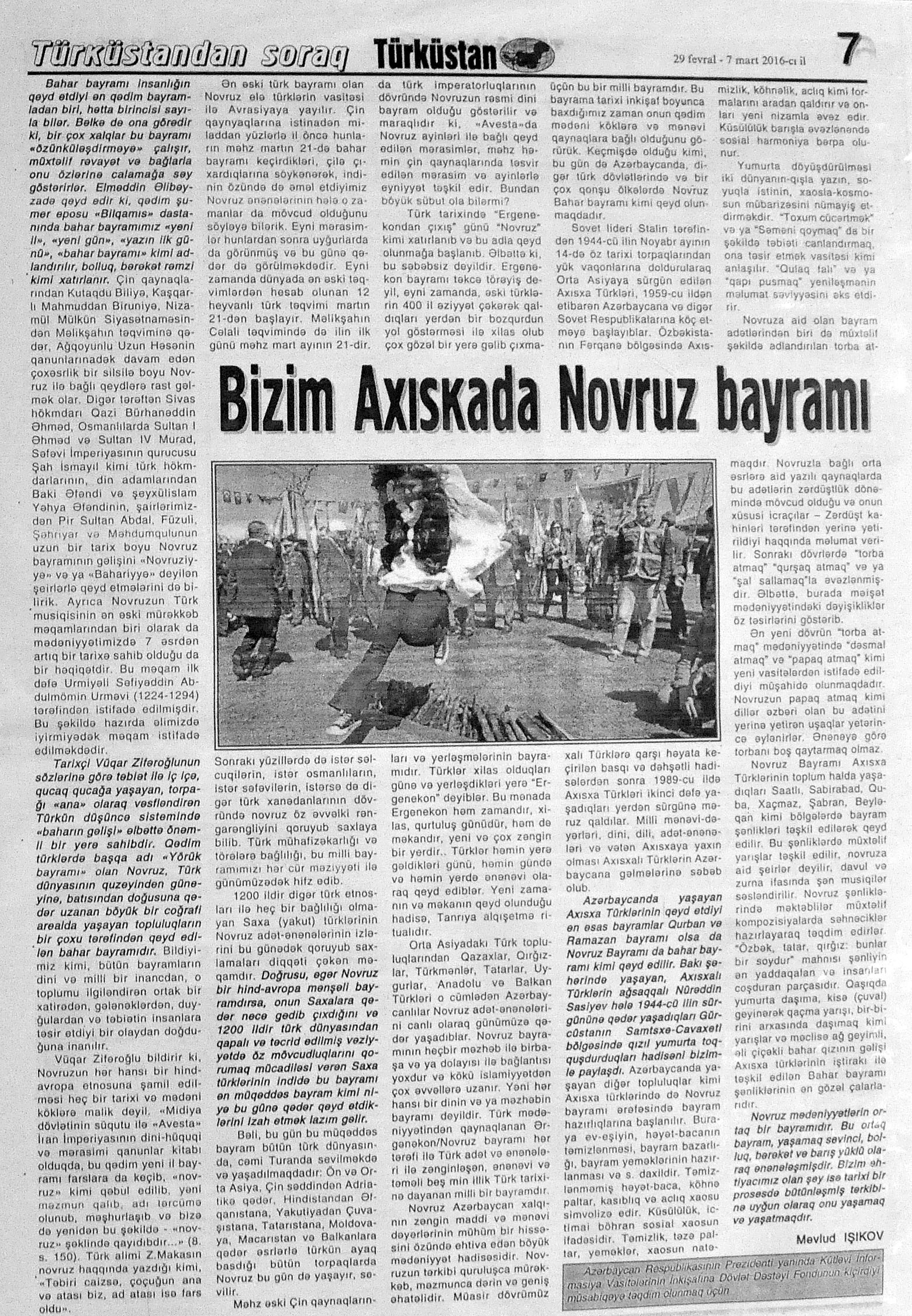167. Ağsuda “Tərəkəmə çərşənbəsi” folklor festivalı: [rayonun Gəgəli kəndində] //Mədəniyyət.- 2016.- 16 mart.- S. 2. 168. Albalıyev, Ş. Axır çərşənbə //Xalq cəbhəsi.- 2016.- 15 mart.- S. 14. 169. Albalıyev, Ş. “Kosa-kosa” tamaşası //Xalq cəbhəsi.- 2016.- 19 mart.- S. 14. 170. Albalıyev, Ş. Yel çərşənbəsi //Xalq cəbhəsi.- 2016. - 8 mart. - S. 14. 171. Amerikada Novruz təqdimatı: TÜRKSOY-un dəstəyi ilə Vaşinqtonda qala-gecə keçirilib //Mədəniyyət.- 2016.- 16 mart.- S. 16. 172. Atalı, İ. Azərbaycan Novruzu və ulusal ruhumuz //Türküstan.- 2016.- 15-28 mart.- S.13. 173. Azərbaycanın birinci xanımı Mehriban Əliyeva diplomatik missiya rəhbərlərinin həyat yoldaşları ilə görüşüb //Respublika.- 2016.- 18 mart.- S.3 174. Azəri, L. Türkiyədən Azərbaycana bayram təbriki: Novruz festivalı Gəncə, Tovuz, Şəki, Bakı və Naxçıvanda reallaşıb //Mədəniyyət.- 2016.- 30 mart.- S. 5. 175. Babayeva, G. Novruz bayramı “Molla Nəsrəddin” jurnalının səhifələrində //525-ci qəzet.- 2016. - 5 mart. - S. 22. 176. Bakıda “Novruz naxışı”: [“Naxış” atelyesinin hazırladığı yaz-yay moda kolleksiyası haqqında] //Azərbaycan.- 2016.- 20 mart.- S.11; Xalq qəzeti.- 2016.- 20 mart.- S.6. 177. Bəxtiyar, N. Çillə, çərşənbələr və Novruz bayramı...: Qış nağılı... //Kredo.- 2016.- 26 fevral.- S.6. 178. Bəxtiyar, N. Qış nağılı...: Çillə, çərşənbələr və Novruz bayramı... //Ədalət.- 2016.- 19 mart.- S.13. 179. Bəxtiyar, N. Laçının qış nağılı: Çillə, çərşənbələr və Novruz bayramı ənənələri //Xalq qəzeti.- 2016.- 15 mart.- S.6. 180. Bəydili, C. Yaz bayramı Tanrıya ibadətdir... //Ədəbiyyat qəzeti.- 2016.- 12 mart.- S.3. 181. Bilman. Novruz bayramı adət-ənənələrin zənginliyi ilə seçilir //Azad Azərbaycan.- 2016. - 19 mart. - S.5. 182. Bölgələrdə Novruz təntənəsi //Mədəniyyət.- 2016.- 18 mart.- S. 7. 183. Cəfərli, R. Xalqımızın əziz və uca tutduğu bayram: Prezident İlham Əliyev: “Zəngin mənəviyyatımız və düşüncə dünyamız, yüksək əxlaqi keyfiyyətlərimiz və həyata nikbin baxışımız Novruz mərasimlərimizdə bütün rəngarəngliyi ilə dolğun təcəssümünü tapmışdır” //Azərbaycan.- 2016.- 20 mart.- S.4. 184. Cəlalqızı, İ. Qazax bölgəsində Novruz adət-ənənələri //Xalq cəbhəsi.- 2016. - 18 mart. - S. 13-14. 185. Cəlaloğlu, E. Bursa – Bir dünya gözəli: Gözlərdəki məmnunluq şehi: [Türkiyədə bayram münasibətilə keçirilən “Mədəniyyət qurultayı” haqqında] //Olaylar.- 2016.- 29 mart.- S.10. 186. Dirili, Y. Bəyaz çiçəyim, ilk yaz çiçəyim... //Xalq cəbhəsi.- 2016. - 11 mart. - S. 14. 187. Dövlətqaçqınkomda Novruz bayramı ilə bağlı tədbir keçirilib //Yeni Azərbaycan.- 2016.- 18 mart.- S.8. 188. Əlifoğlu, Ş. Multikulturallığın ənənəvi nümunəsi: Novruz bayramı //Azərbaycan.- 2016.- 15mart.- S.7. 189. Əliyev, A. Baldan şirin Novruz: [Şabran rayonunda yaşayan tatların Novruz ənənələri haqqında] //Azərbaycan.- 2016.- 20 mart.- S. 9. 190. Əliyev, Z. Novruz rəngləri: “Ədəbiyyat qəzeti”nin gözəl sənətlər ensiklopediyası //Ədəbiyyat qəzeti.- 2016.- 19 mart.- S.19. 191. Əliyeva, H. Birlik və gözəllik bayramı //Azərbaycan.- 2016. - 6 mart.- S. 8. 192. Hadıyev, E. Xalqları, millətləri birləşdirən multikultural bayram: Azərbaycanda yaşayan bütün xalqlar Novruzu böyük sevgi ilə qeyd edirlər: [Suraxanı rayonu ərazisində yaşayan rusların bayram sevinci haqqında] //Azərbaycan.- 2016.- 18 mart.- S.9. 193. Hüseynov, F. Qoruqlarda Novruz tədbirləri //Mədəniyyət.- 2016.- 18 mart.- S. 3. 194. İbrahimova, A. Minilliklərdən gələn mübarək Novruz: Bu bayram Bakıda möhtəşəm təntənəsi və özünəməxsusluğu ilə seçilib //Kaspi.- 2016.- 15 mart.- S.15. 195. “İlaxır çərşənbə” Novruzun müjdəsini gətirdi //Mədəniyyət.- 2016.- 16 mart.- S. 2. 196. İşıkov, M. Bizim Axıskada Novruz bayramı // Türküstan.- 2016.- 29 fevral-7 mart.- S.7. 197. Fariz. Sosial müdafiəyə ehtiyacı olan uşaqlar üçün bayram şənliyi: [Gənclər və İdman Nazirliyinin təşkilatçılığı ilə] //Mədəniyyət.- 2016.- 16 mart.- S. 4. 198. Hüseynov, F. Novruz bayramı ümumxalq şənliyi ilə qeyd olunacaq //Mədəniyyət.- 2016.- 18 mart.- S. 8. 199. Hüseynov, F. Novruz tətilində istirahət: harada və neçəyə? //Mədəniyyət.- 2016.- 16 mart.- S. 9. 200. Xalça Muzeyində “Bahar ilmələri”: [musiqili bədii-əyləncəli proqramın təqdim olunması haqqında] //Mədəniyyət.- 2016.- 16 mart.- S. 2. 201. Xəlilzadə, F. Yurd sevgisinin qanadları //Kaspi.- 2016.- 15 mart.- S.13. 202. “İlaxır çərşənbə” Novruzun müjdəsini gətirdi //Mədəniyyət.- 2016.- 16 mart.- S. 2. 203. “İlaxır çərşənbə” təntənəli şəkildə qeyd edilib: [Mərkəzi Parkda] //Palitra.- 2016.- 16 mart.- S.16. 204. İlaxır çərşənbə - torpağın diriliş günü... //Bakı xəbər.- 2016.- 15 mart.- S.15 205. Kaseinov, D. Novruz təntənəsi okeanın o tayından duyulacaq: TÜRKSOY bu il də bayramla bağlı geniş tədbirlər proqramı hazırlayıb: [qurumun Baş katibi Düsen Kaseinovla söhbət] /söhbəti apardı Mehparə Sultanova //Mədəniyyət.- 2016.- 11 mart.- S. 6. 206. Qafqaz Müsəlmanları İdarəsinin sədri Novruz bayramı münasibətilə Azərbaycan xalqını təbrik edib //Azərbaycan.- 2016.- 18 mart.- S. 5. 207. Qasımlı, M. “Oğru çərşənbələr”, “Doğru çərşənbələr...” //Azərbaycan.- 2016.- 19 mart.- S.11. 208. Qasımova, S. Novruz bayramı milli-mənəvi ənənə kimi: II yazı // Xalq cəbhəsi.- 2016. - 1 mart. - S. 14. 209. Qasımova, S. Novruz barış, harmoniya, sabitlik yaradan bayramdır: IV yazı //Xalq cəbhəsi.- 2016. - 3 mart. - S.14. 210. Qasımova, S. Novruz bayramı milli-mənəvi ənənə kimi
