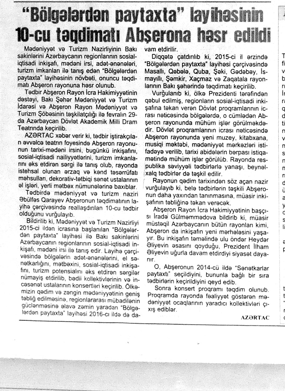 16. Abbasov, S. Səmərqənddən Qəbələyə dost səfəri: [Daşkənddəki Azərbaycan səfirliyinin nəzdində fəaliyyət göstərən Heydər Əliyev adına Azərbaycan Mədəniyyət Mərkəzinin rəhbəri Samir Abbasovla müsahibə] /müsahibəni apardı Gülcahan Mirməmməd //Mədəniyyət.- 2016.- 2 mart.- S. 6. 17. Azərbaycan və Gürcüstan nazirlikləri arasında işçi qrupun ilk iclası keçirilib: Qonşu ölkədəki Azərbaycan mədəniyyətinə aid abidə və muzeylərin bərpa və mühafizəsi müzakirə edilib: [Mədəniyyət və Turizm naziri Əbülfəs Qarayevin Gürcüstanın Mədəniyyət və Abidələrin Mühafizəsi nazirinin müavini Levan Xaratişvilinin başçılıq etdiyi nümayəndə heyəti ilə görüşü haqqında] //Mədəniyyət.- 2016.- 18 mart.- S. 5. 18. Bakı rayonlarının məktəbliləri “Ölkəmizi tanıyaq” tur-aksiyası çərçivəsində Naxçıvana yola düşüblər //Yeni Azərbay-can.- 2016.- 29 mart.- S.5. 19. Bakı Şəhər Mədəniyyət və Turizm İdarəsinin yeni loqosu //Mədəniyyət.- 2016.- 8 mart.- S. 5. 20. Çexiyalı qonaqlar İçərişəhərlə tanış olub //Azərbaycan.- 2016.- 15 mart.- S. 3. 21. Əbülfəs Qarayev: “İslahatlar işçilərin ixtisarına səbəb olmayacaq”: Mədəniyyət və Turizm naziri Salyanda vətəndaşları qəbul edib //525-ci qəzet.- 2016.- 31 mart.- S.7. 22. Əli. “Lap qədimlərdən müxtəlif mədəniyyətlərin və dinlərin formalaşdığı Azərbaycan...”!: Məhəbbət Paşayeva: “Spesifik, müxtəlif və zəngin mədəni irsə malikdir” //Xalq cəbhəsi.- 2016- 16 mart.- S.9. 23. Fariz. Mədəniyyət sektorunun idarə olunmasının modernləşdirilməsi: Avropa İttifaqı ilə birgə yeni Tvinninq layihəsinə start verildi : [“Holiday İnn Baku” hotelində Mədəniyyət və Turizm naziri Əbülfəs Qarayevin iştirakı ilə] //Mədəniyyət.- 2016.- 16 mart.- S. 3. 24. Fariz. Tvinninq layihəsi ilə bağlı işçi qrupun ilk iclası: //Mədəniyyət.- 2016.- 2 mart.- S. 3. 25. Gənc mədəniyyət işçiləri növbəti dəfə Salyanda toplanıb // Mədəniyyət.- 2016.- 30 mart.- S. 4. 26. Hüseynoğlu, S. “Ölkəmizi tanıyaq” tur-aksiyası davam edir //Xalq qəzeti.- 2016.- 18 mart.- S.5. 27. Hüseynov, F. “Bölgələrdən paytaxta” layihəsi davam edir: 2016-cı ilin ilk təqdimat ünvanı Abşeron rayonu idi: [Akademik Milli Dram Teatrında keçirilən tədbirdə Mədəniyyət və Turizm naziri Əbülfəs Qarayev çıxış edib] //Mədəniyyət.- 2016.- 2 mart.- S. 3. 28. Hüseynov, F. “Bölgələrdən paytaxta” layihəsinin 10-cu təqdimatı Abşerona həsr edıldi //Respublika.- 2016.- 4 mart.- S.6. 29. Hüseynov, F. Kulinarlarımız iki beynəlxalq yarışmadan 25 medalla qayıdıblar: [“Trend” mətbuat mərkəzində Azərbaycan Milli Kulinariya Mərkəzinin İstanbulda keçirilən Beynəlxalq Mətbəx Günləri və Malta Beynəlxalq Kulinariya Çempionatında iştirakına həsr olunmuş mətbuat konfransı haqqında] //Mədəniyyət.- 2016.- 2 mart.- S. 8. 30. İSESCO üzrə Azərbaycan Respublikası Milli Komissiyasının Katibliyi yaradılıb //Mədəniyyət.- 2016.- 11 mart.- S. 4. 31. Lalə. Yaradıcı əməyə və səmərəli fəaliyyətə verilən qiymət: [Muzey Mərkəzində mədəniyyət və incəsənət xadimlərinə mükafatların təqdim olunması mərasimində Mədəniyyət və Turizm naziri Əbülfəs Qarayevin çıxışı haqqında] //Mədəniyyət.- 2016.- 2 mart.- S.2. 32. “Mədəniyyət.az” jurnalının növbəti sayı işıq üzü görüb //Mədəniyyət.- 2016.- 30 mart.- S.10. 33. Mədəniyyət və turizm naziri BMT Radiosuna müsahibə verib: “Sivilizasiyalar Alyansının Bakıda keçiriləcək Qlobal Forumu dünyada baş verən prosesləri qiymətləndirmək üçün daha bir imkandır” [Bakıda keçiriləcək VII Qlobal Forumuna hazırlıq işləri barədə forumun Təşkilat Komitəsinin sədri, Mədəniyyət və Turizm naziri Əbülfəs Qarayevin müsahibəsindən] //Mədəniyyət.- 2016.- 4 mart.- S. 3. 34. Mədəniyyət və turizm naziri Salyanda vətəndaşları qəbul edib //Azərbaycan.- 2016.- 31 mart.- S.3; Respublika.- 2016.- 31 mart.- S.3. 35. Mədəniyyət və Turizm Nazirliyində Polşa səfiri ilə görüş: [nazirin müavini Sevda Məmmədəliyevanın Polşanın Azərbaycandakı səfiri Marek Tsalka ilə görüşü haqqında] //Mədəniyyət.- 2016.- 4 mart.- S. 4. 36. Mədəniyyətin inkişafı və təbliğində QHT sektorunun rolu: [Lənkəran Şəhər Mədəniyyət Mərkəzində eyniadlı mövzuda zona görüşünün keçirilməsi haqqında] //Mədəniyyət.- 2016.- 2 mart.- S. 3. 37. Məktəblilər ölkəyə səfərdən zəngin təəssüratla ayrılıblar: [bölgələrdə tur-aksiya çərçivəsində keçirilən tədbirlər haqqında] //Azərbaycan.- 2016.- 20 mart.- S.5. 38. Mirməmməd, G. Mədəniyyətin inkişafı və təbliğində gənclərin rolu: Seminar iştirakçılarına Elmi-Metodik Mərkəzin saytı təqdim edildi: [Azərbaycan Dövlət Mədəniyyət və İncəsənət Universitetinin “Səda” tədris teatrında] //Mədəniyyət.- 2016.- 16 mart.- S. 3. 39. Muradova, Z. “Gəncə – Avropanın Gənclər Paytaxtı 2016” layihəsinin başlanğıc tədbiri keçirilib //525-ci qəzet.- 2016.- 31 mart.- S.2. 40. “Müasir mədəniyyətşünaslıq” jurnalının fəaliyyət istiqamətləri müzakirə olunub: [Mədəniyyətşünaslıq üzrə Elmi-Metodik Mərkəzin rəhbər heyətinin iştirakı ilə keçirilən iclas haqqında] //Mədəniyyət.- 2016.- 2 mart.- S. 5. 41. Ölkəmizi tanıyaq: [bölgələrdə tur-aksiya çərçivəsində keçirilən tədbirlər haqqında] //Azərbaycan.- 2016.- 17 mart.- S.7. 42. “Ölkəmizi tanıyaq” aksiyasının növbəti mərhələsi başa çatıb //Mədəniyyət.- 2016.- 30 mart. - S. 8. 43. “Ölkəmizi tanıyaq” layihəsi uğurla davam edir //Xalq qəzeti.- 2016.- 29 mart.- S.5. 44. “Ölkəmizi tanıyaq” turlarının növbəti mərhələsi
